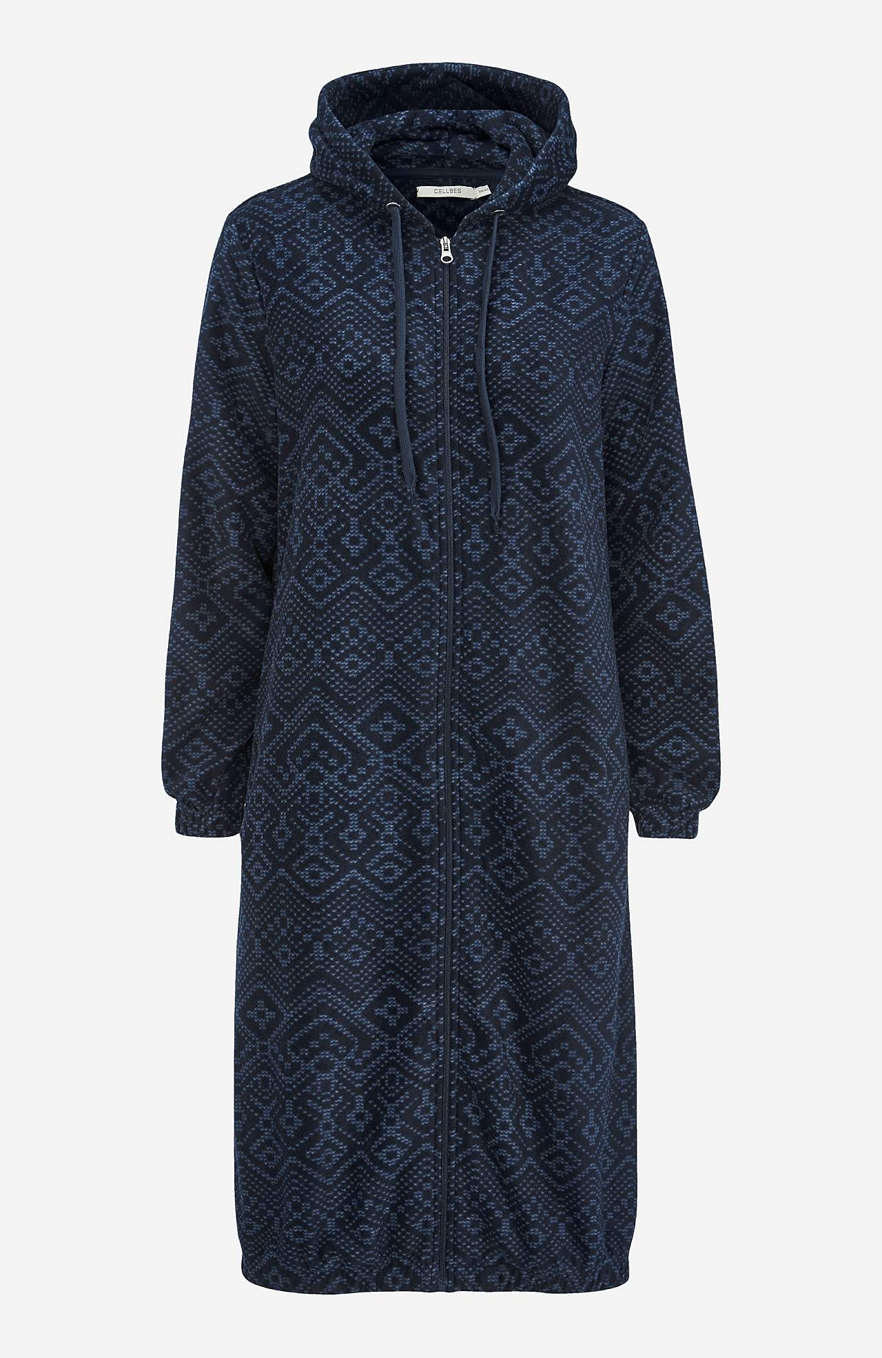 Comfortable robe in soft fleece. Long zip. Hood with drawstring. Long sleeves with elastic at sleeve end. Pockets at the side. Elastic at the bottom hem. The length varies with size: about 108-119 cm from the shoulder.