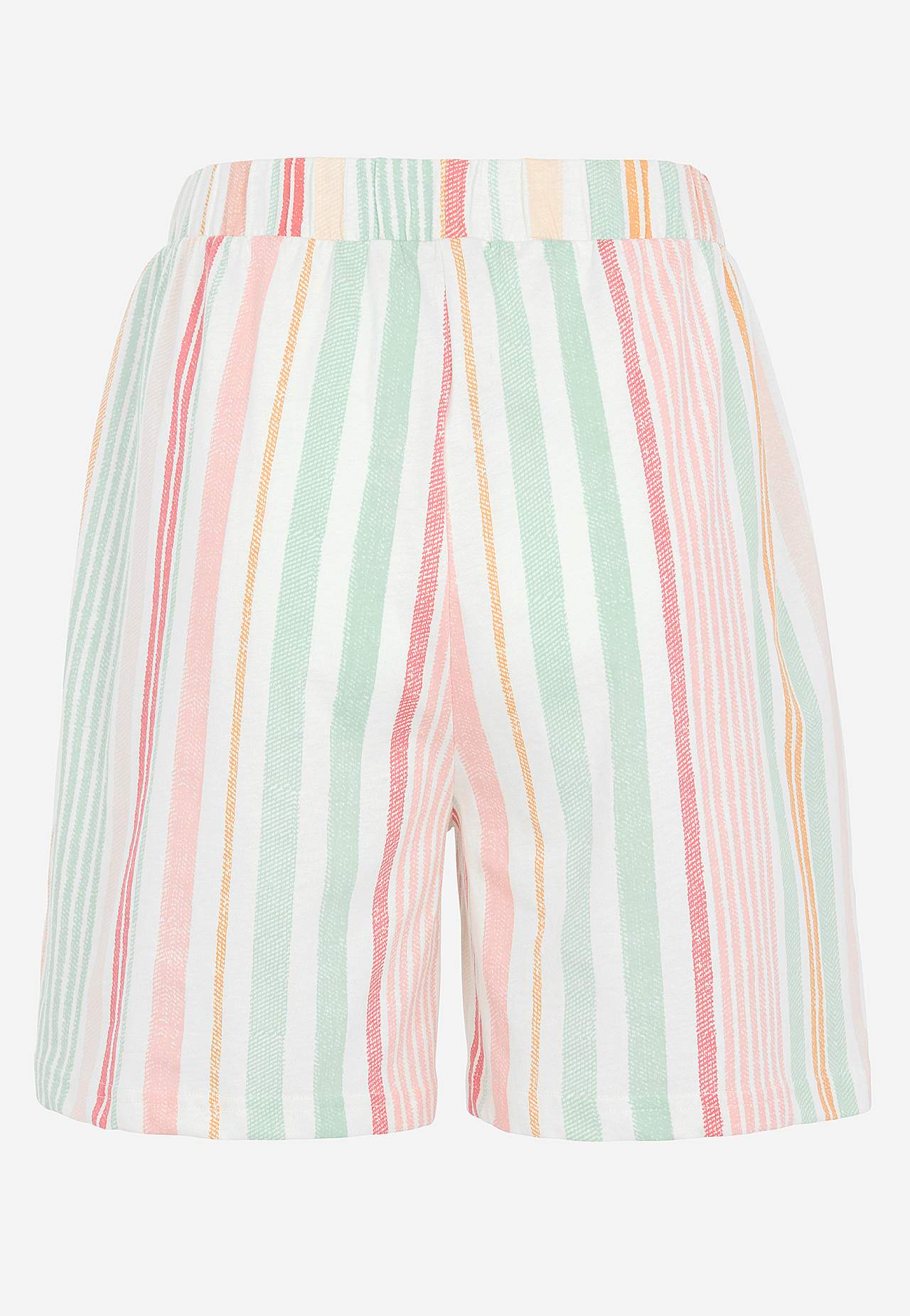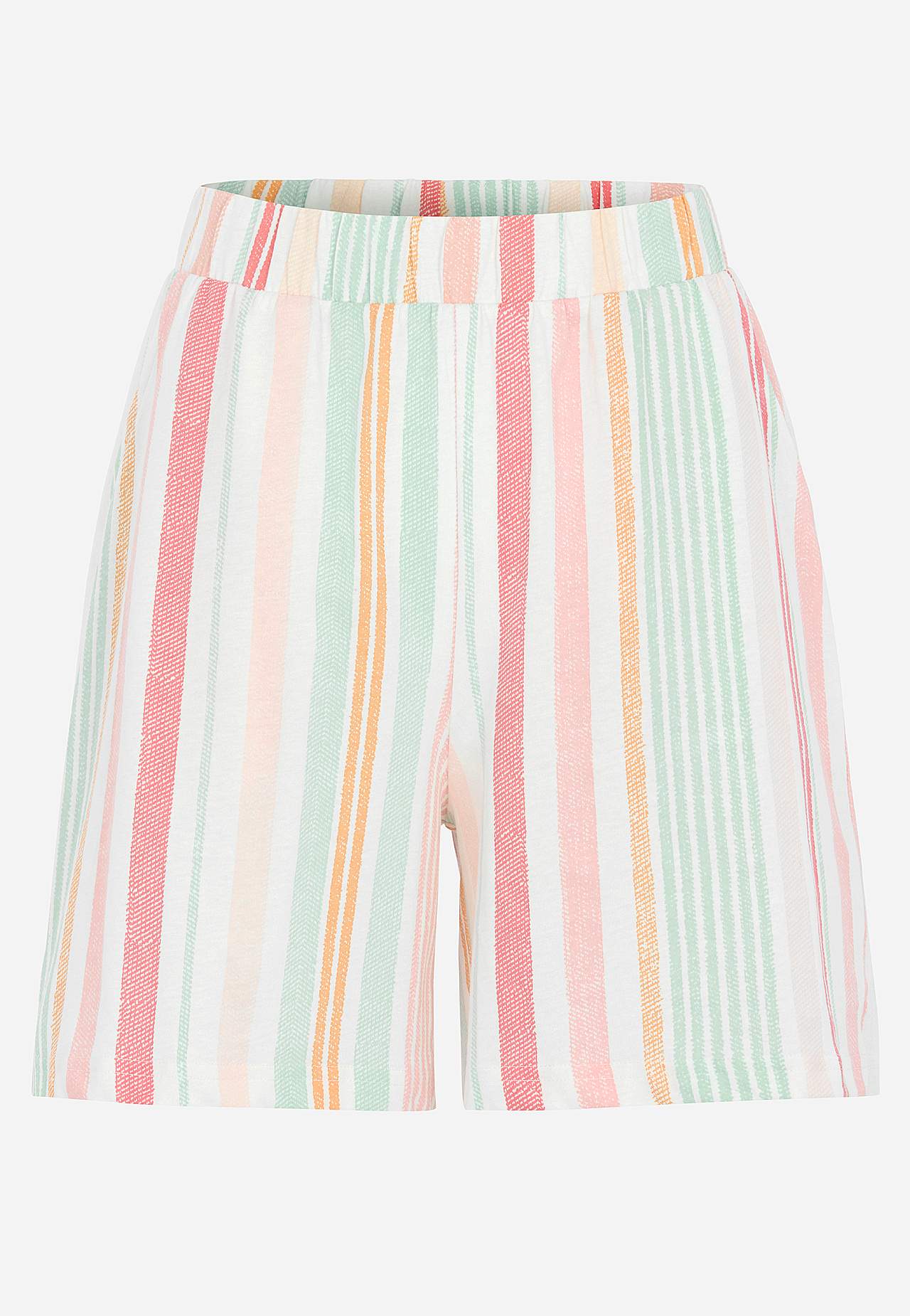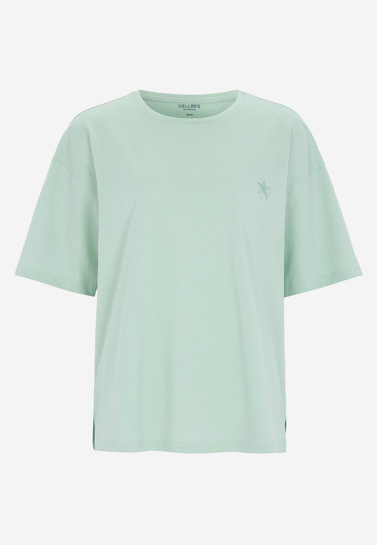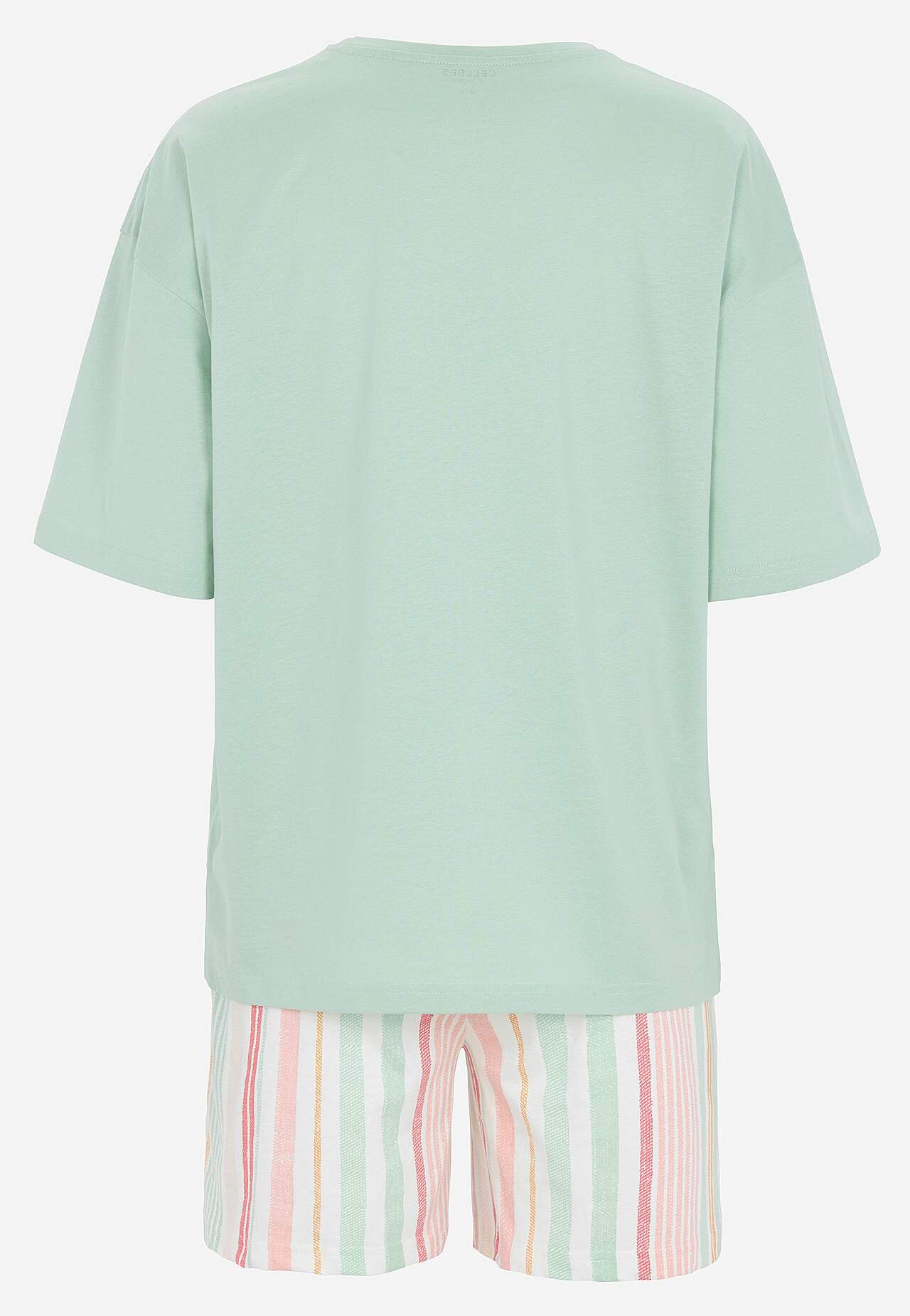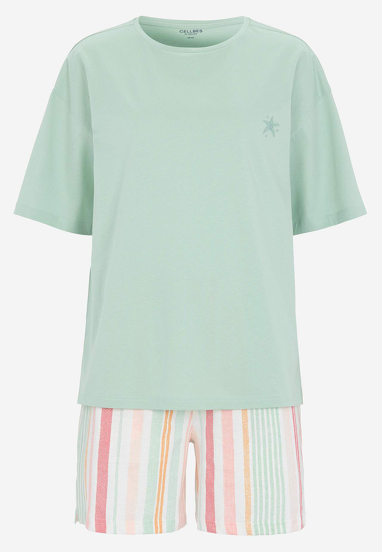 Pyjama set with short sleeve top and shorts. Soft, organic cotton. Regular fit. Upper: T-shirt with gently dropped shoulder shoulder. Small, in the same shade embroidery detail on the left side. Short sleeves. Straight hem with slit at the sides. The back length varies with size: approx. 63-73 cm. Bottom part: Shorts with w... Read more