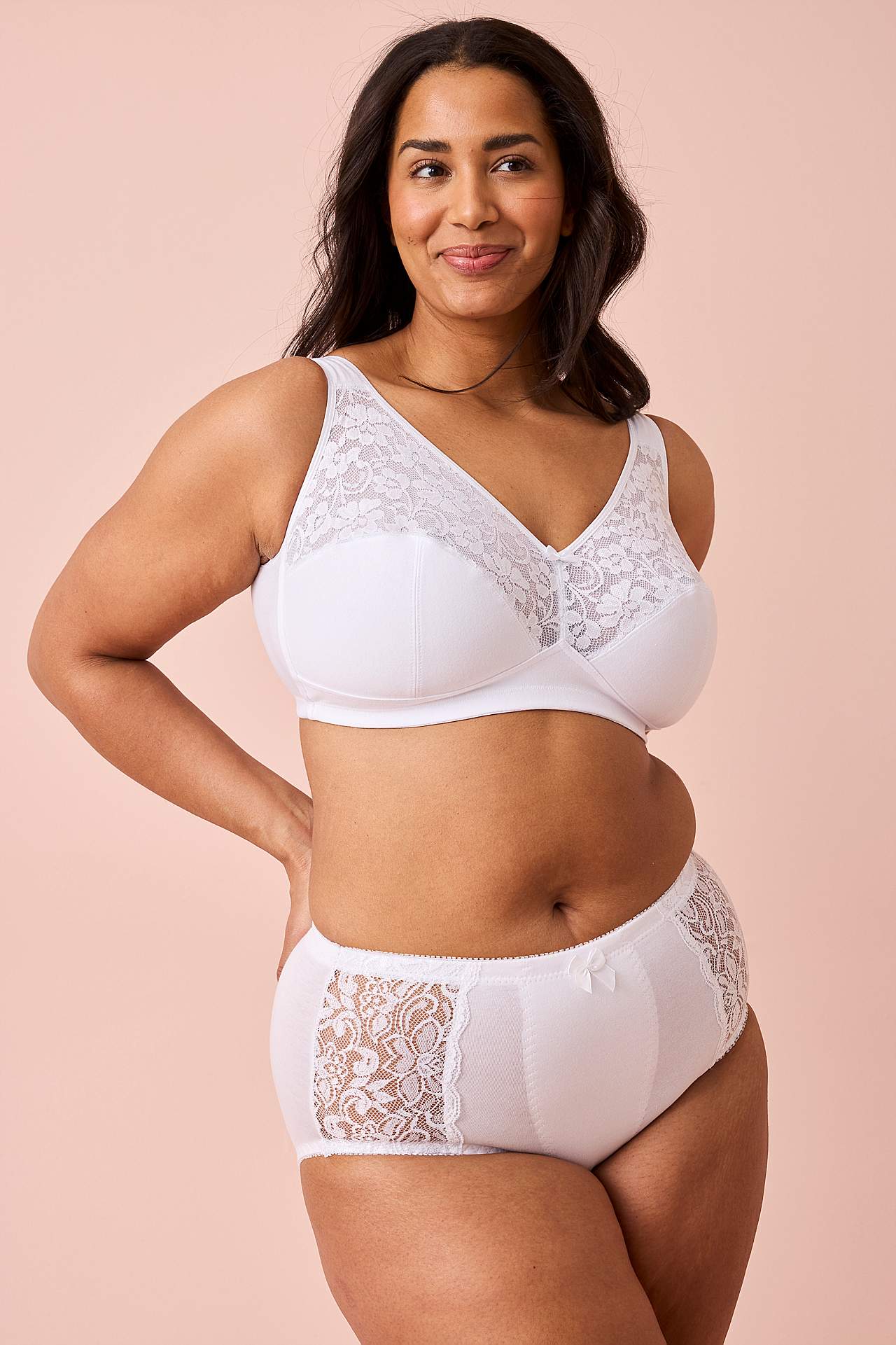 Reinforced front with lightly sculpting effect. Model with high waist. Panels with lace at the sides with a flower pattern. Soft elastic at the waist and leg openings. Cotton lined gusset.