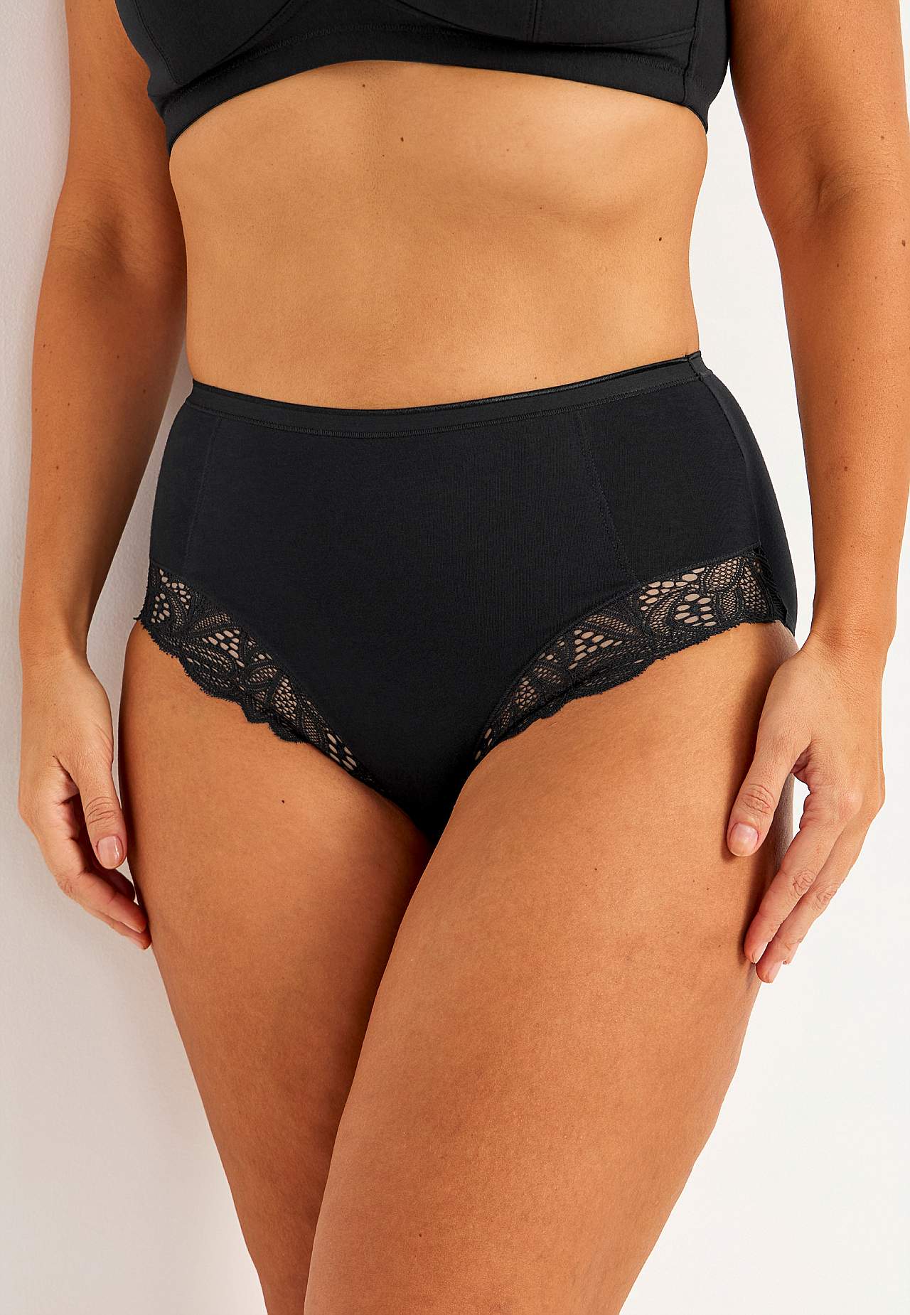 Sold in packs of three. Pantie in cooling, elastic, organic cotton. Slight shaping effect at front. High rise with soft elastic perfect for comfortable wear. Soft, stretchy lace on the leg openings. Cotton lined gusset.