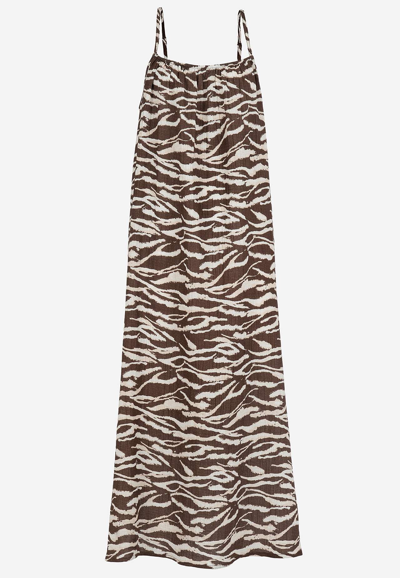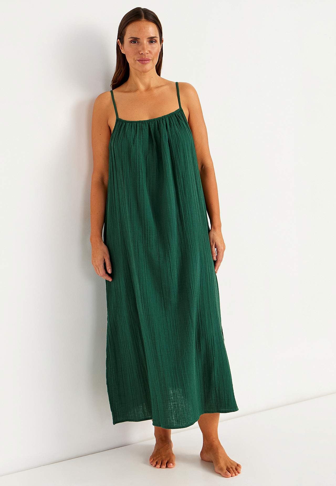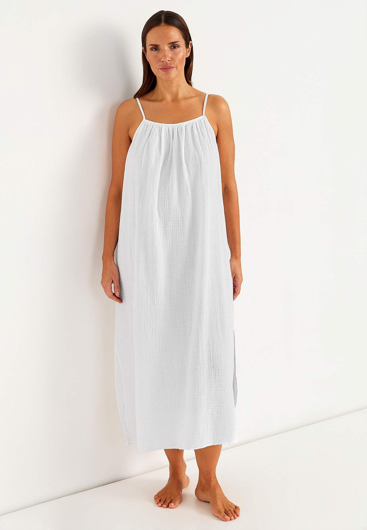 Dress in cotton gauze with natural structure. Woven, soft material with airy, cooling feel. Spacious, straight fit. Thin adjustable shoulder straps. Straight hem with high slit at the sides. The length varies with size about 114-121 cm in the middle of the front.