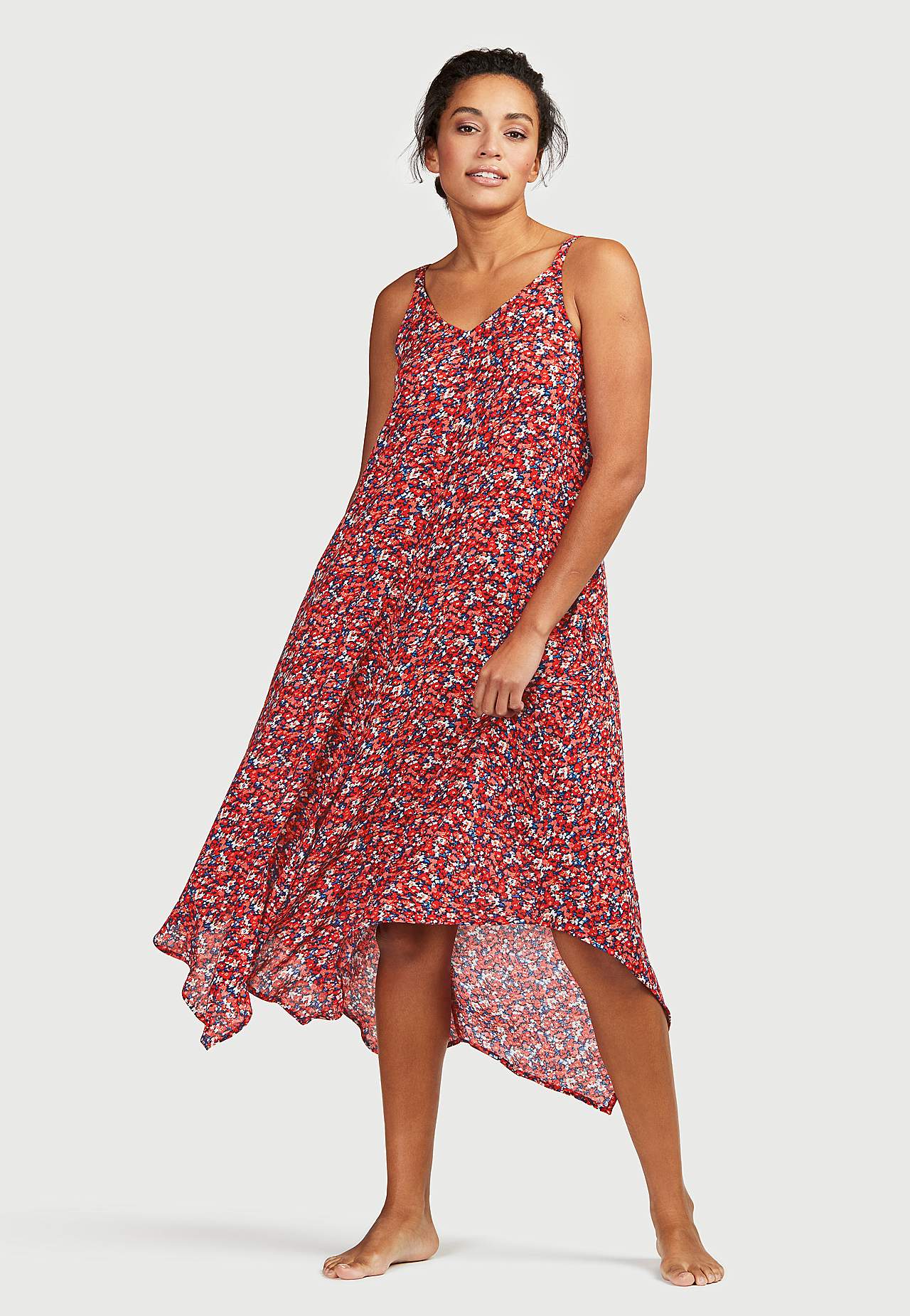 Woven beach dress with thin shoulder straps. Adjustable shoulder strap. The length varies with size: about 117-131 cm from the back shoulder.