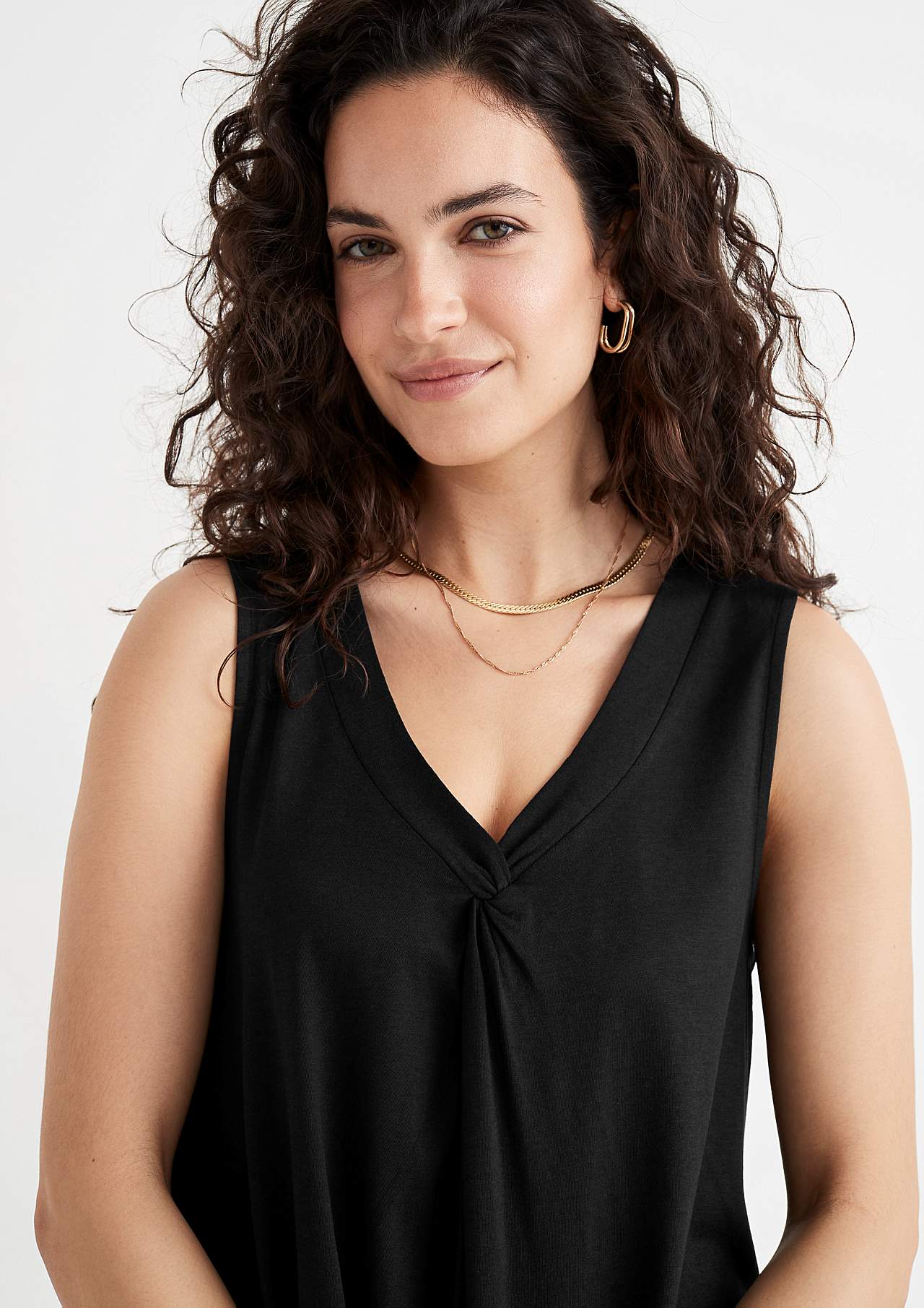 Sleeveless jersey dress. Airy model in lovely soft cotton viscose blend. V-neck cut with decorative twist knot at the front. Roomy, slightly a-line-shaped fit. The length varies with size: about 95-106 cm from the back shoulder.