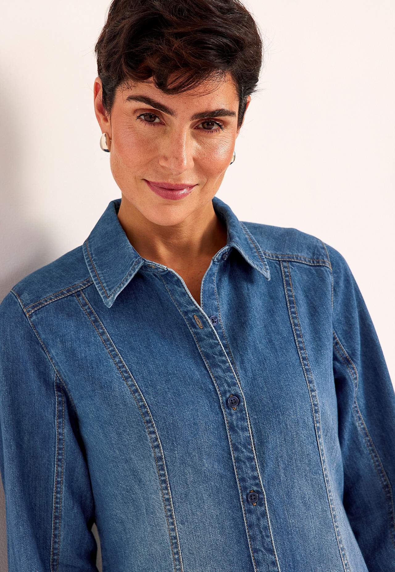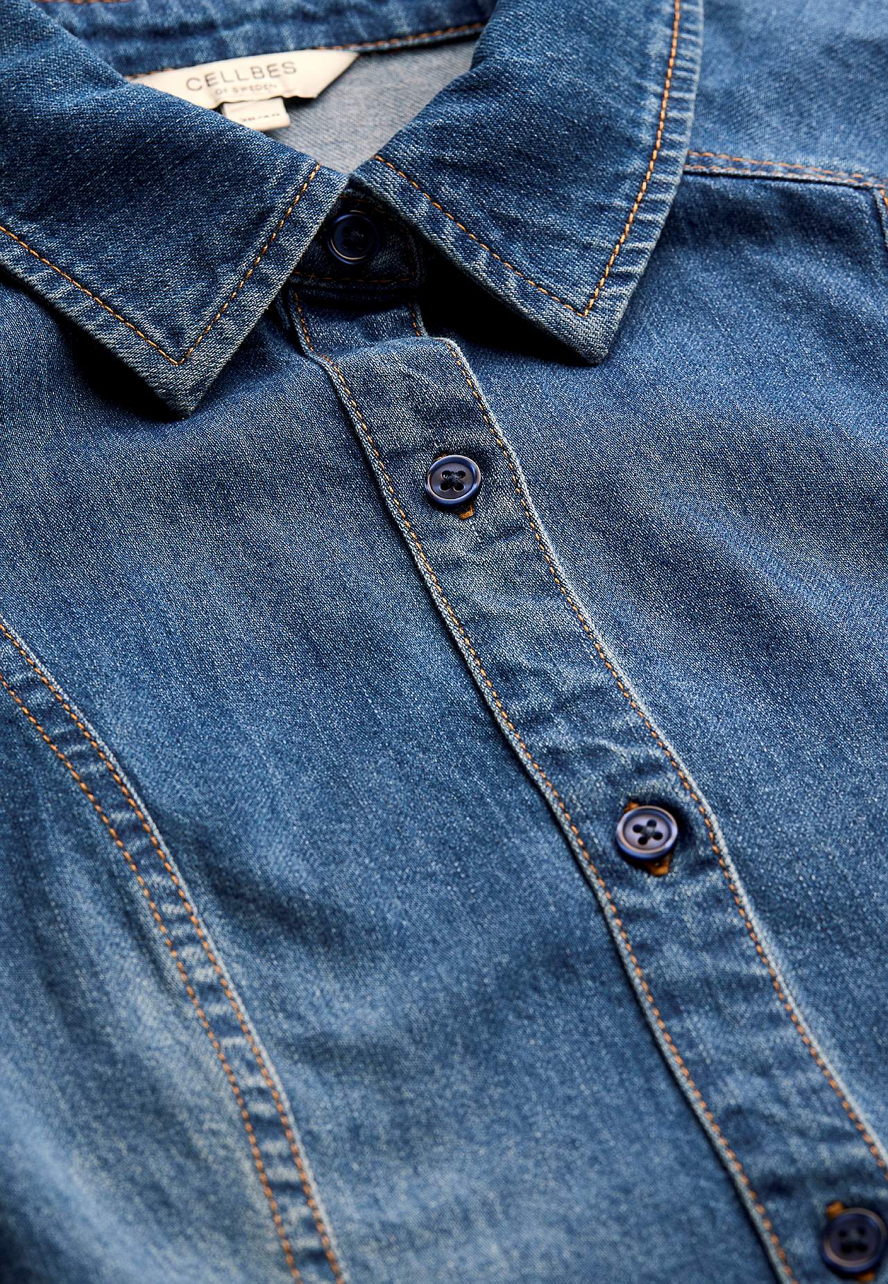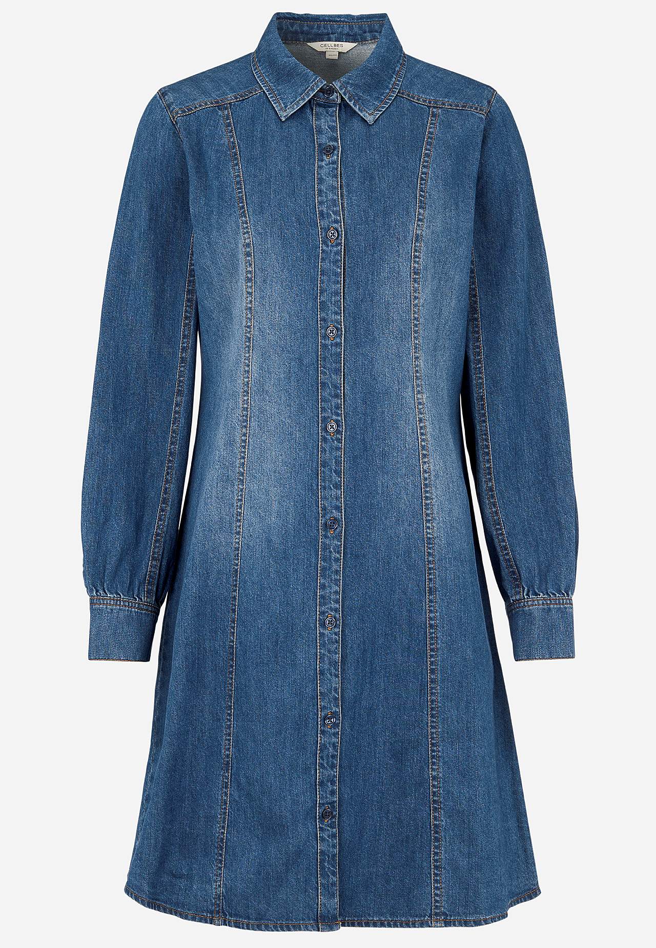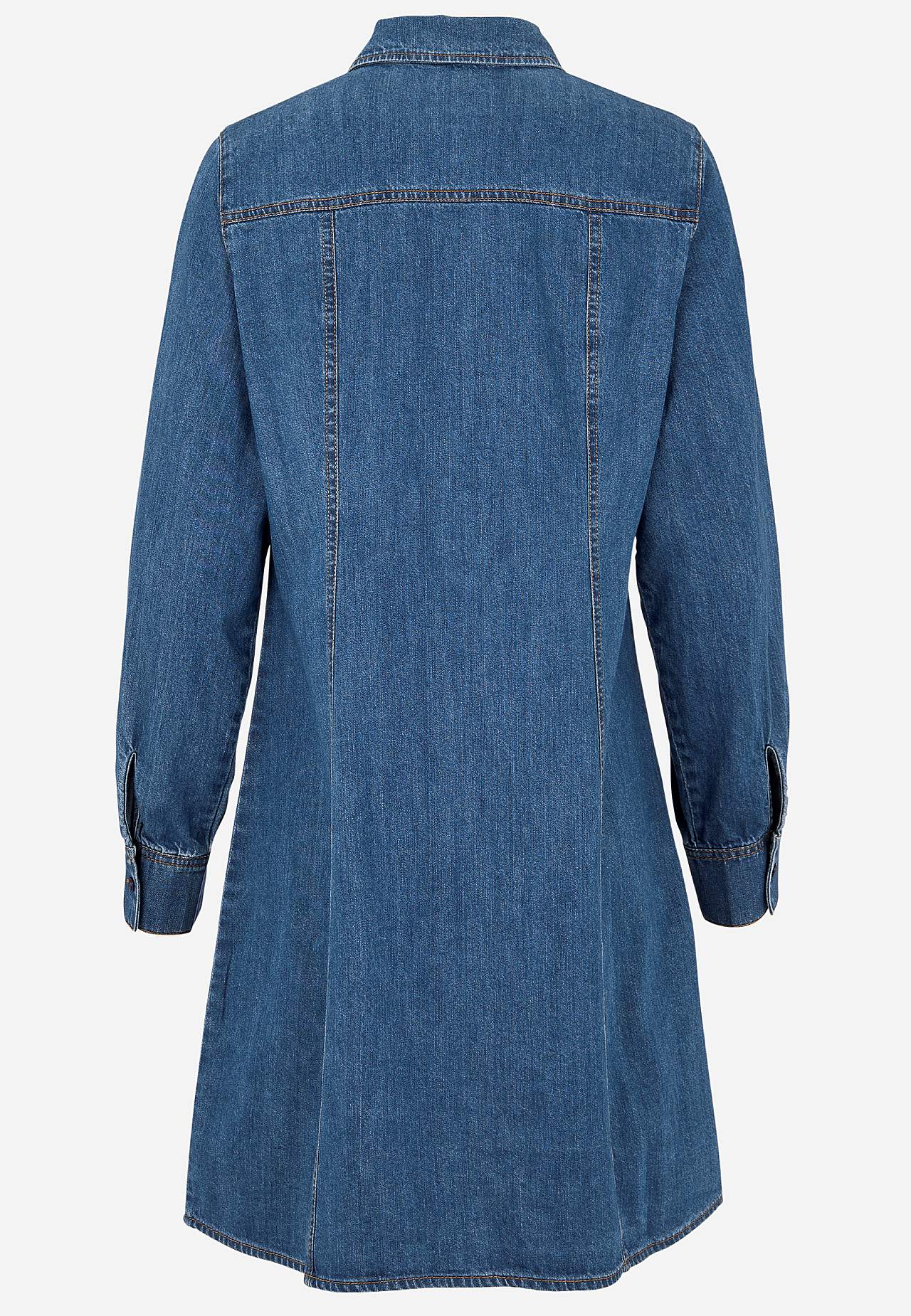 Denim dress in soft, slightly heavier, supple denim. Regular fit. Buttoned through model with classic collar. Long sleeves with cuff and button at the cuffs. Flattering decorative stitches in front and back. Yoke on the back. Rounded, slightly longer at the back hem. The length varies with size: about 96-110 cm from the sho... Read more