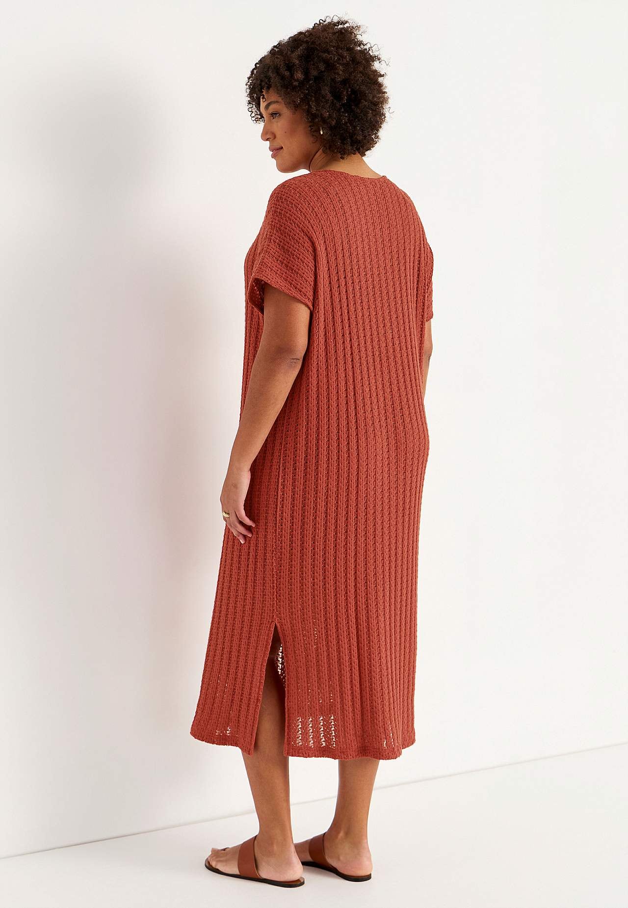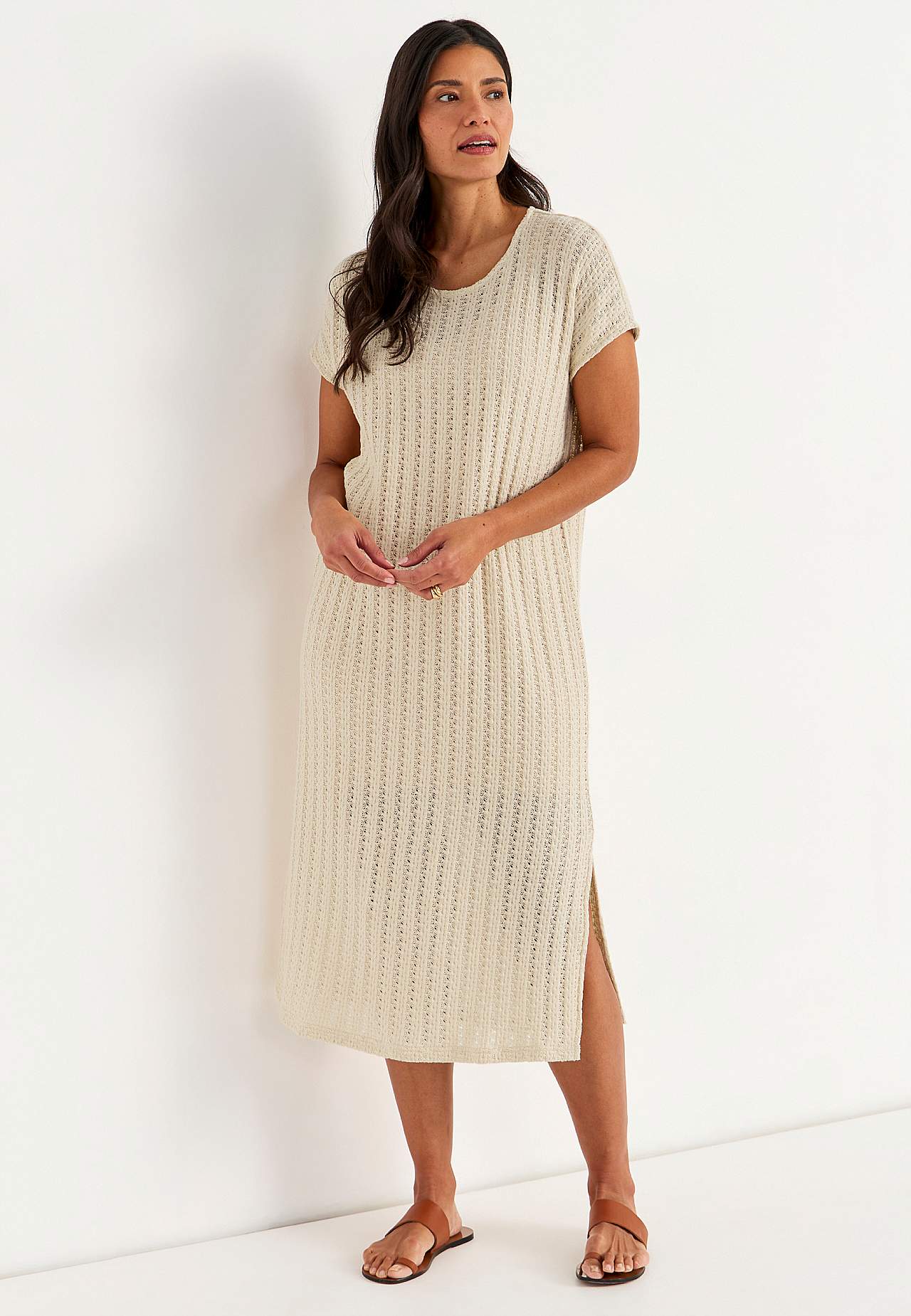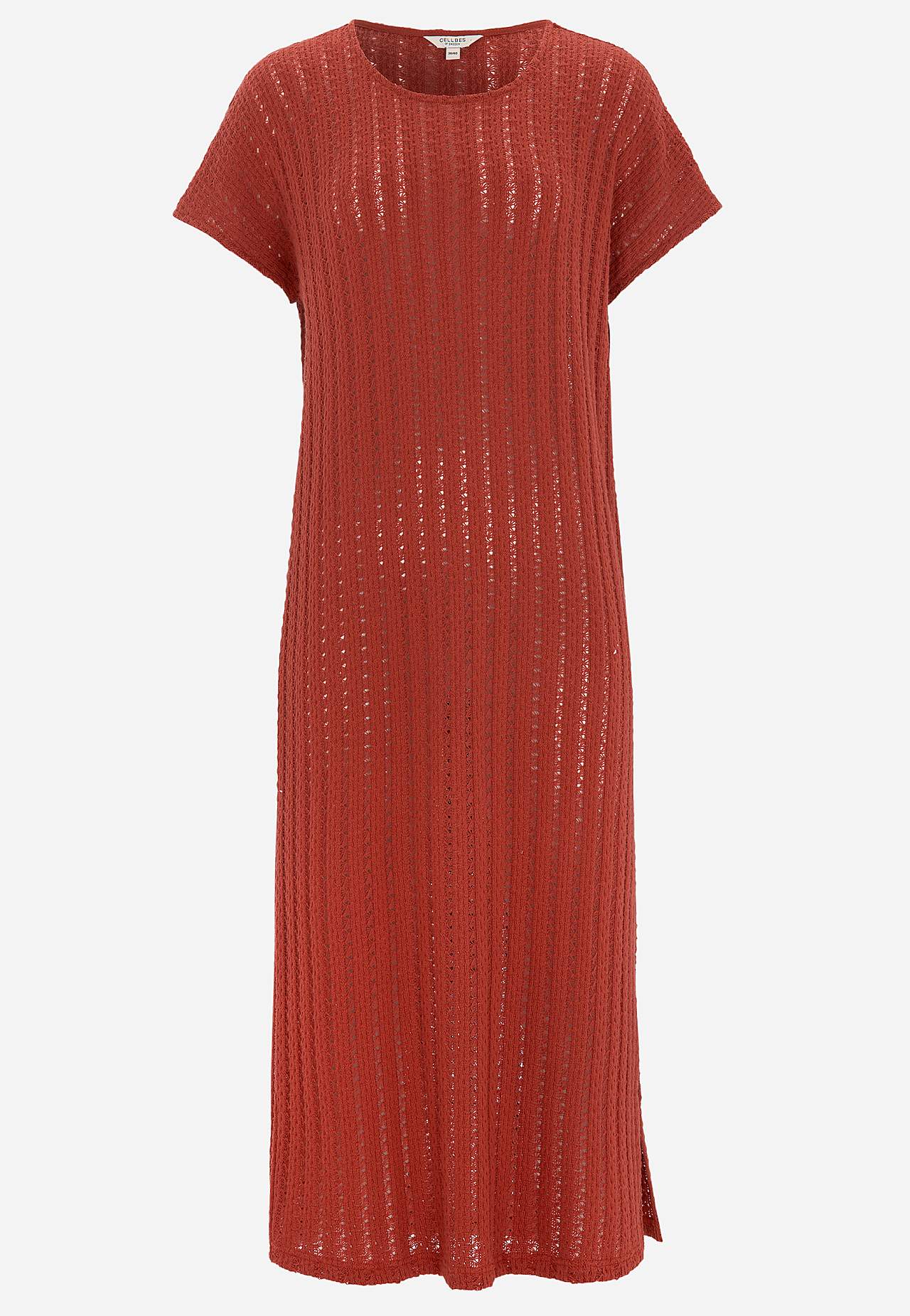 Knitted, airy jersey dress with striking openwork. Soft, firm cotton blend. Unlined, long kaftan model. Nice to wear over a tank top and a pair of white jeans. Casual fit. Rounded neckline. Short cap sleeves. Gently rounded hem with slit at the side. Back length is approx. 124 cm in all sizes.
