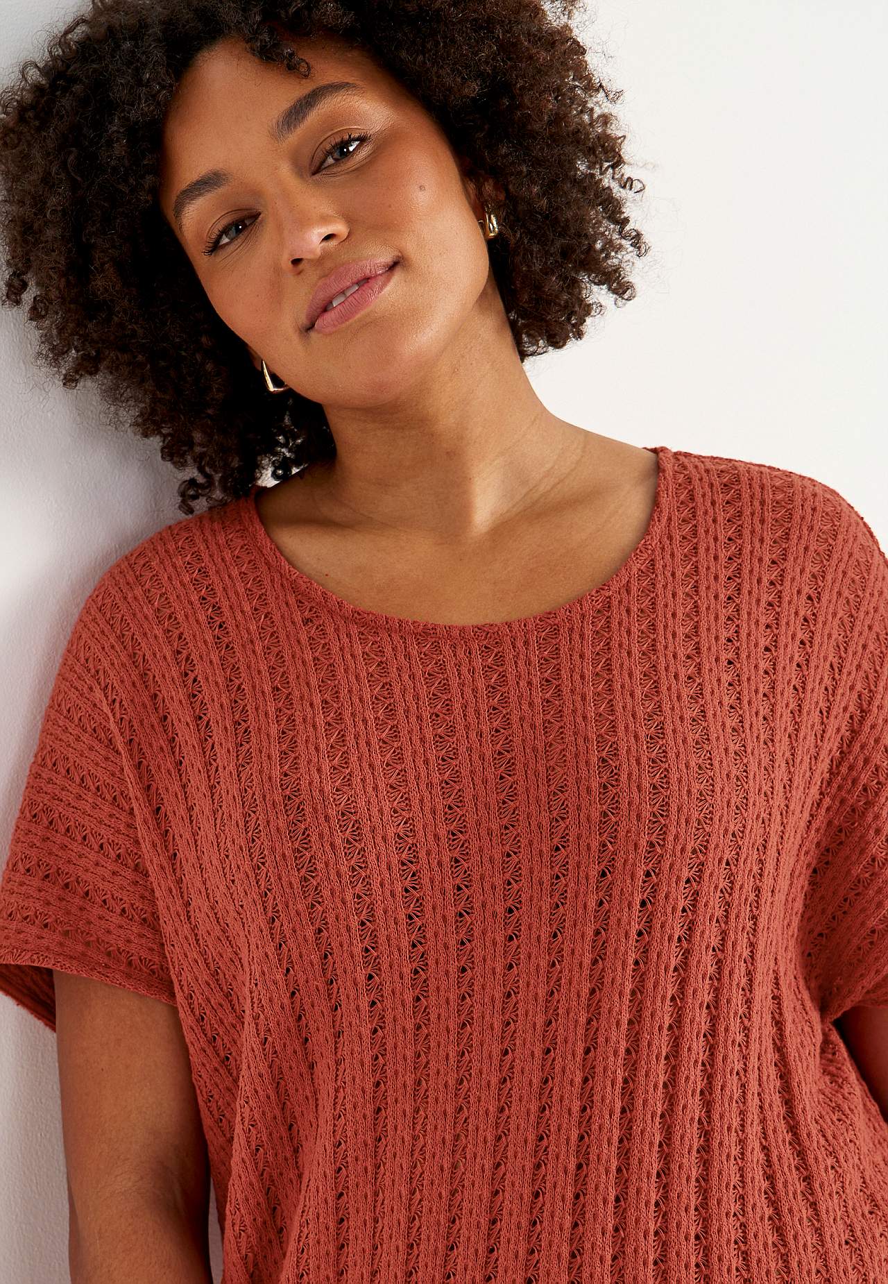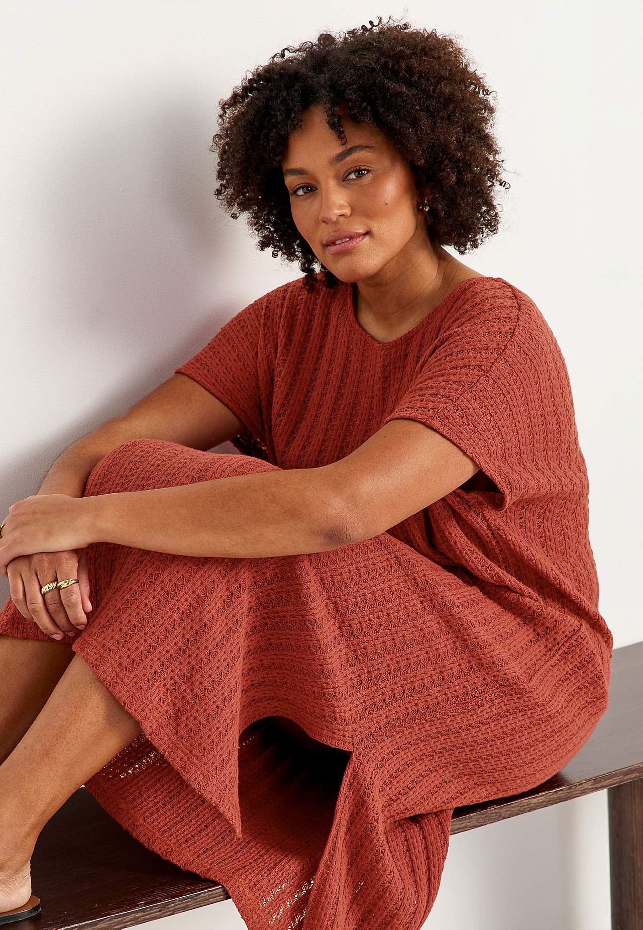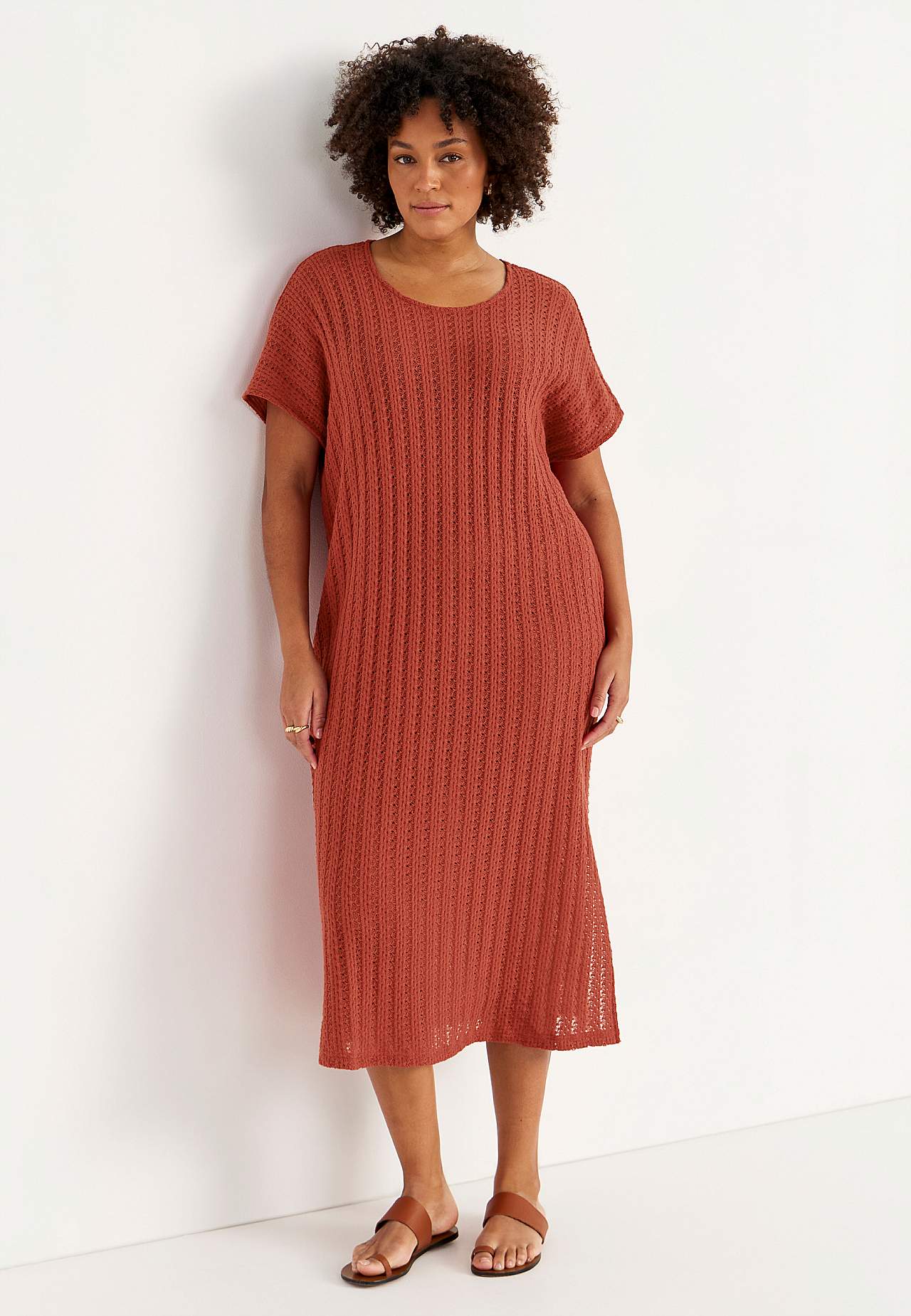 Knitted, airy jersey dress with striking openwork. Soft, firm cotton blend. Unlined, long kaftan model. Nice to wear over a tank top and a pair of white jeans. Casual fit. Rounded neckline. Short cap sleeves. Gently rounded hem with slit at the side. Back length is approx. 124 cm in all sizes.