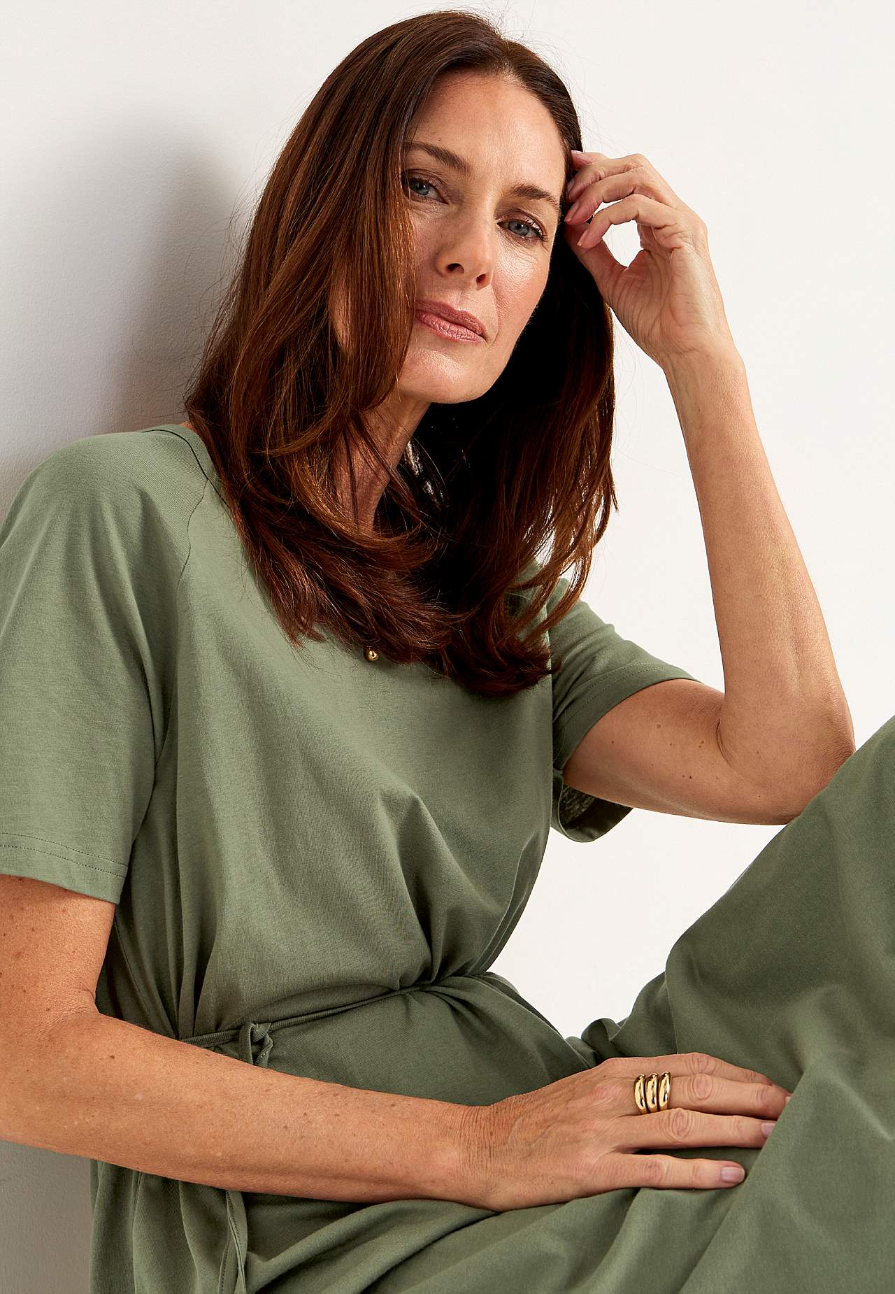 Soft dress with detachable self-tie belt. Loose fit. Round neckline. Short raglan sleeve. Rounded hem with slit at the sides. Length from shoulder approx. 122 cm in all sizes.