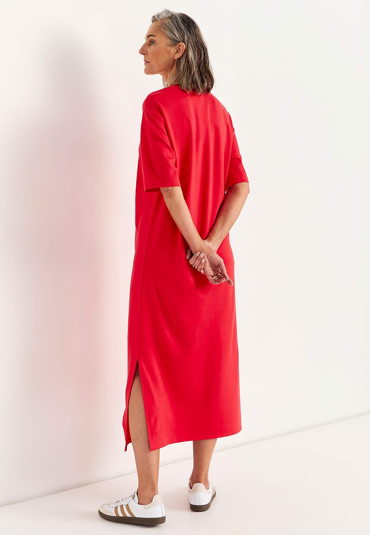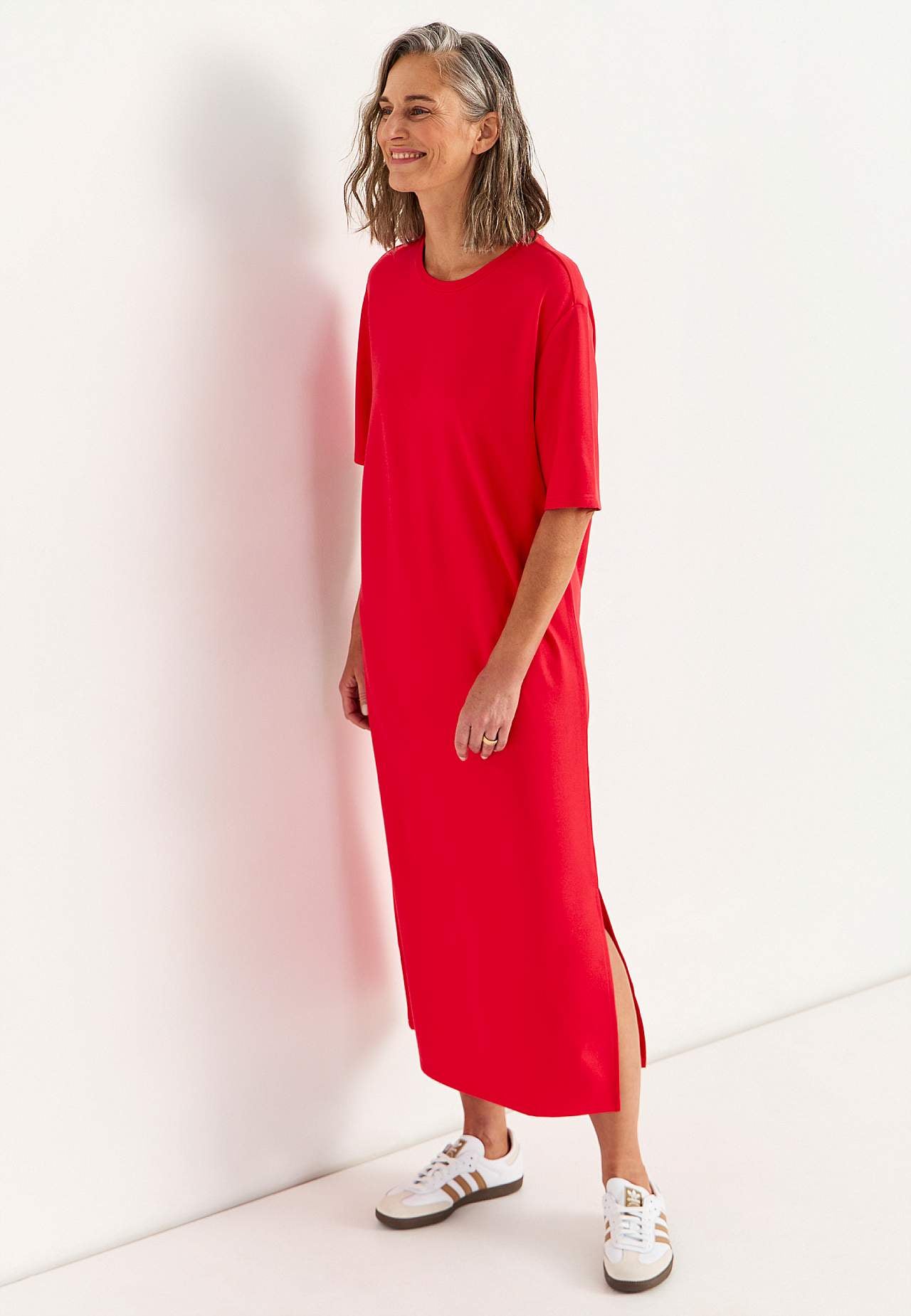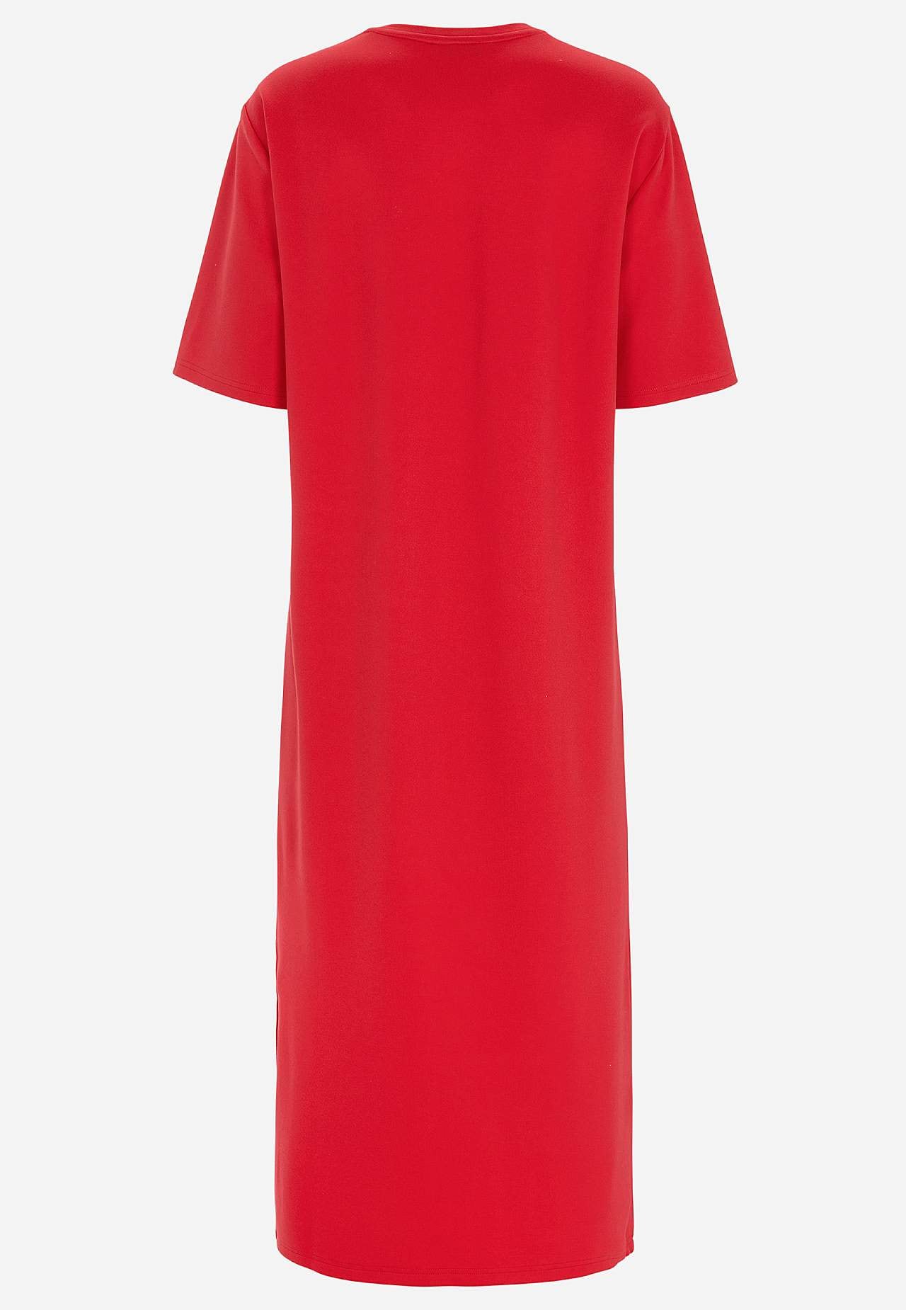 Soft dress in heavy jersey with stretch. Straight, loose fit. Round neck. Dropped shoulder. Short sleeves. Straight hem with high slit at the side. Length from shoulder approx. 121 cm in all sizes.