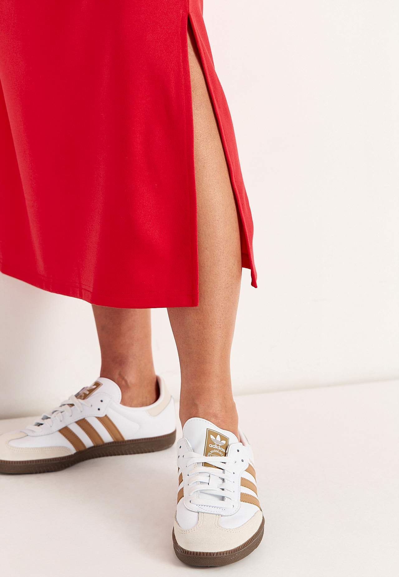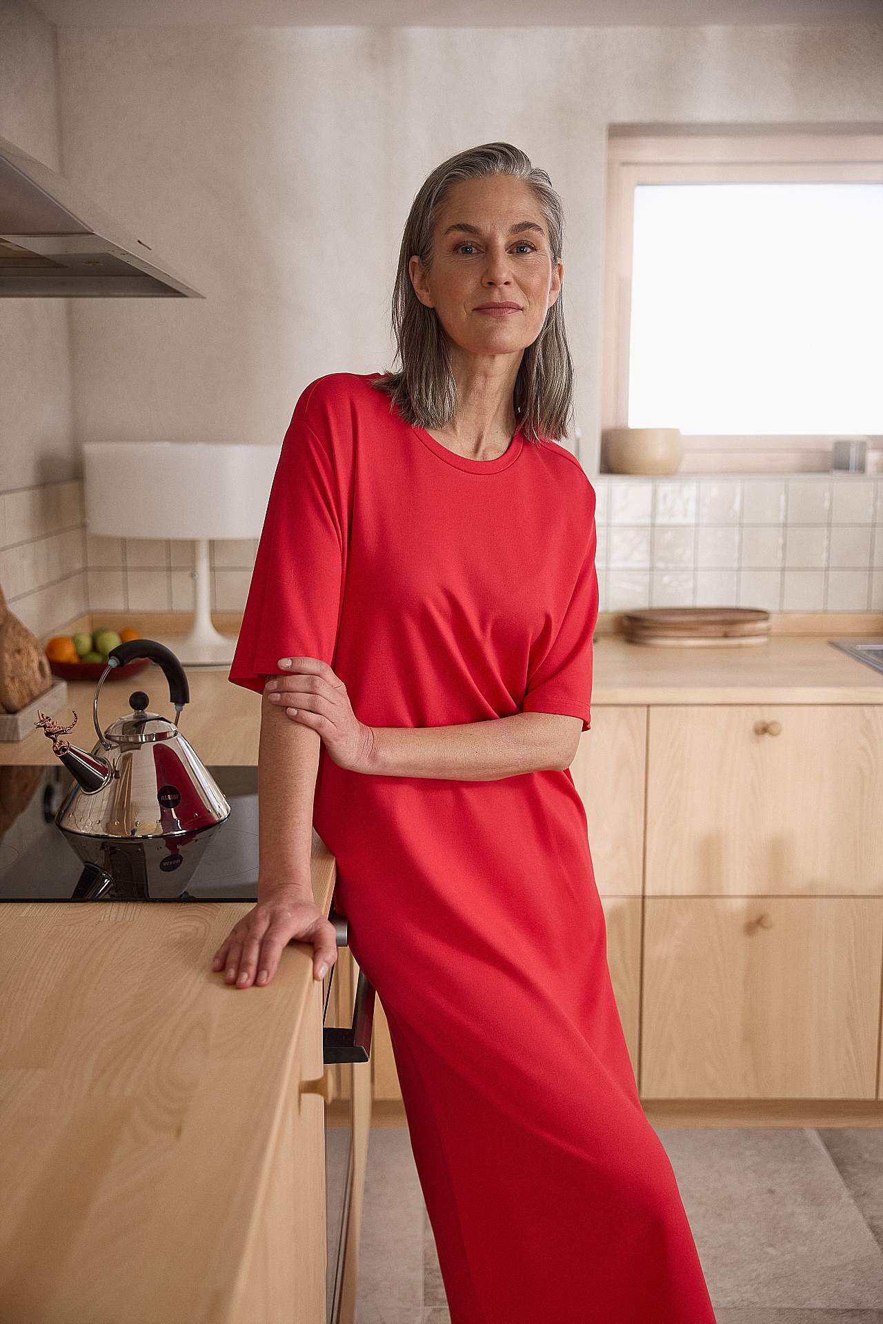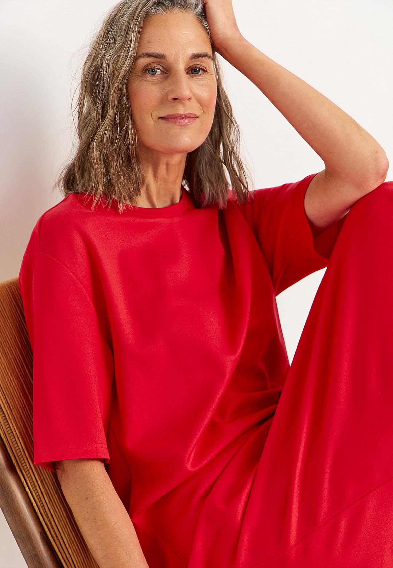 Soft dress in heavy jersey with stretch. Straight, loose fit. Round neck. Dropped shoulder. Short sleeves. Straight hem with high slit at the side. Length from shoulder approx. 121 cm in all sizes.