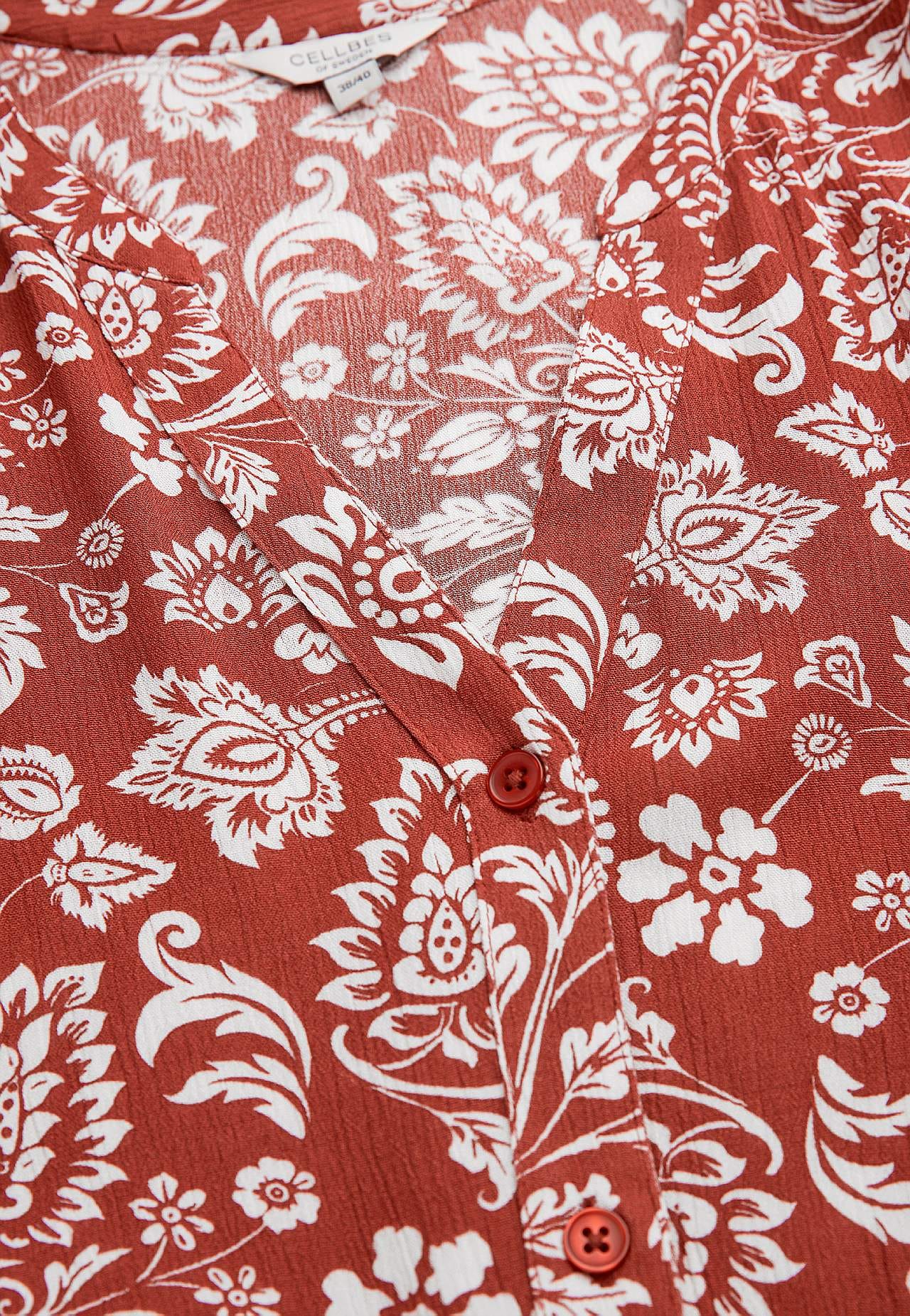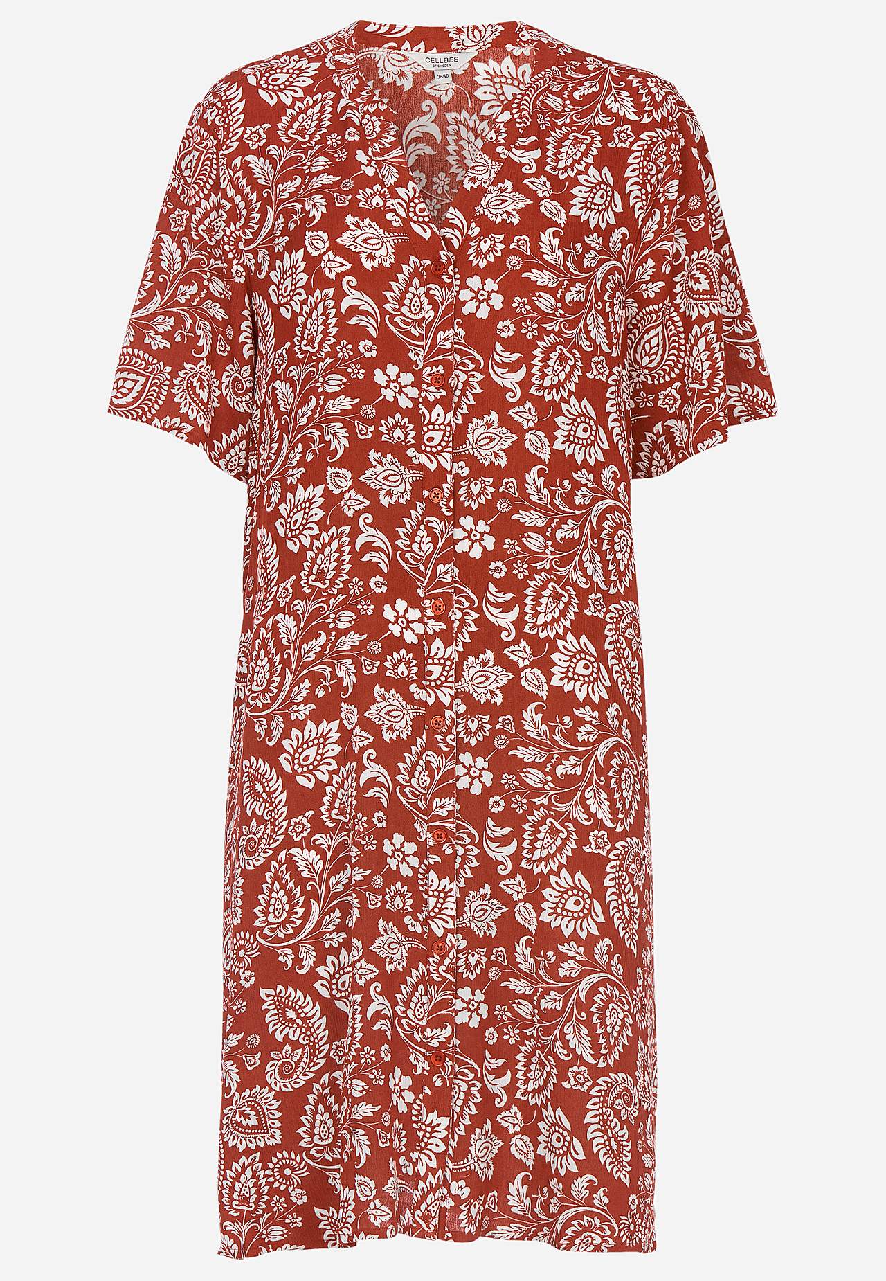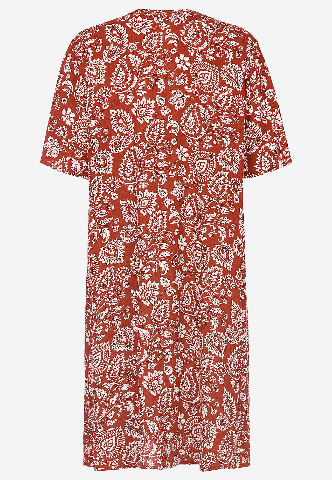 Airy, cooling material with matt surface and nice structure. A-lined, slightly roomier fit. Button closure at the front. Short sleeves. The back length varies with size: approx. 97-105 cm.