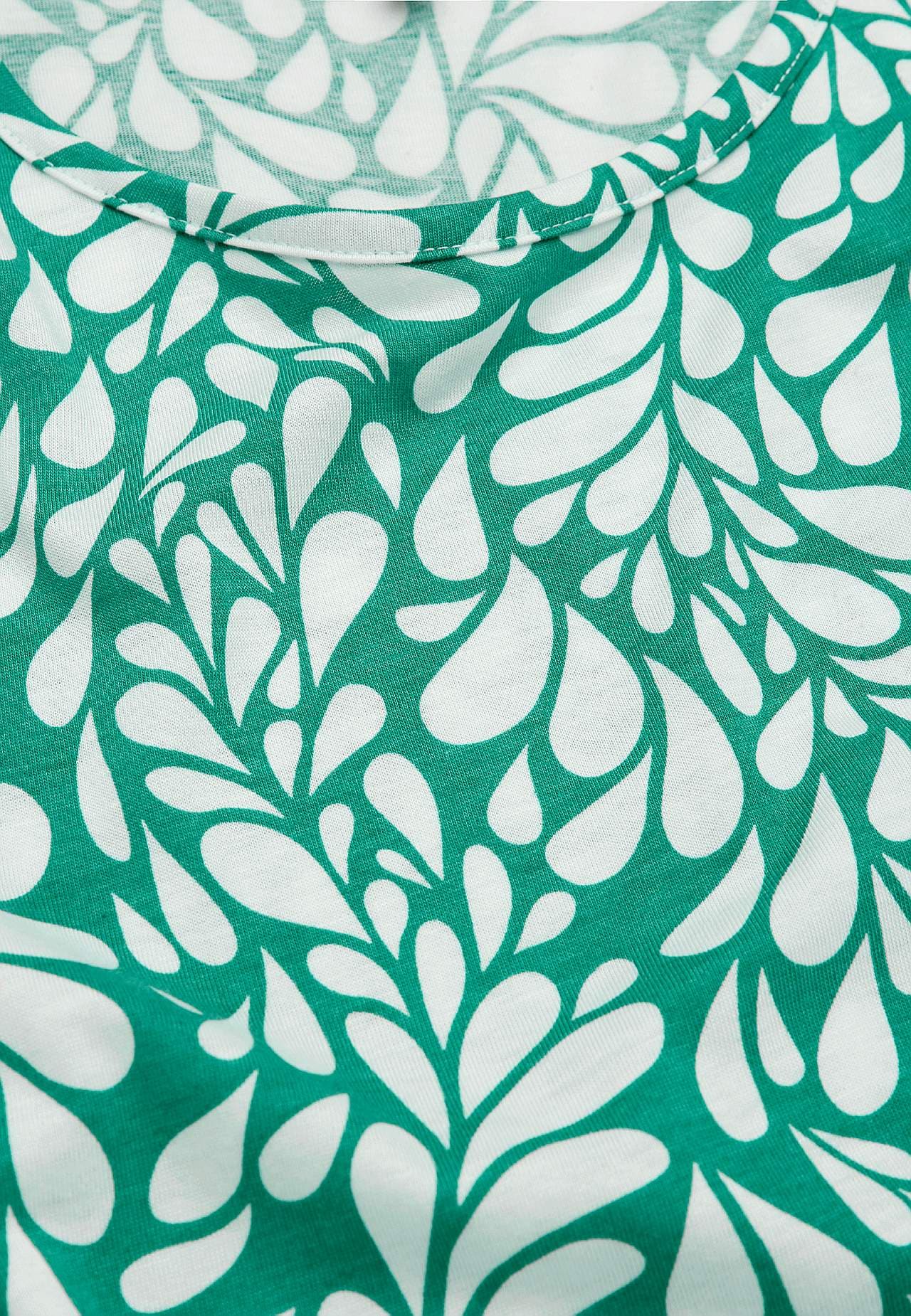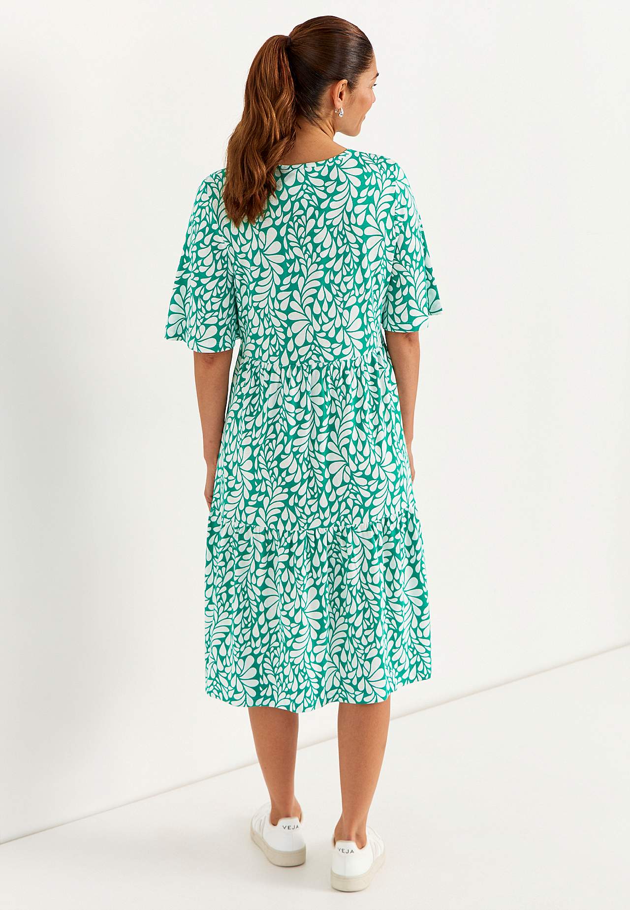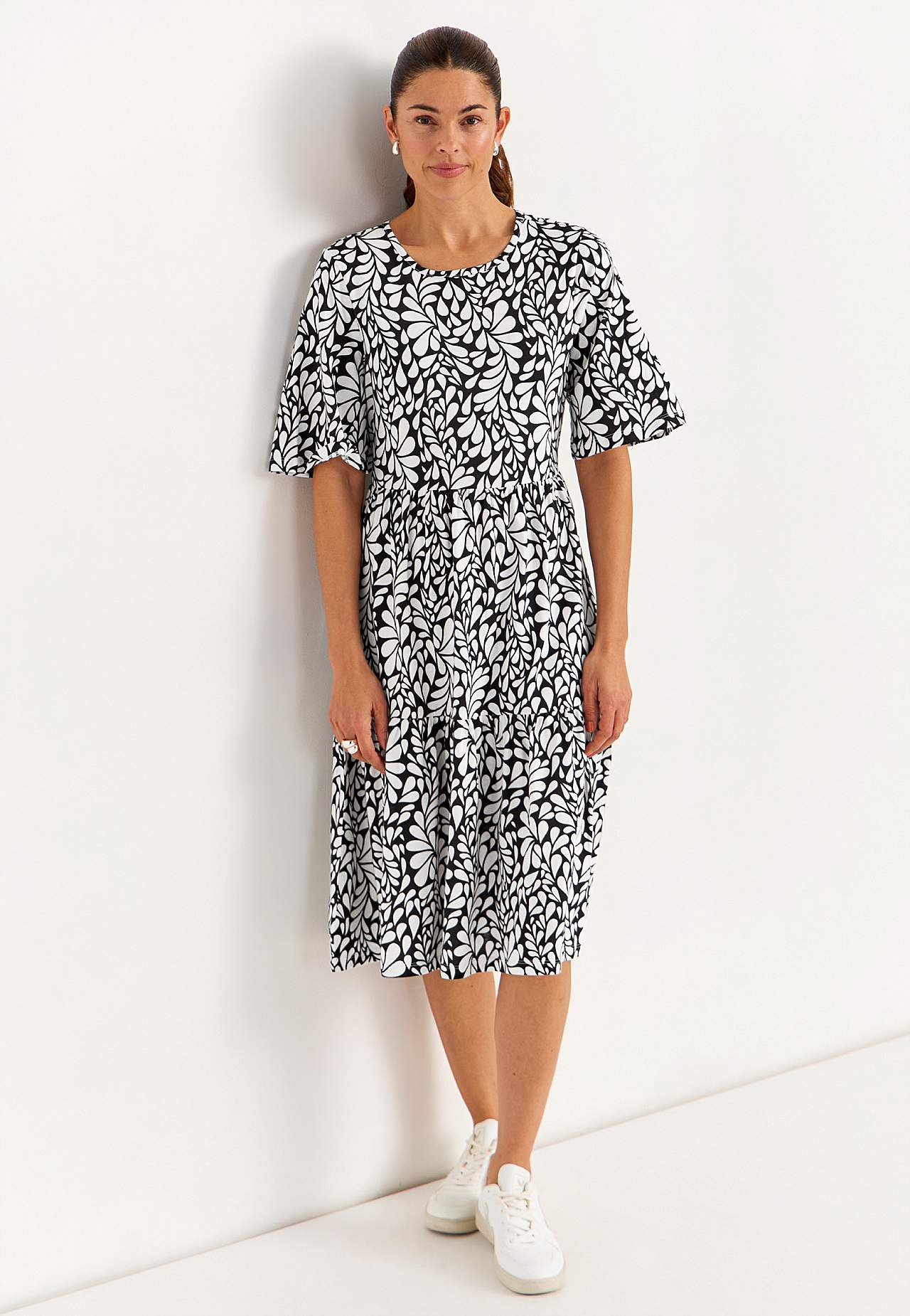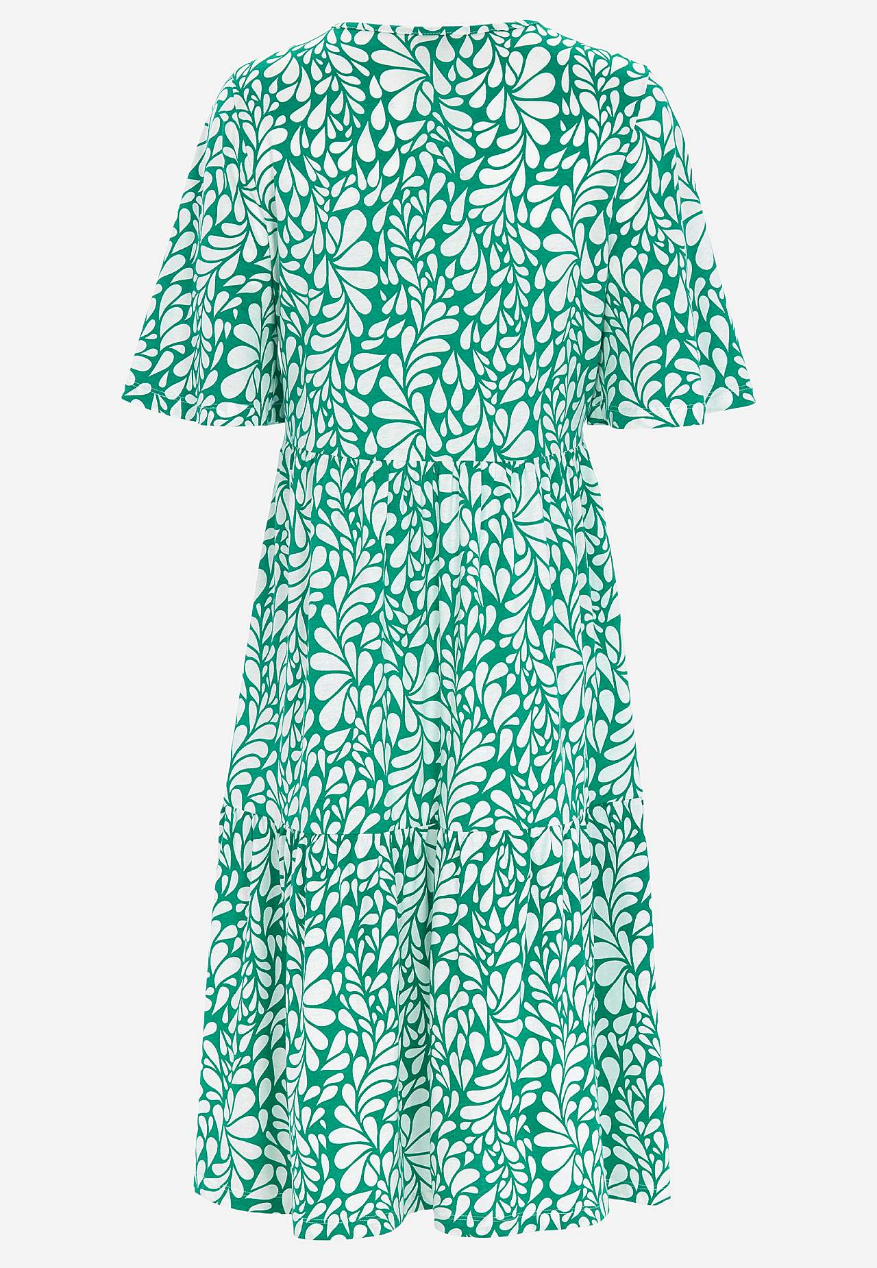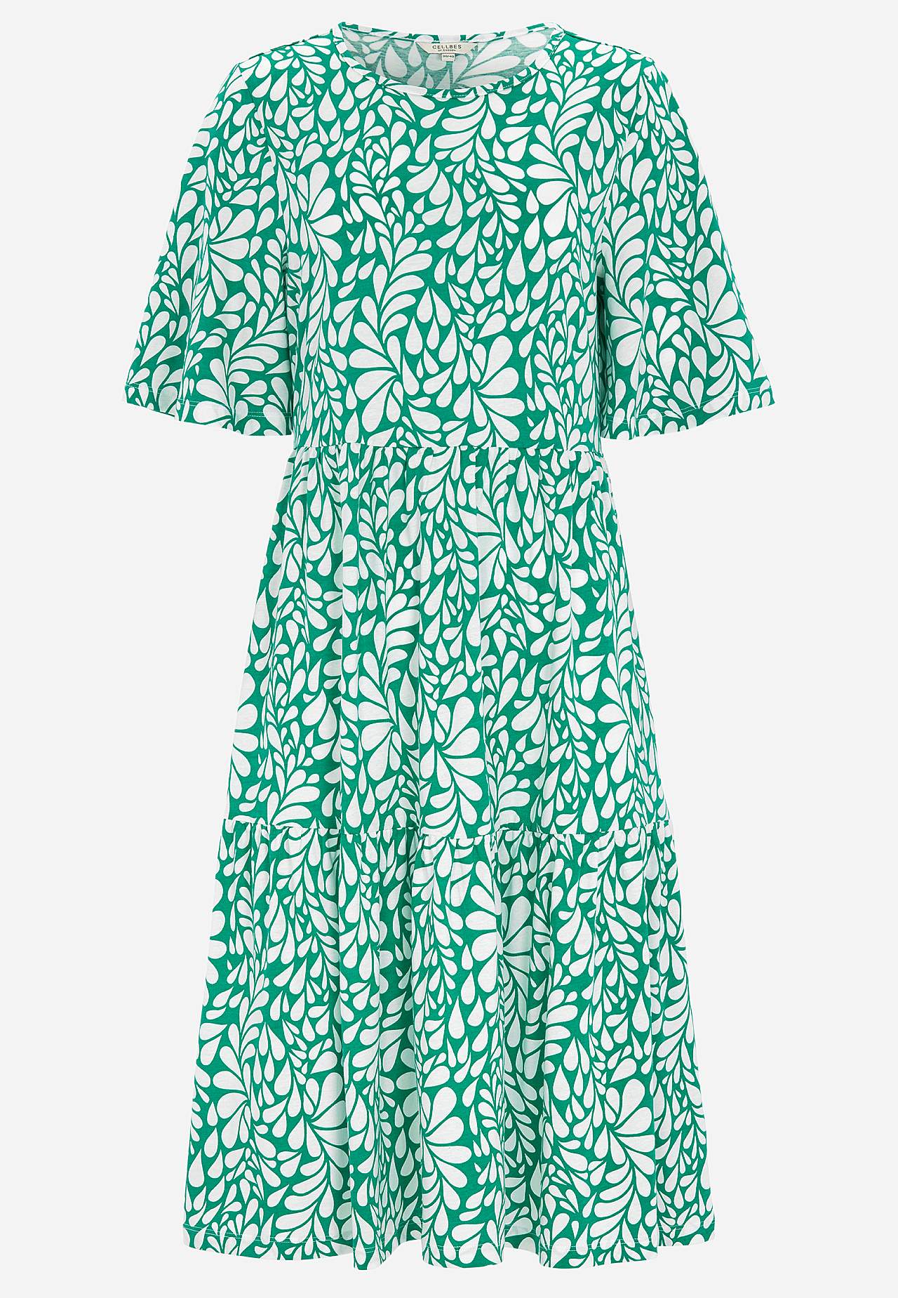 A-lined, loose fit. Round neck. Seam below the bust. Skirt part with flounce. Gently rounded hem. Back length is approx. 108 cm in all sizes.