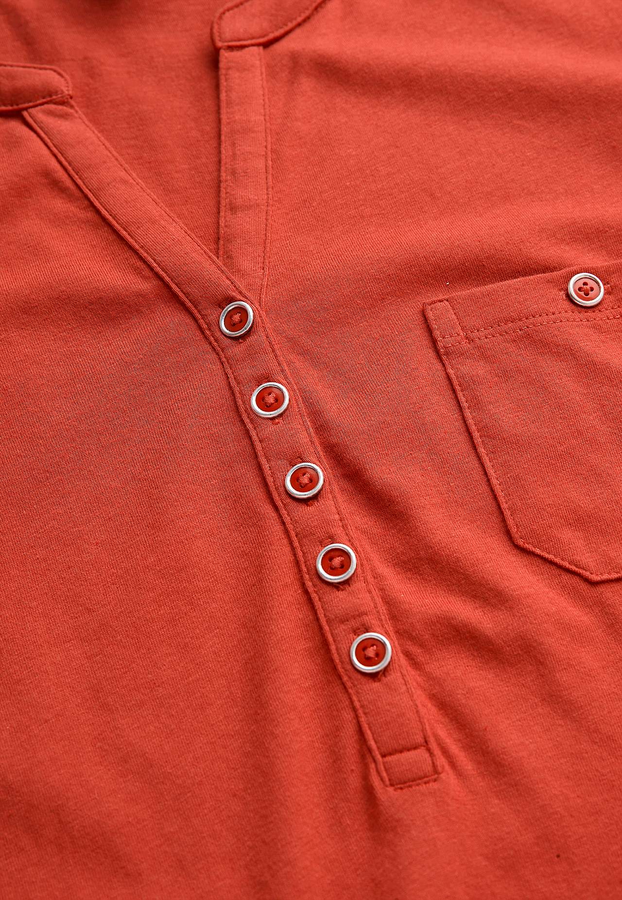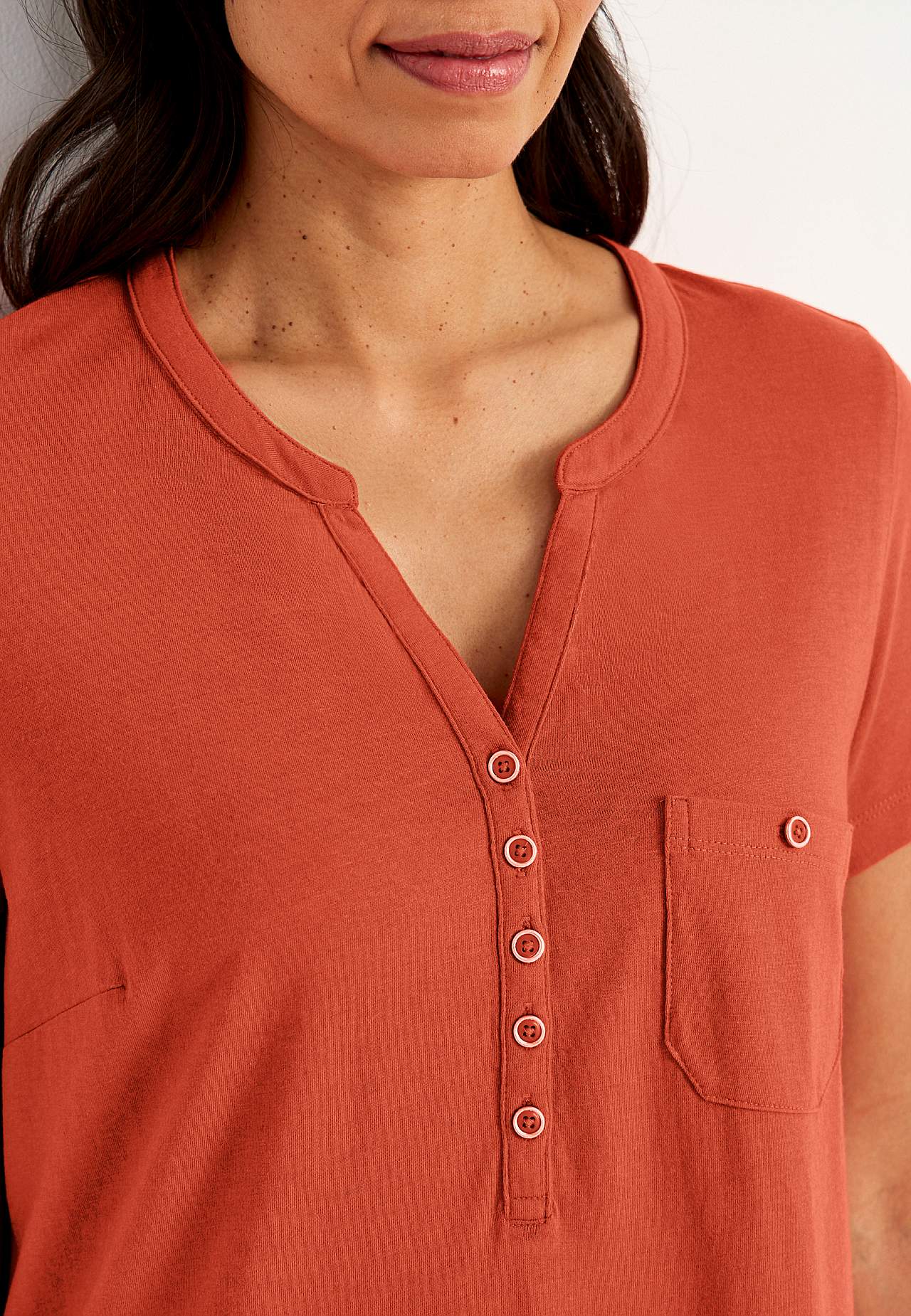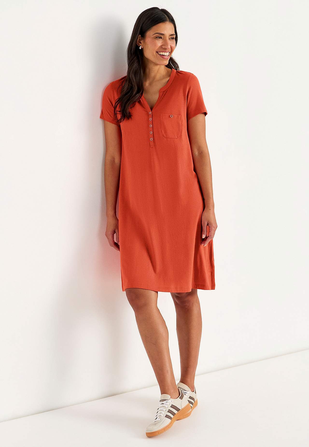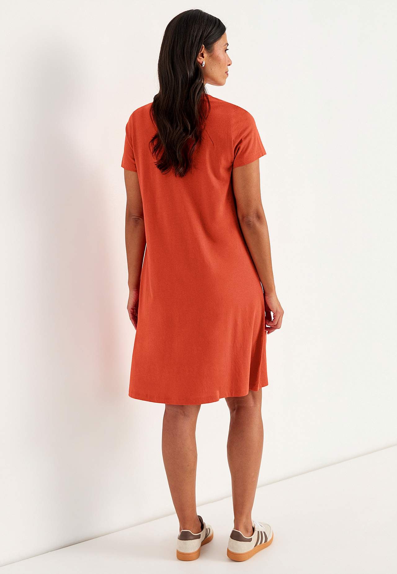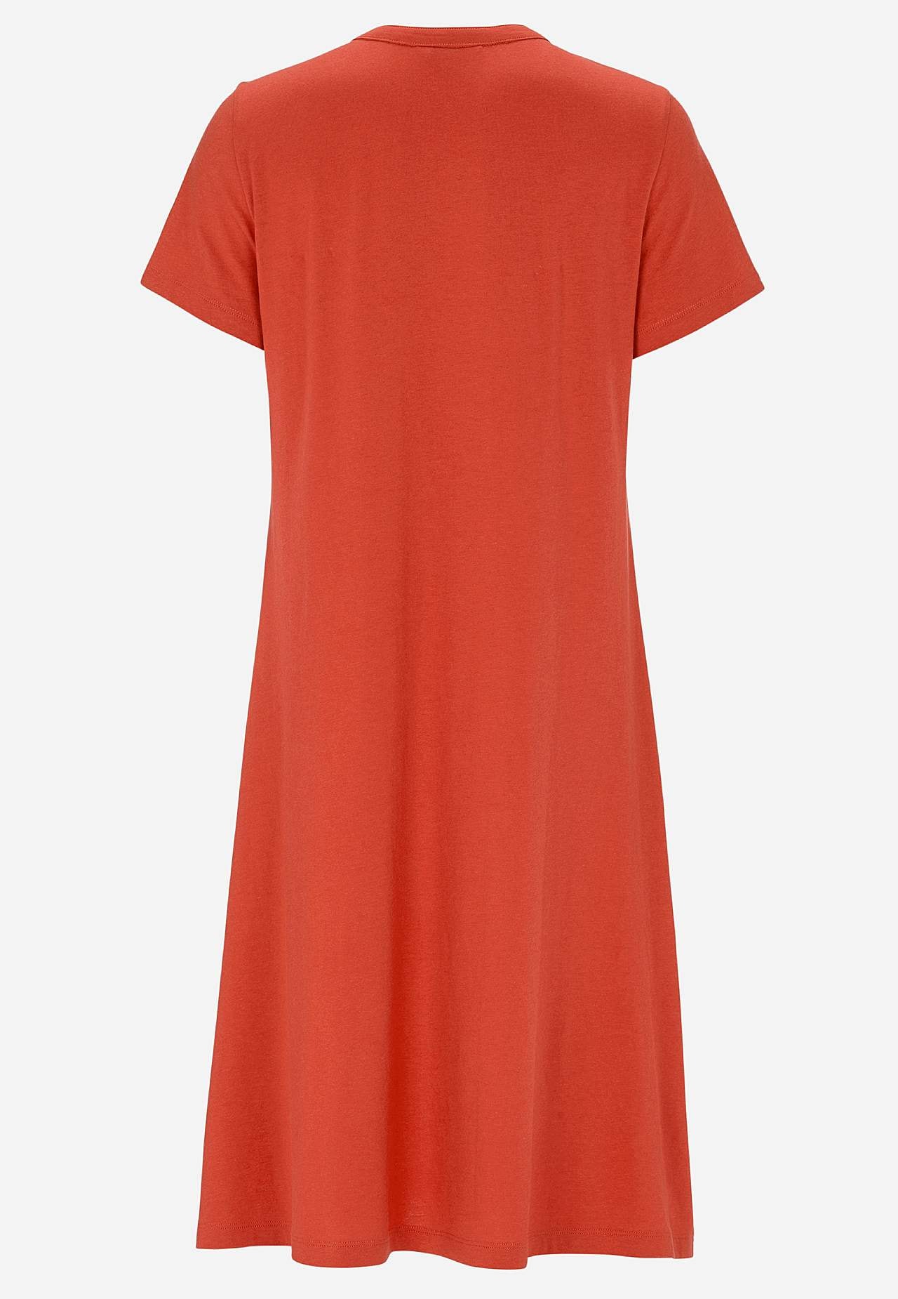 A-lined dress with short sleeves. Jersey in lovely soft organic cotton and modal. Round neck with v cut and button placket. Small chest pocket with button. Dart at the bust. Gently rounded hem. The length varies with size: about 97-114 cm from the shoulder.