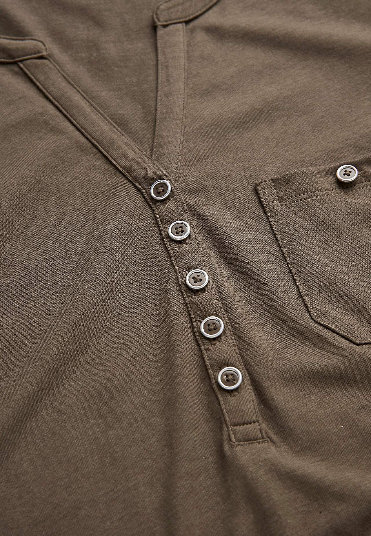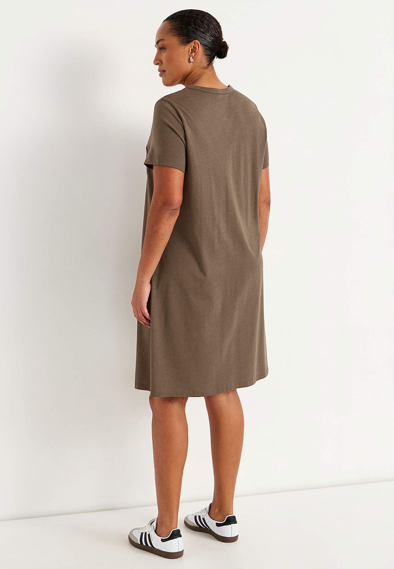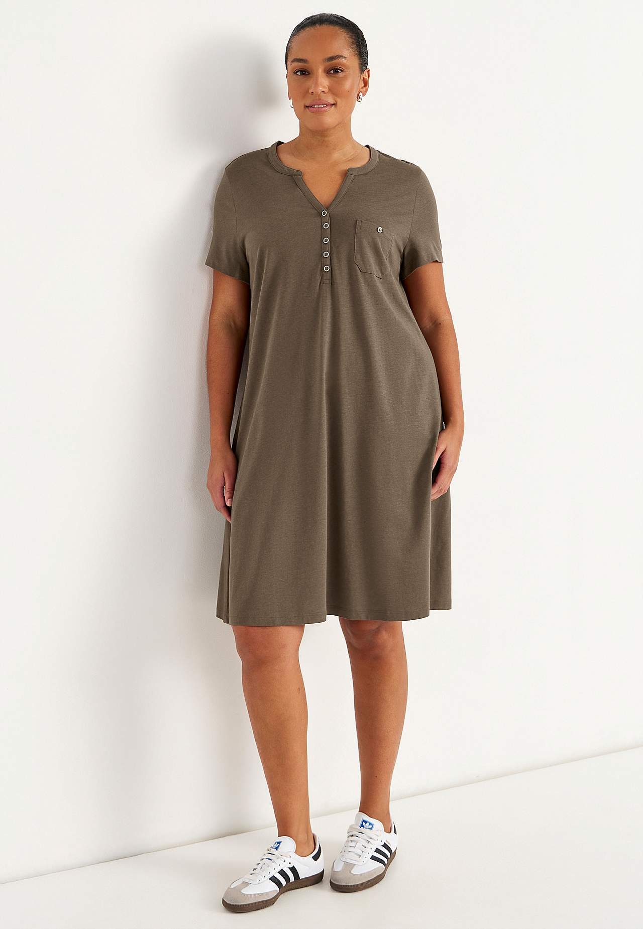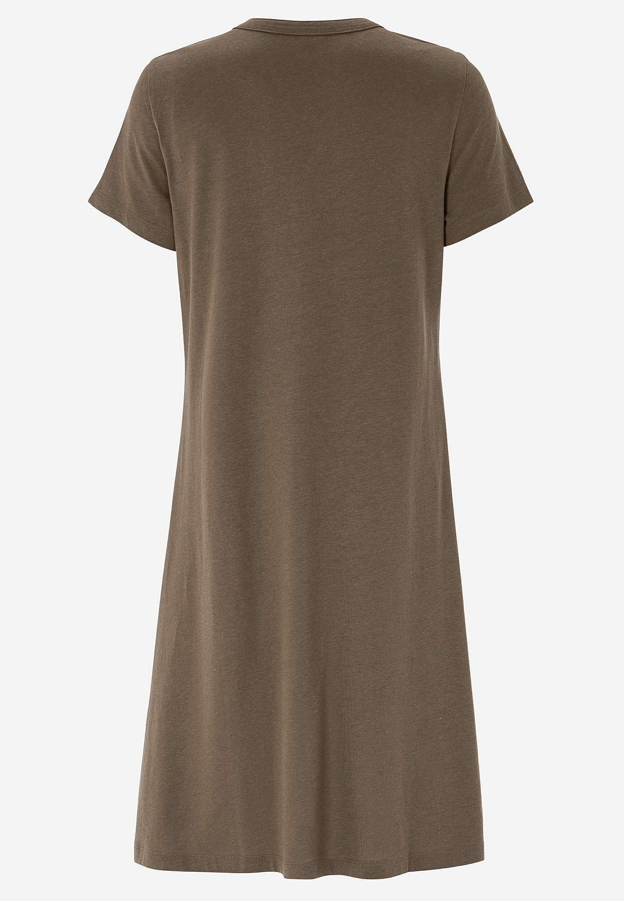 A-lined dress with short sleeves. Jersey in lovely soft organic cotton and modal. Round neck with v cut and button placket. Small chest pocket with button. Dart at the bust. Gently rounded hem. The length varies with size: about 97-114 cm from the shoulder.