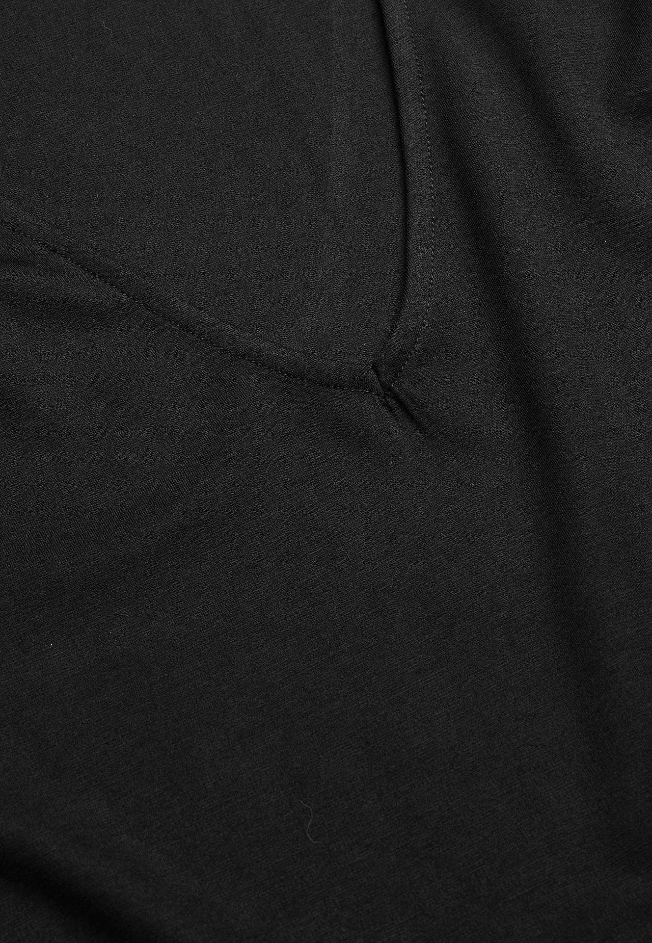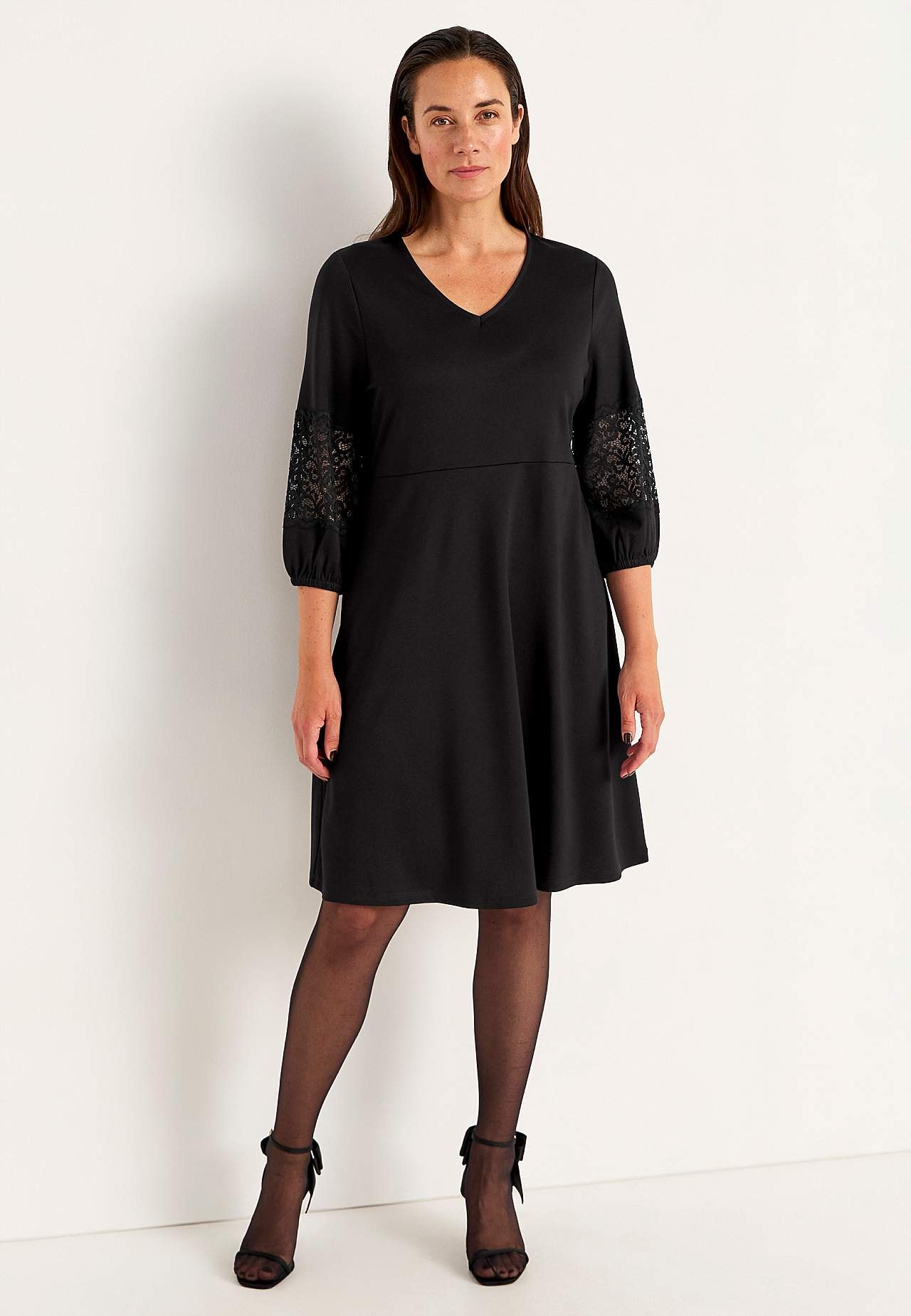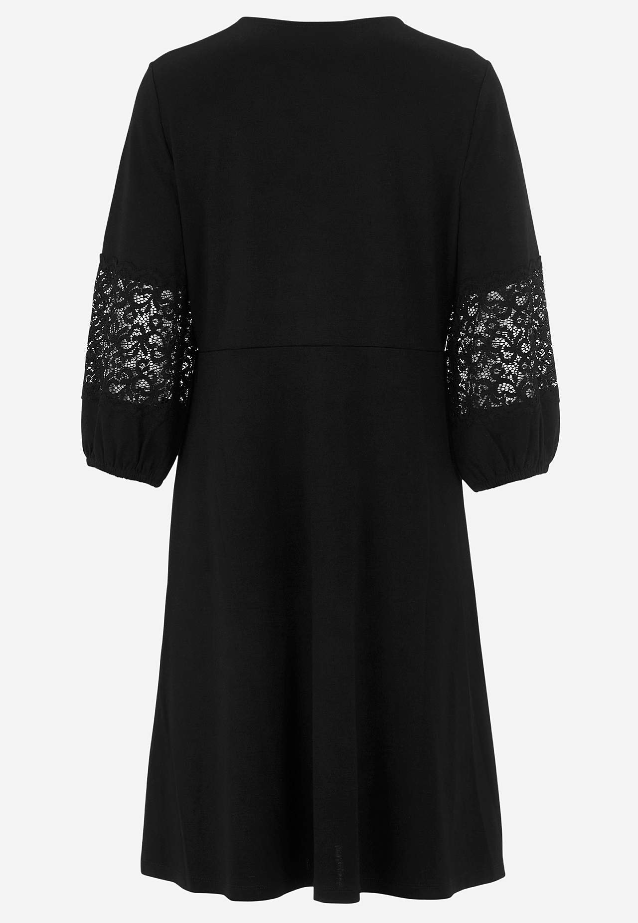 Dress in soft, smooth viscose jersey. Loose fit with width at the bottom. Cutted seam at the waist. V-shaped neckline. Three-quarter length sleeves with lace details and elastic at the cuffs. Lightly rounded hem. Back length is approx. 98 cm in all sizes.