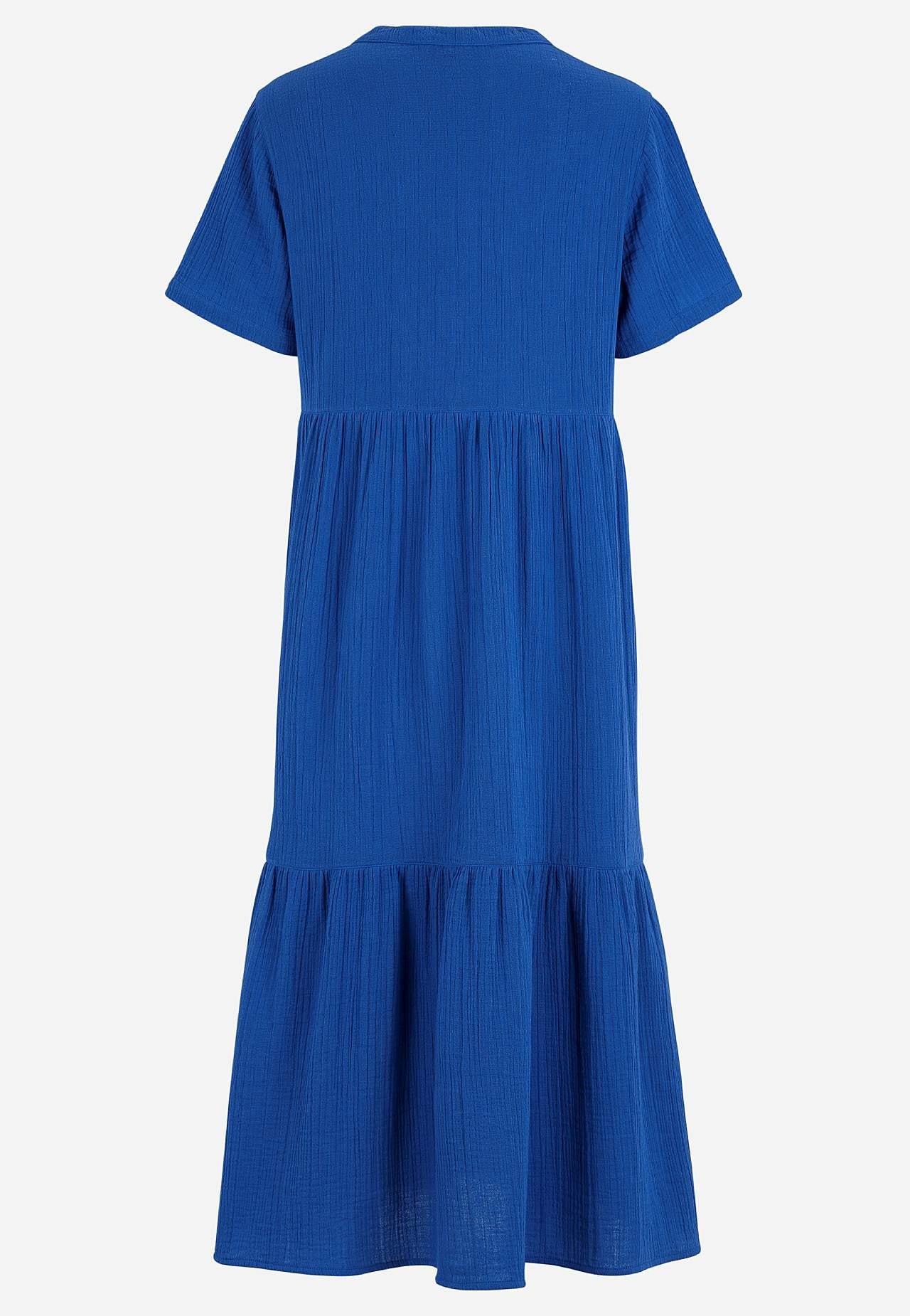 Flounce dress in lovely cotton gauze with natural structure. Woven, soft material with airy, cooling feel. Roomy fit with width at the bottom. Round neck with small v-neck cut. Short sleeves. Seam at the waist. Flounce at the bottom. Straight hem. Back length is approx. 125 cm in all sizes.