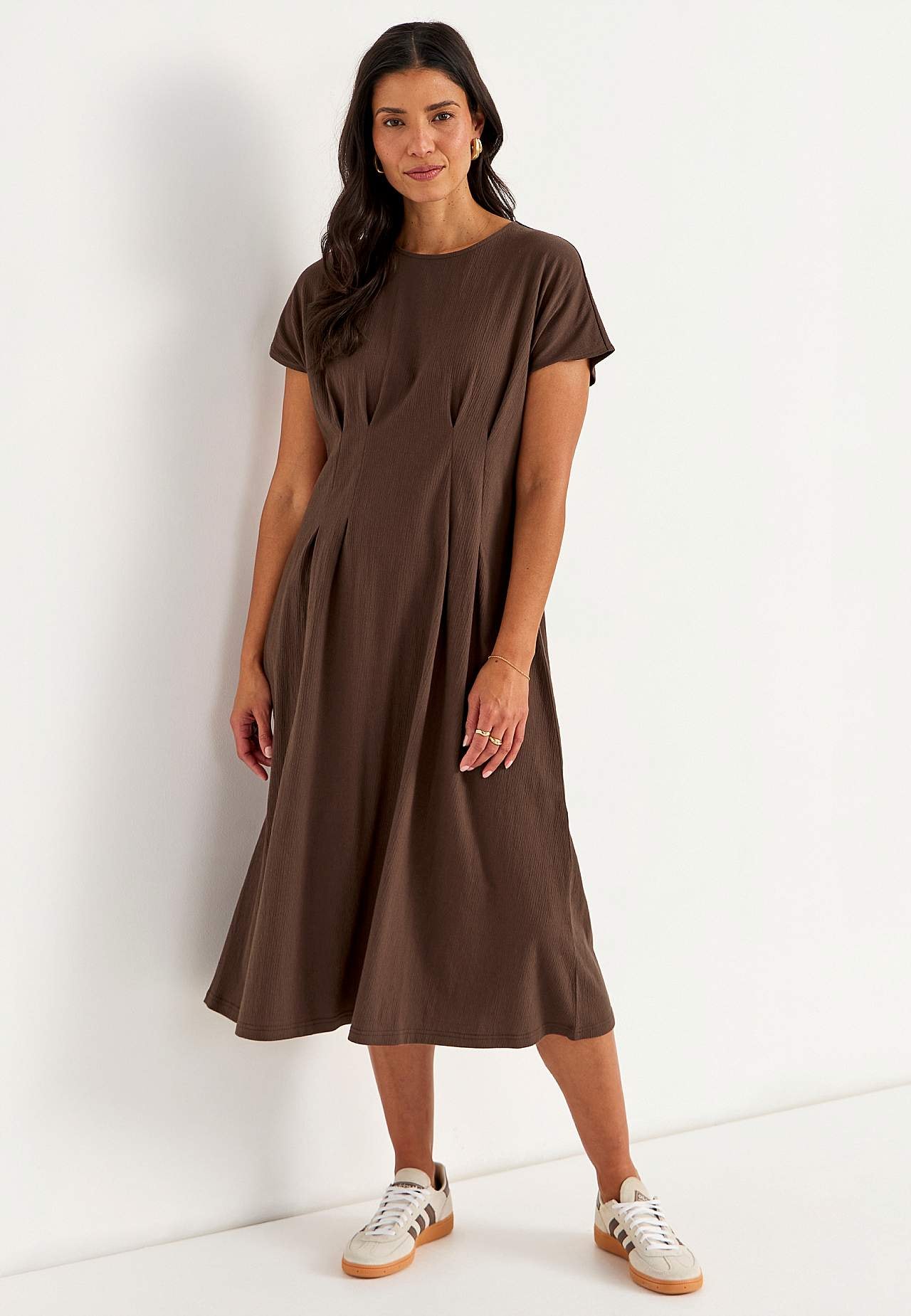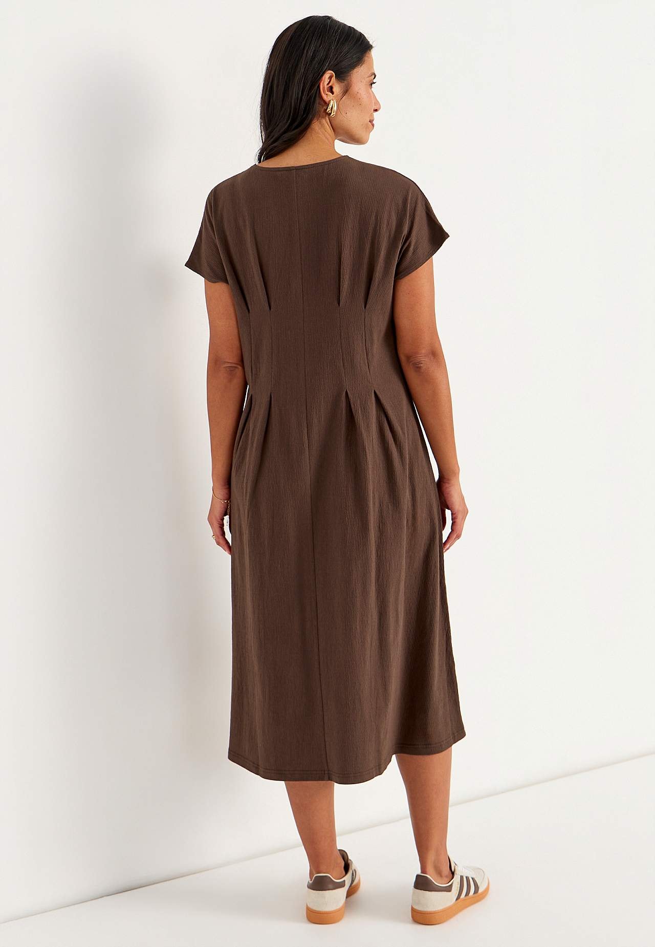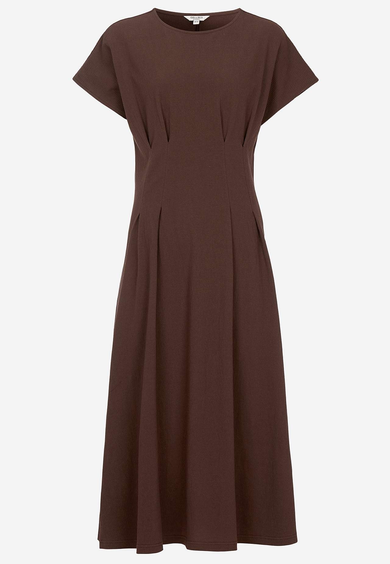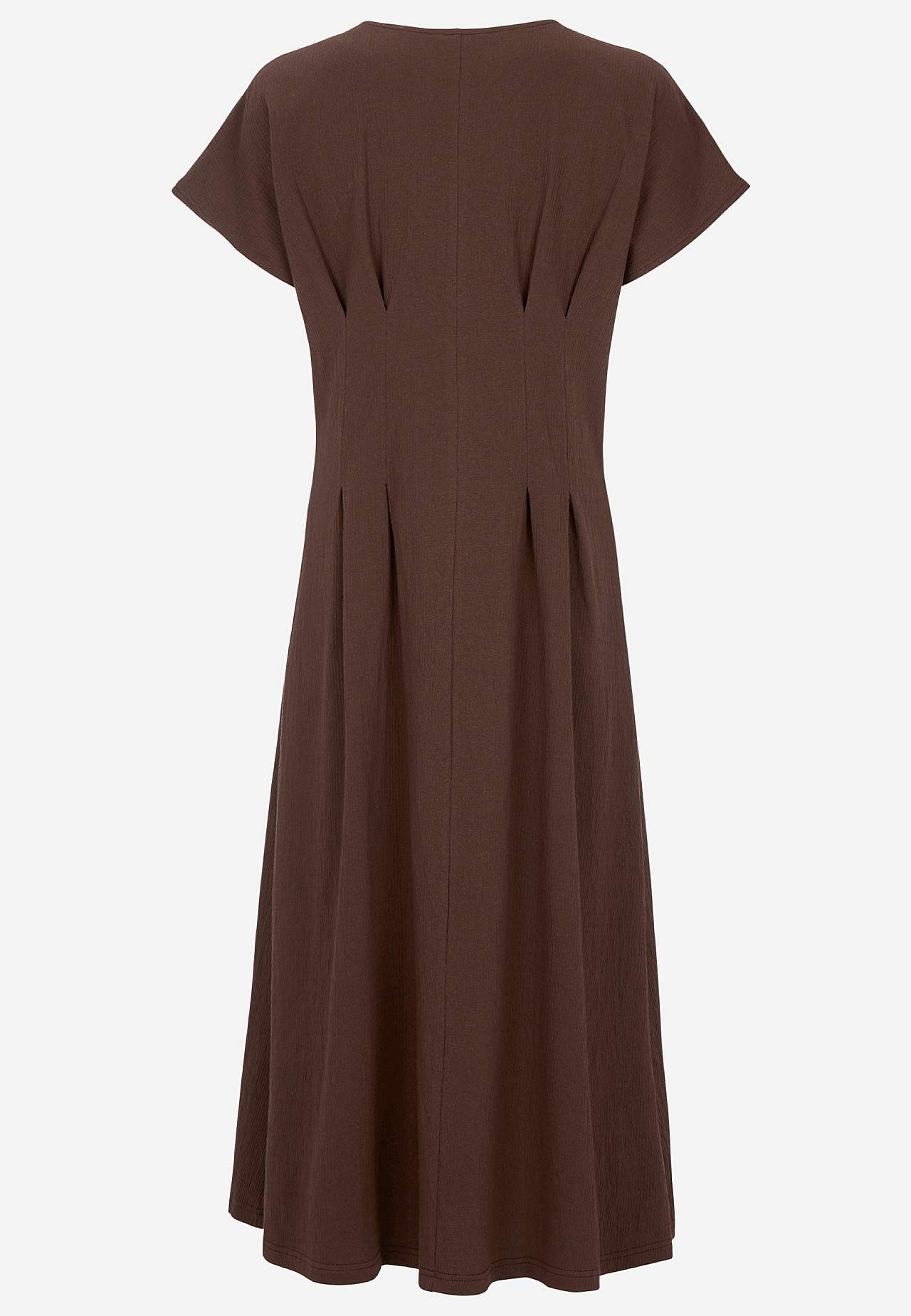 Feminine jersey dress with wavy structure. Soft, stretchy material. Regular fit with flared skirt part. Defined waist with figure flattering dart at both front and back. Rounded neck. Short cap sleeves. Gently rounded hem. Back length is approx. 122 cm in all sizes.