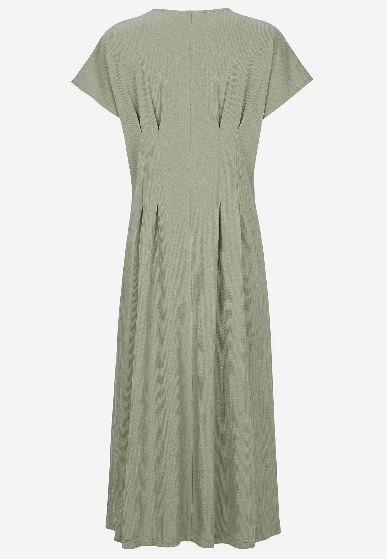 Feminine jersey dress with wavy structure. Soft, stretchy material. Regular fit with flared skirt part. Defined waist with figure flattering dart at both front and back. Rounded neck. Short cap sleeves. Gently rounded hem. Back length is approx. 122 cm in all sizes.