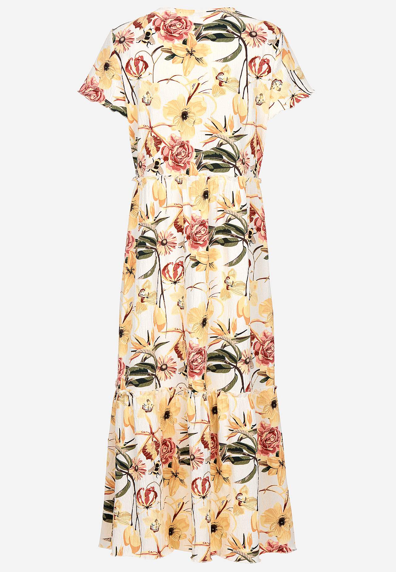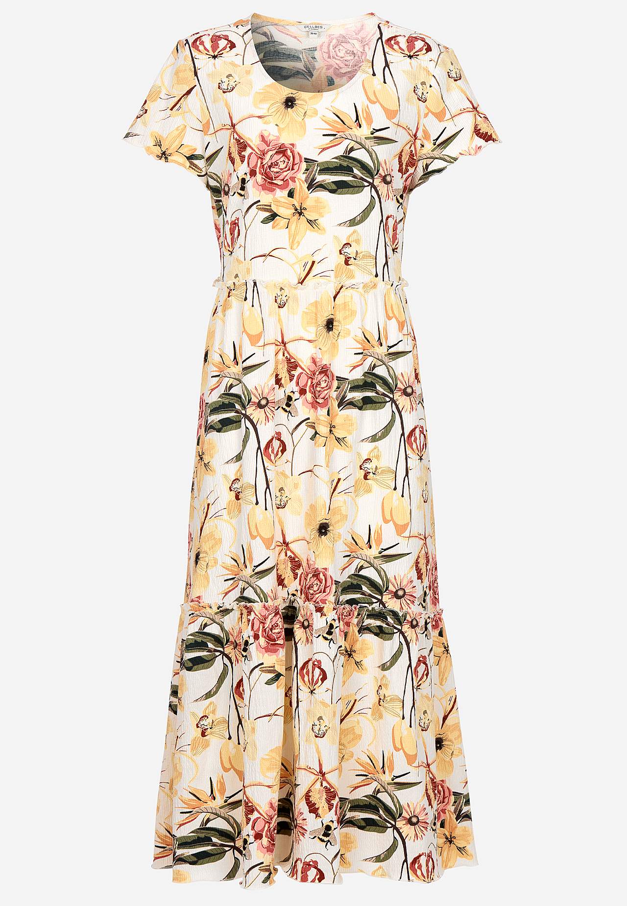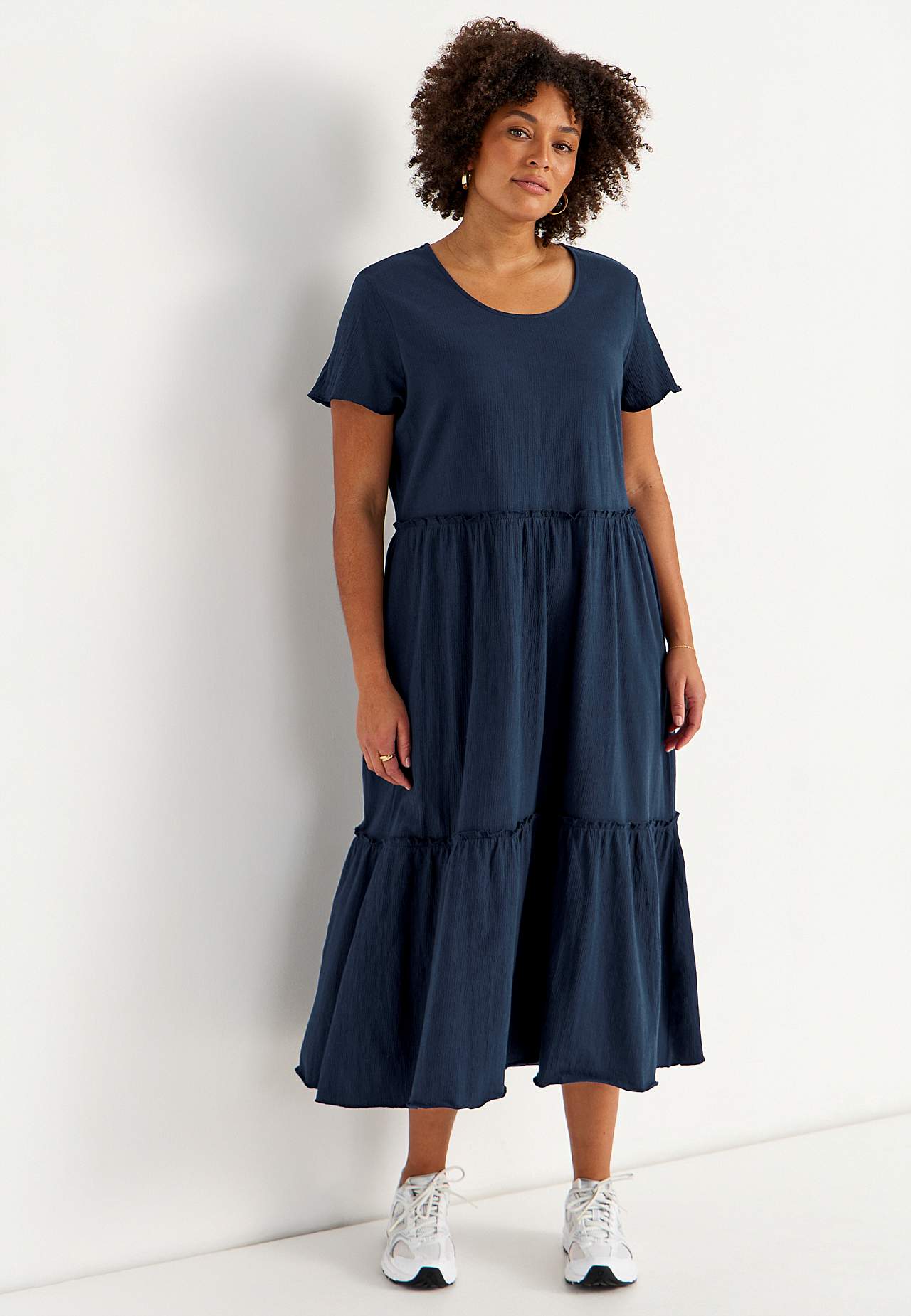 Stretchy, soft flounce dress with wavy structure. Casual, a-lined fit. Skirt part with lovely width. Overlocked, wavy, thin seam at the bottom, on the edge of the frill and at the cuffs. Rounded neck. Short cap sleeves. Gently rounded hem. Back length is approx. 128 cm in all sizes.