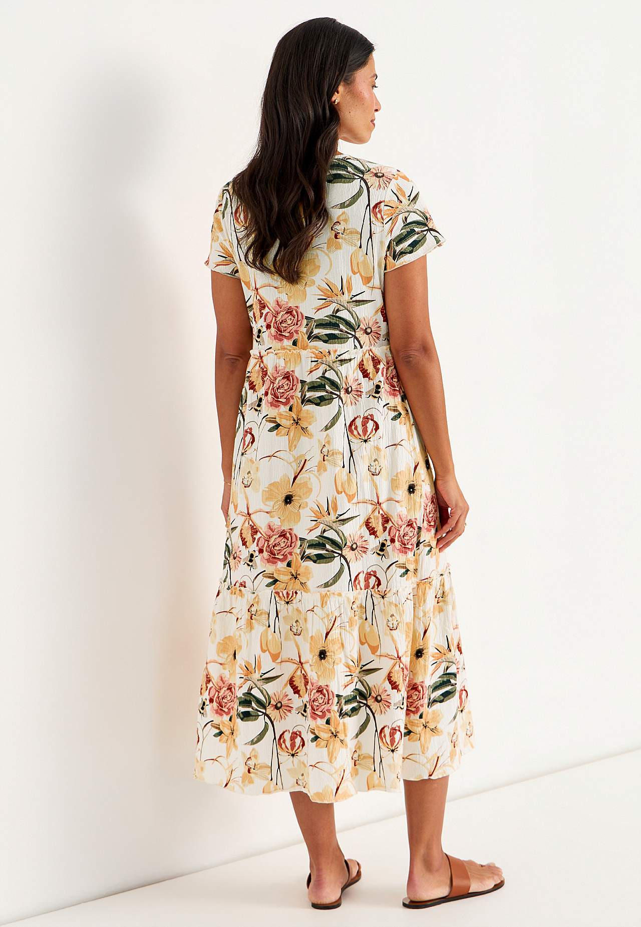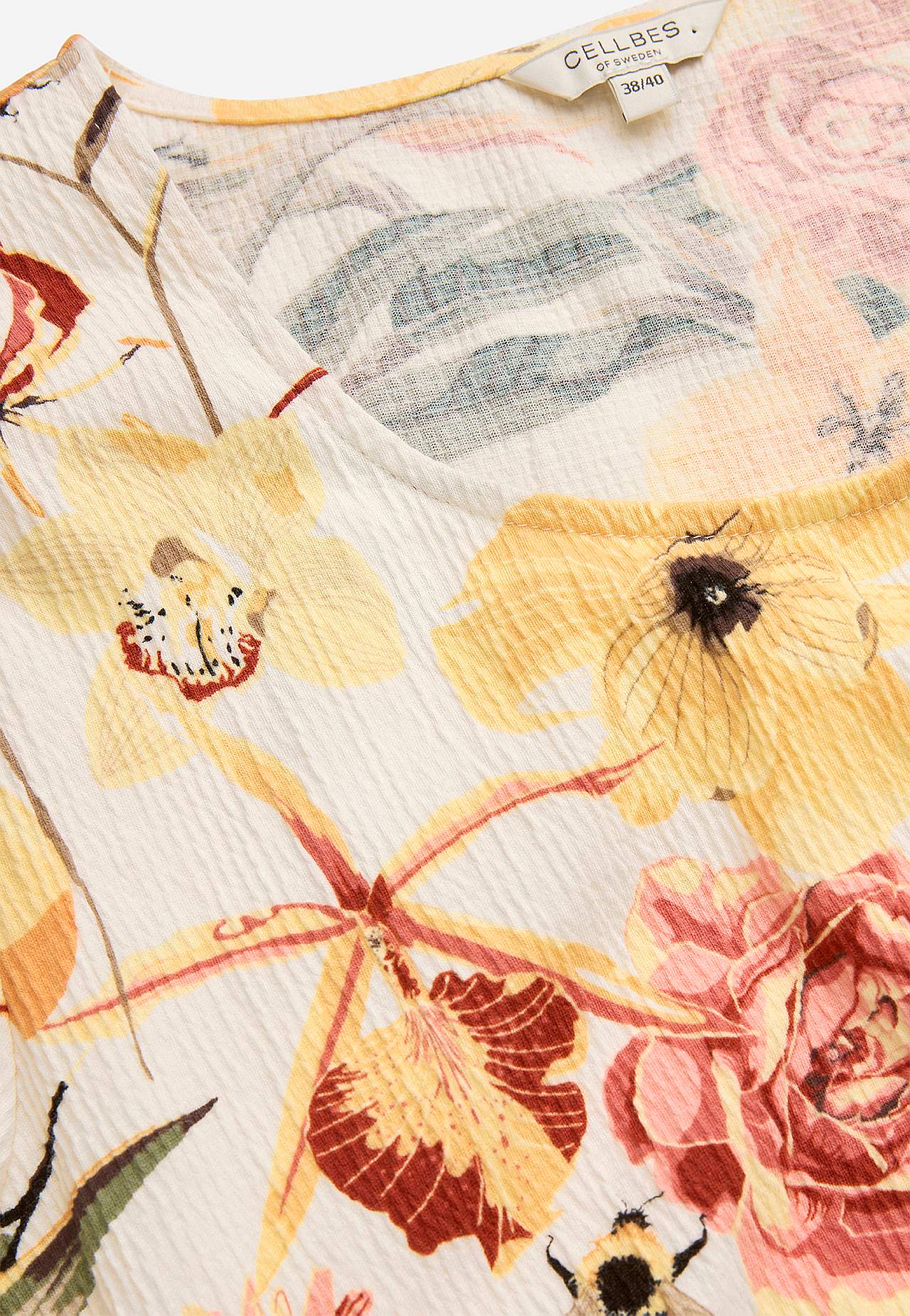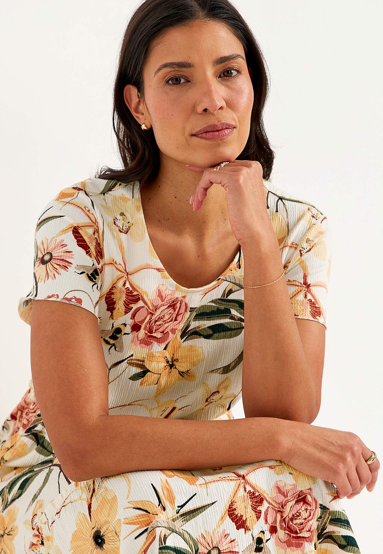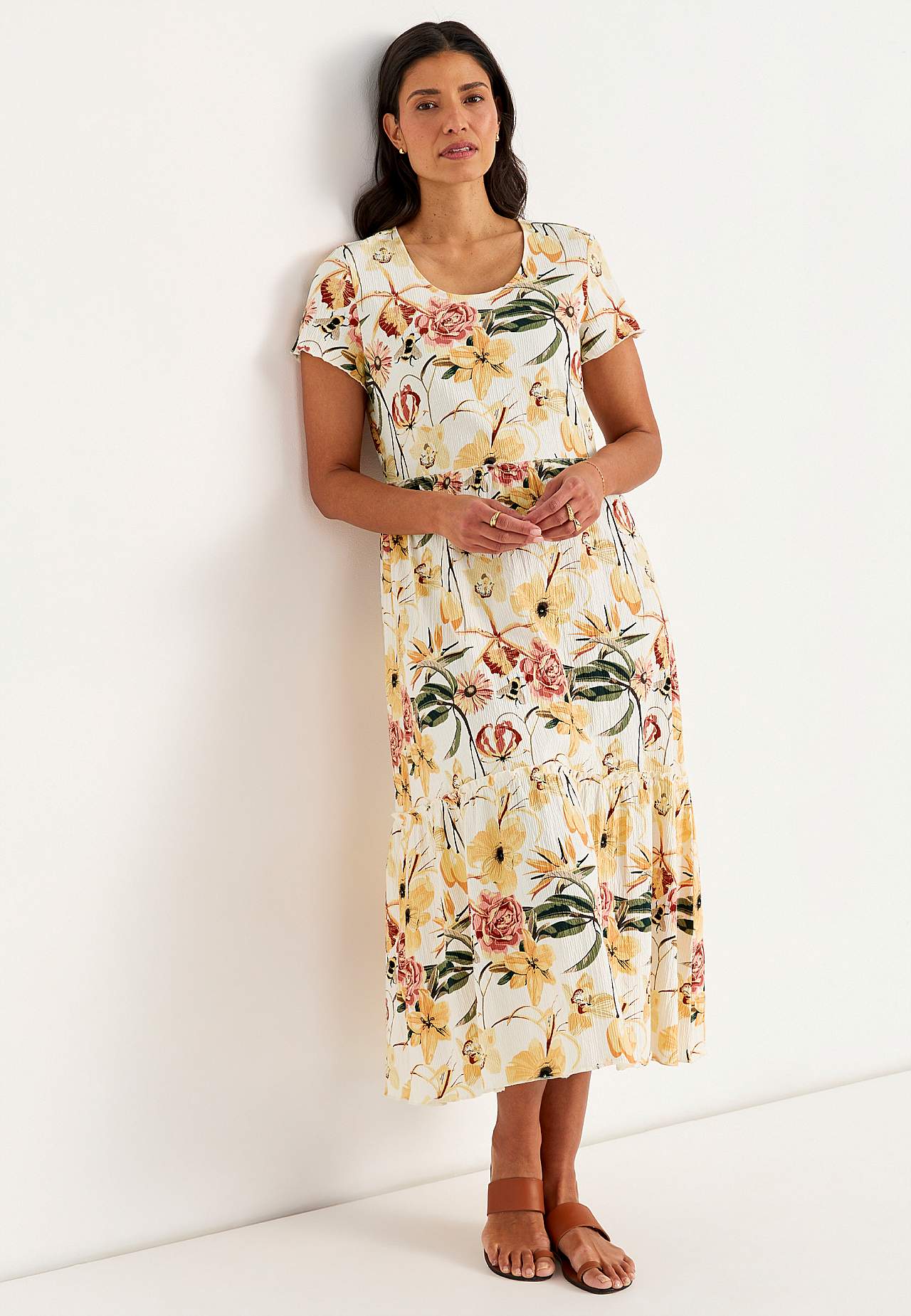 Stretchy, soft flounce dress with wavy structure. Casual, a-lined fit. Skirt part with lovely width. Overlocked, wavy, thin seam at the bottom, on the edge of the frill and at the cuffs. Rounded neck. Short cap sleeves. Gently rounded hem. Back length is approx. 128 cm in all sizes.