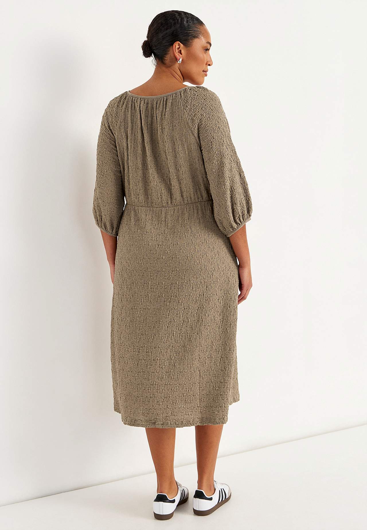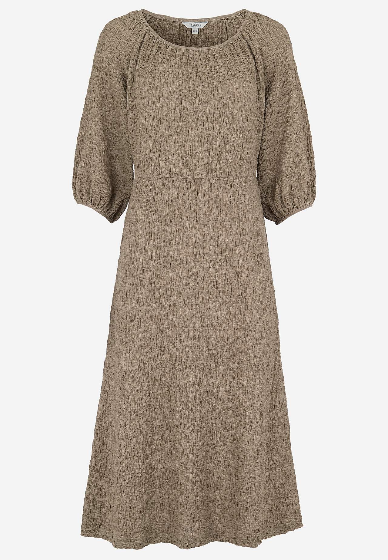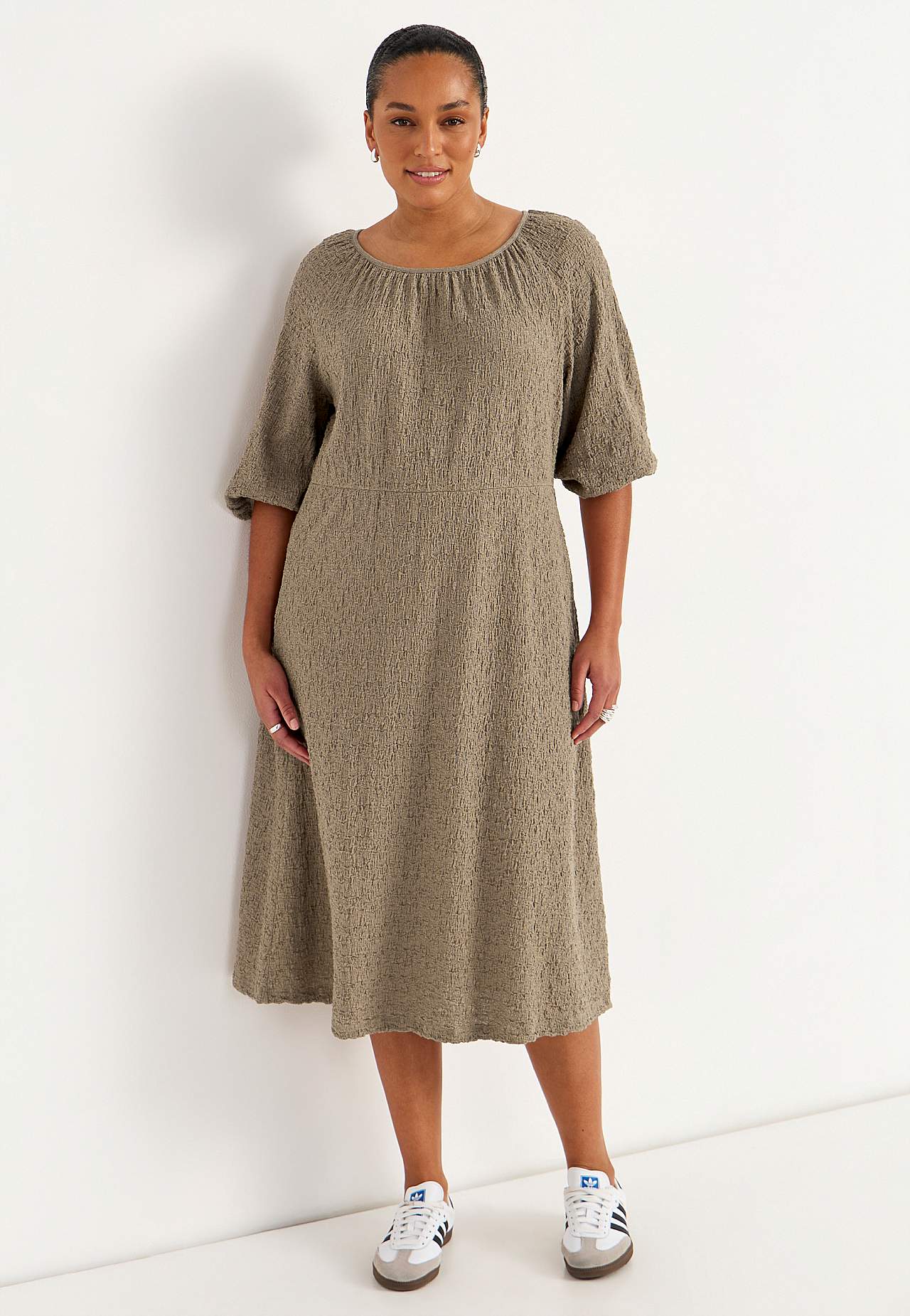 Dress in comfortable, stretchy cotton-blend with structure. Regular fit. Slightly fitted at the top with a more flared skirt. Round, wide neckline with gathering all around. 3/4 length, wide raglan sleeves with gathering and thin binding on the sleeve ends. Seam at the waist with hidden elastic seam and gathering at the bac... Read more