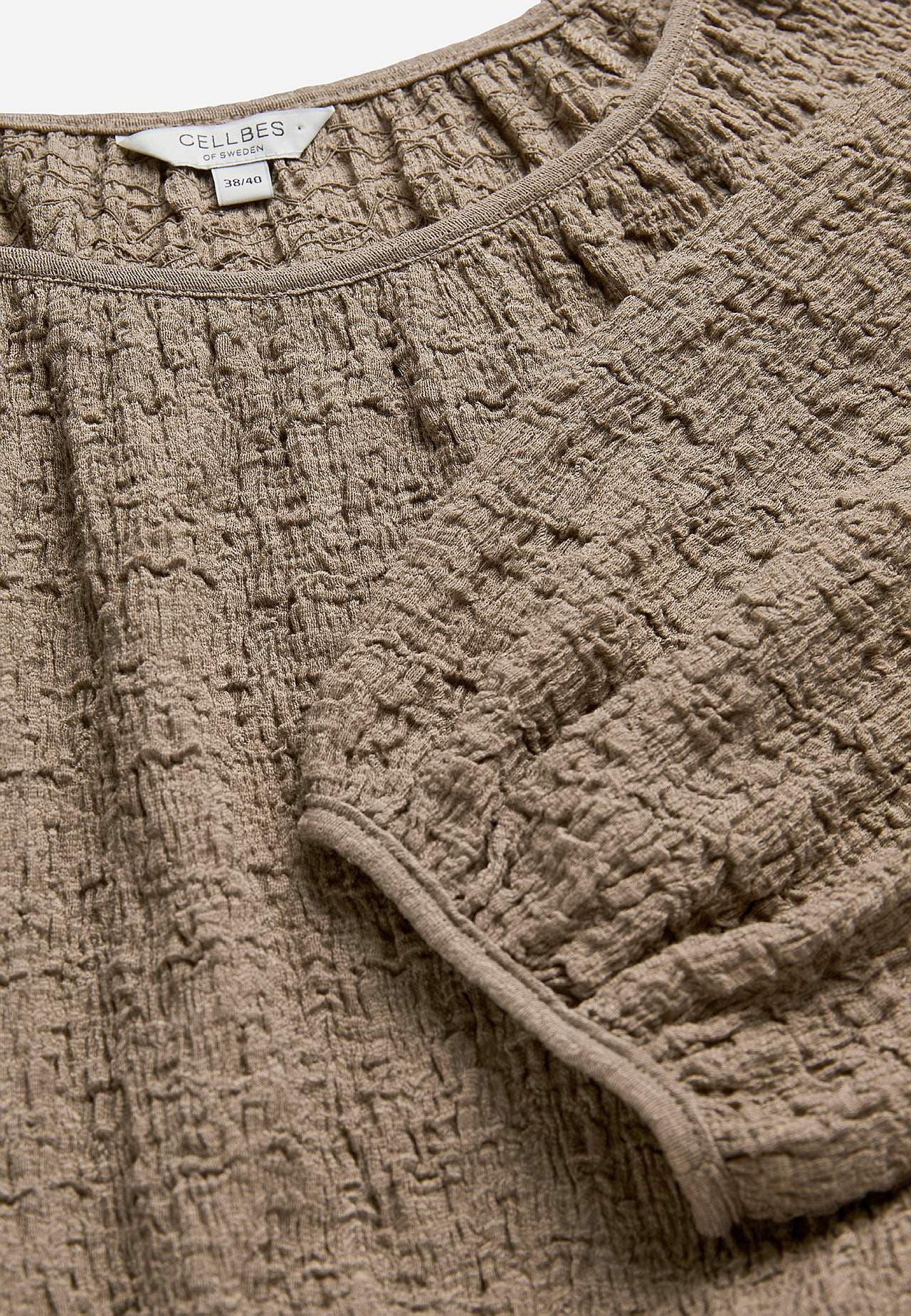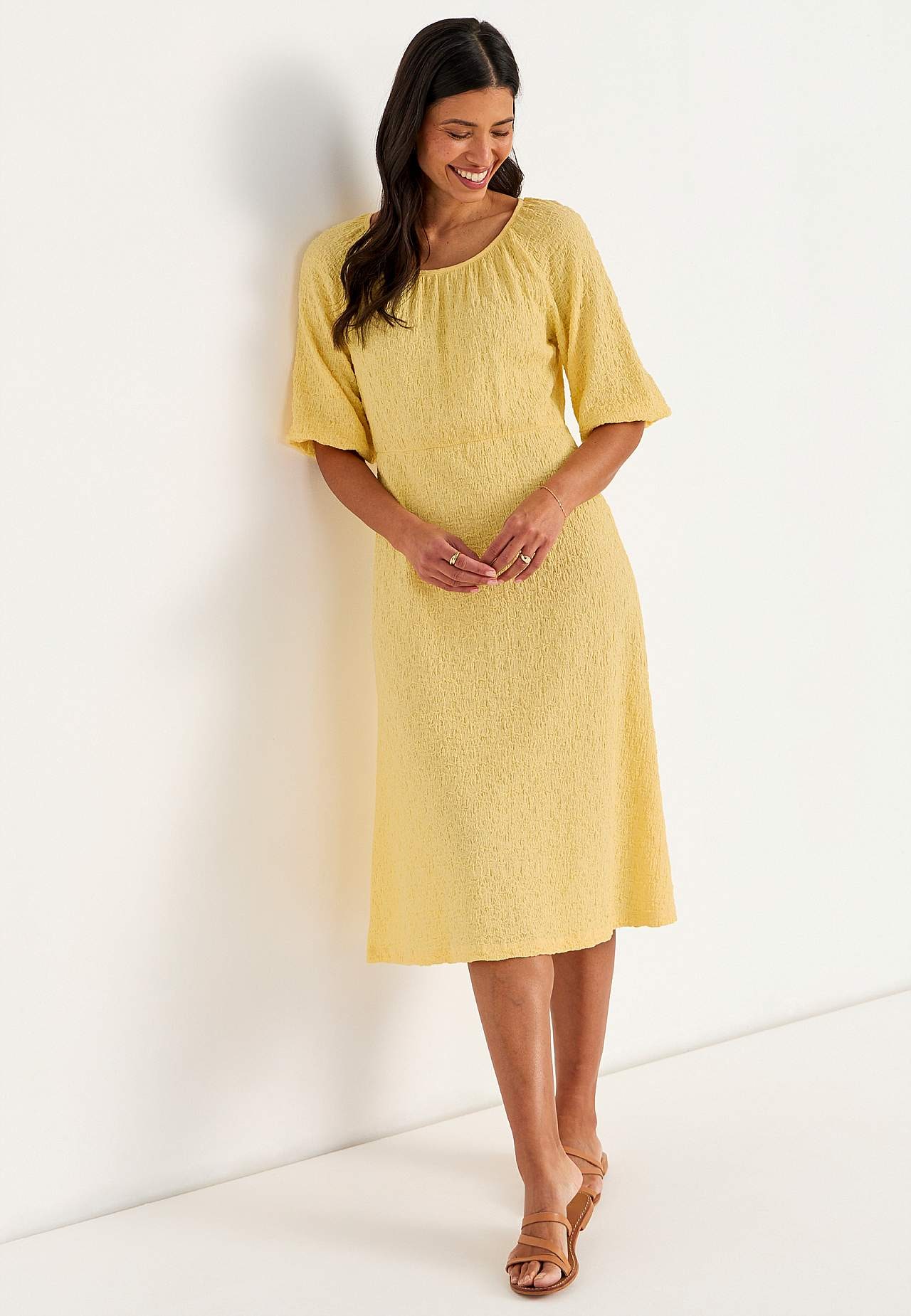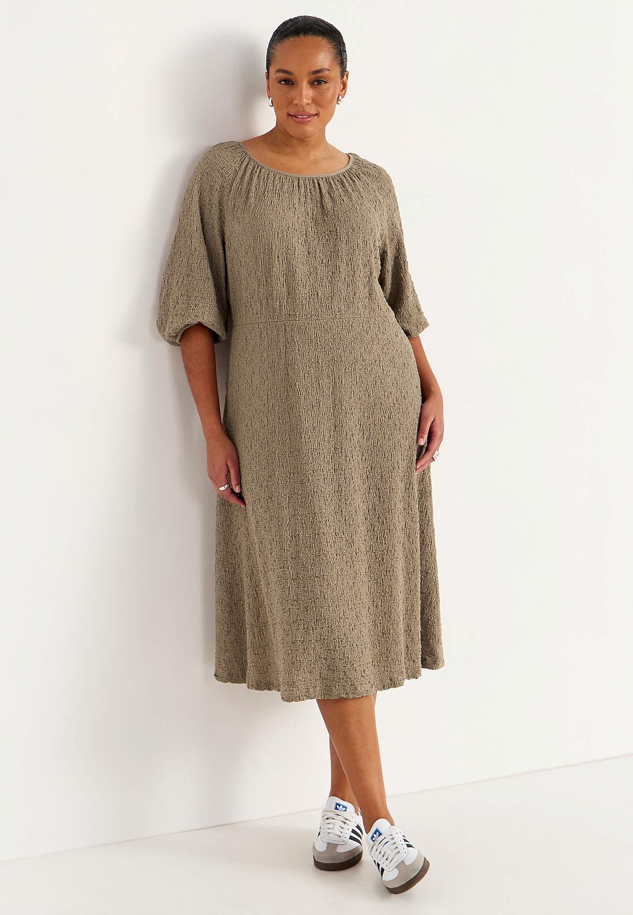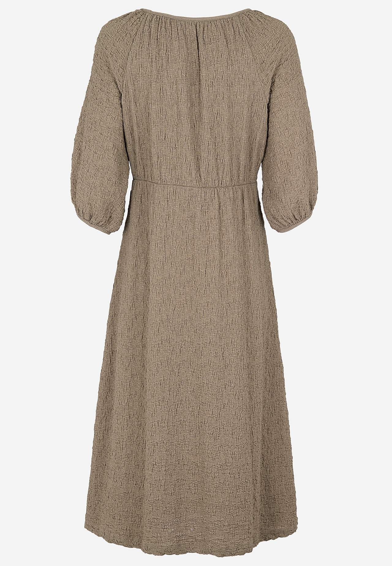 Dress in comfortable, stretchy cotton-blend with structure. Regular fit. Slightly fitted at the top with a more flared skirt. Round, wide neckline with gathering all around. 3/4 length, wide raglan sleeves with gathering and thin binding on the sleeve ends. Seam at the waist with hidden elastic seam and gathering at the bac... Read more