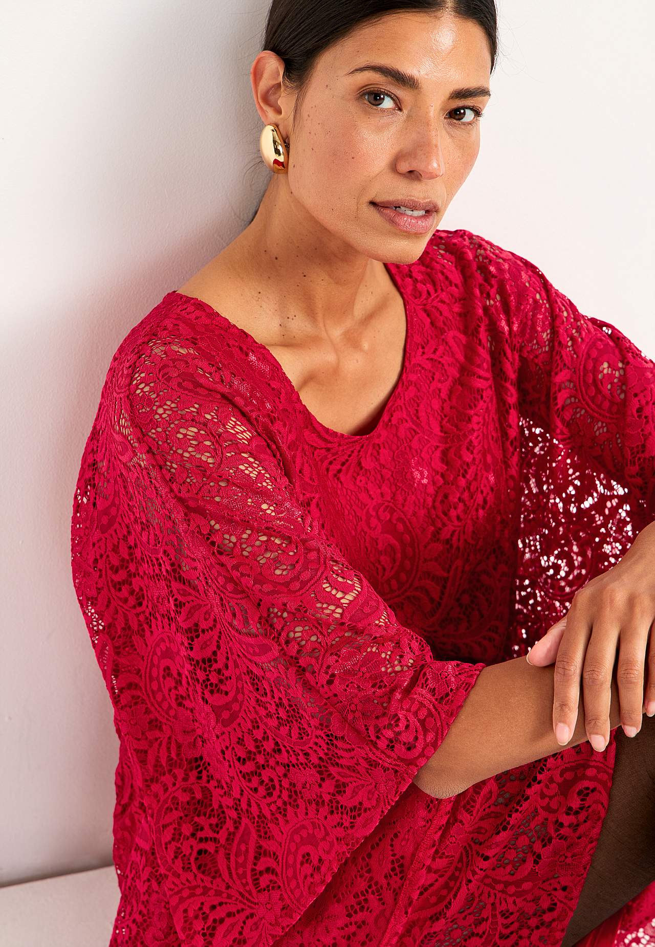 Airy kaftan design with stretch. Stretchy jersey lining with tight fit. Model with round neck. Wide, half-length, unlined sleeves. The back length varies with size: approx. 94-106 cm.