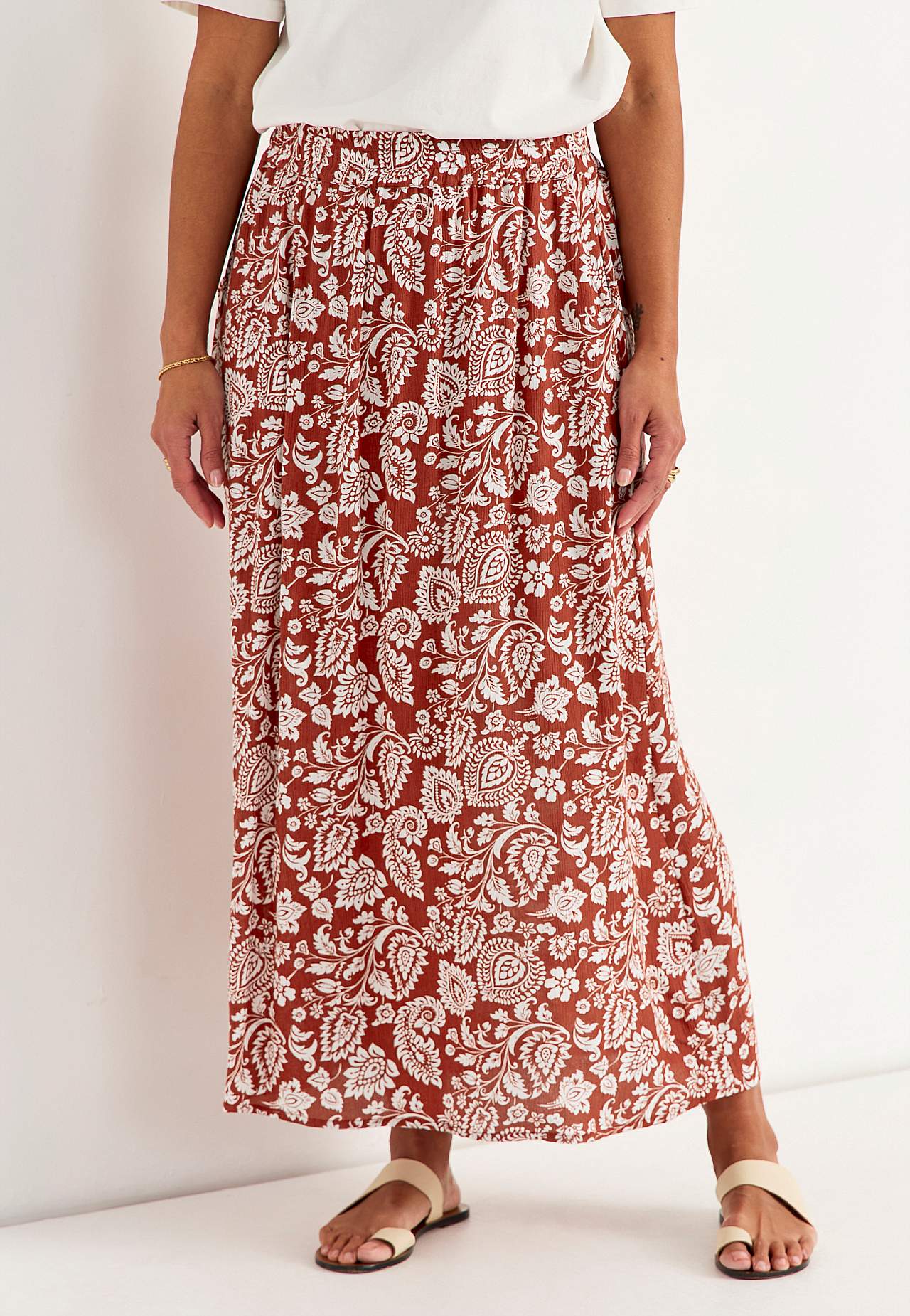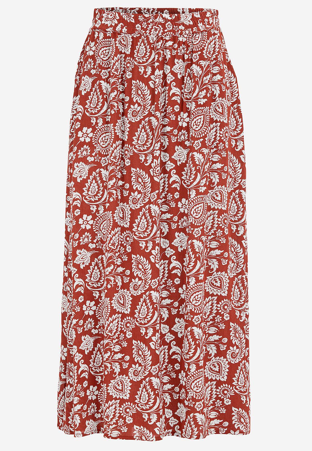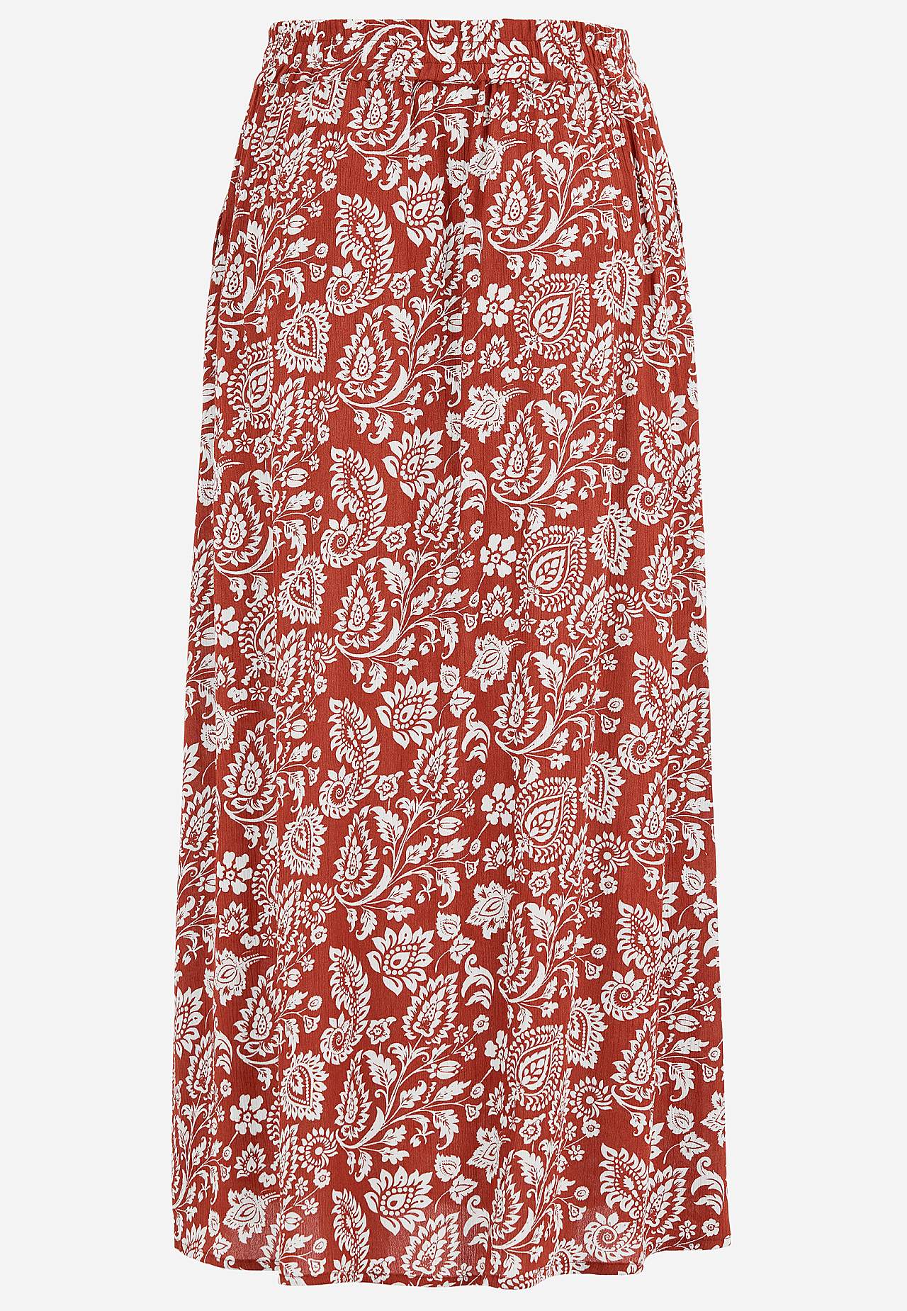 Long, woven viscose skirt with pockets. Crepe material with a matte finish and fine texture. Soft and draping with a cool feel. Broad, soft elastic waistband. Slant pockets at the front. Straight hem. Combine with 702443. Length: 95 cm.
