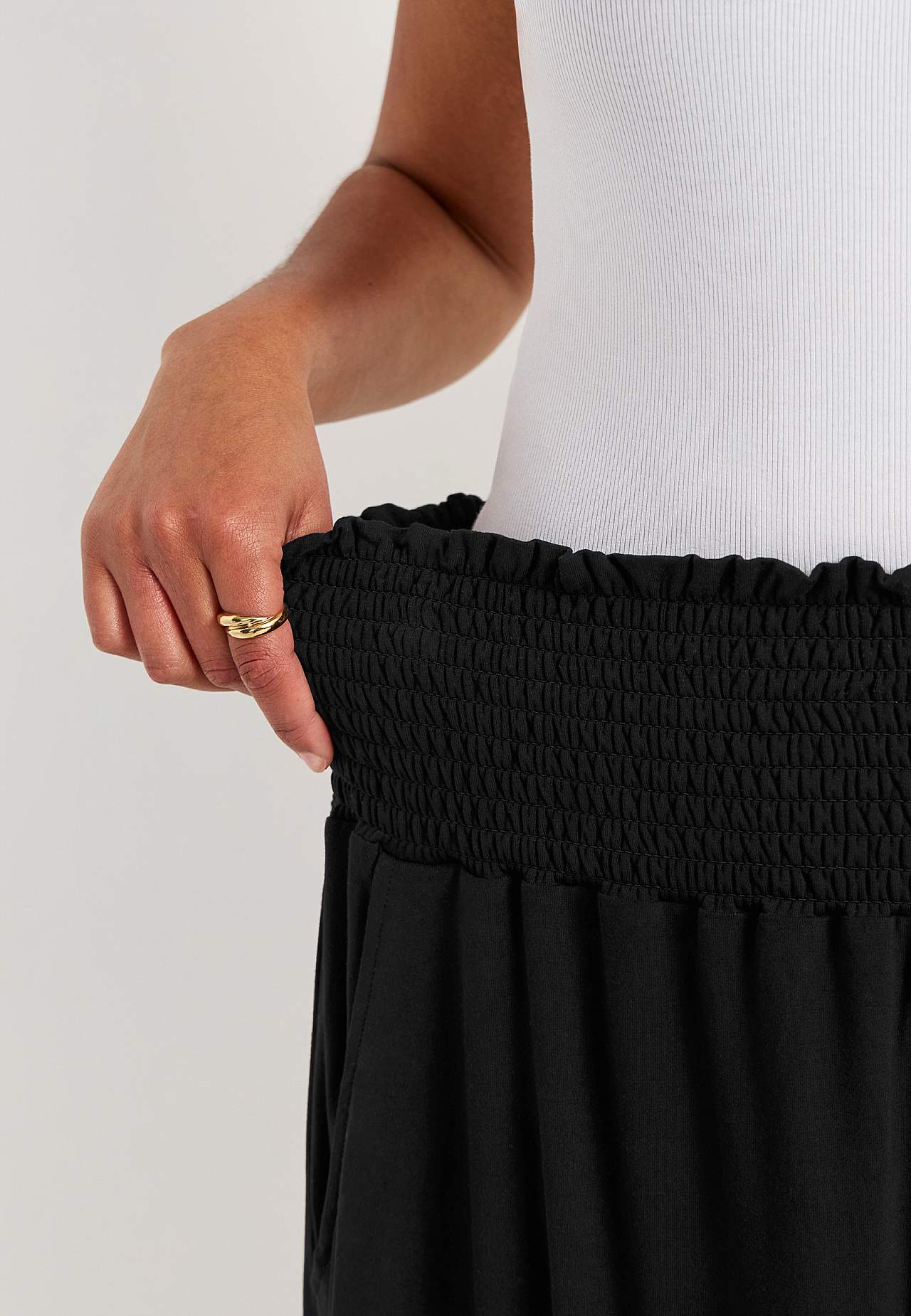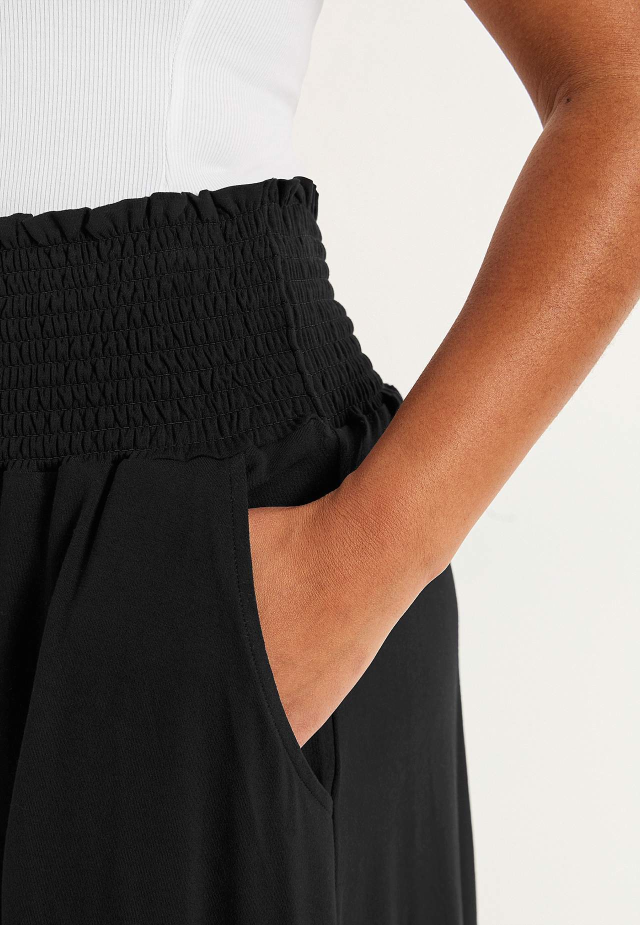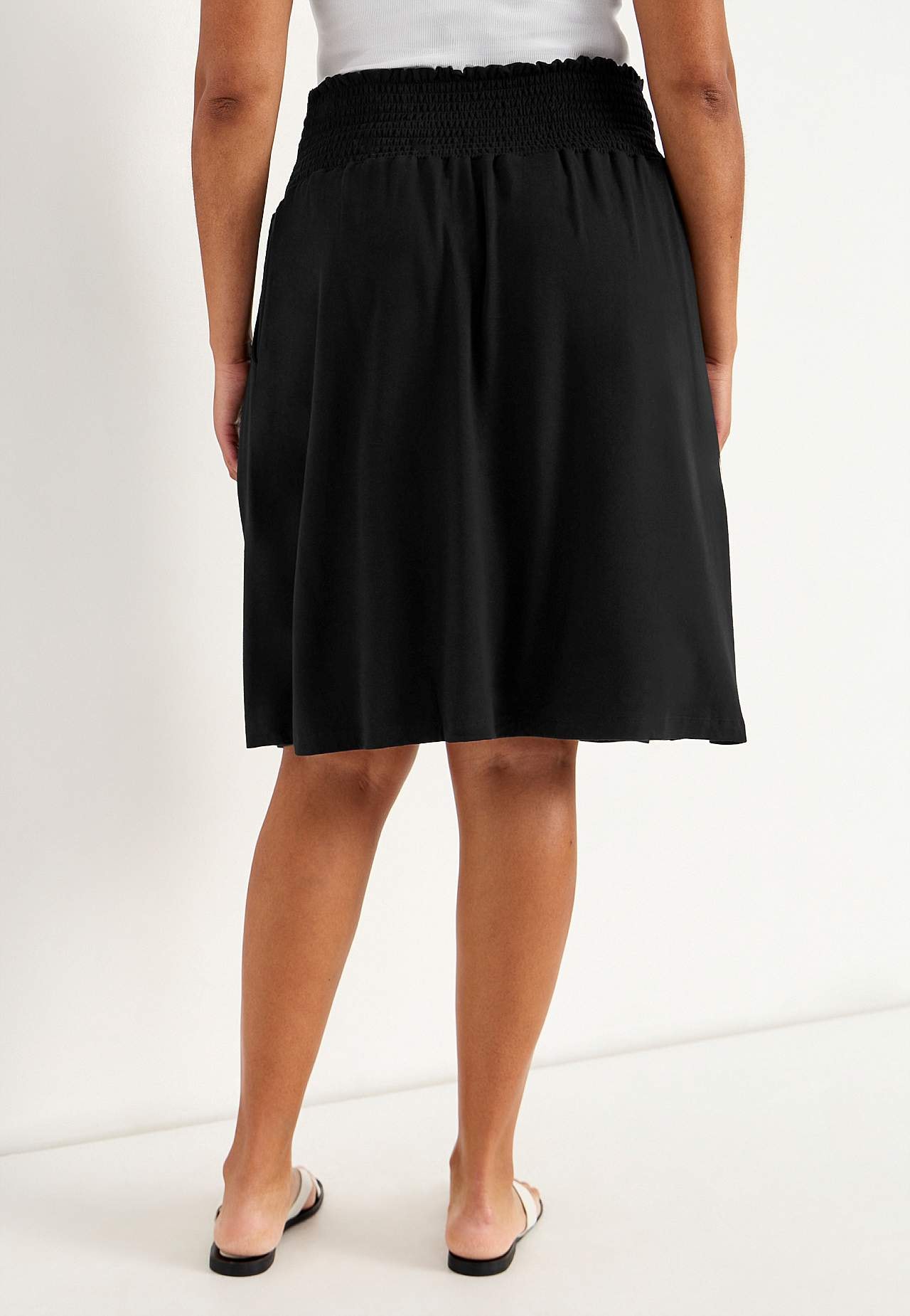 Flared skirt in soft, smooth jersey. Wide fit. Wide, comfortable smocking at the waist. Pockets at the sides. Straight hem. The length varies with size: about 60-62 cm.