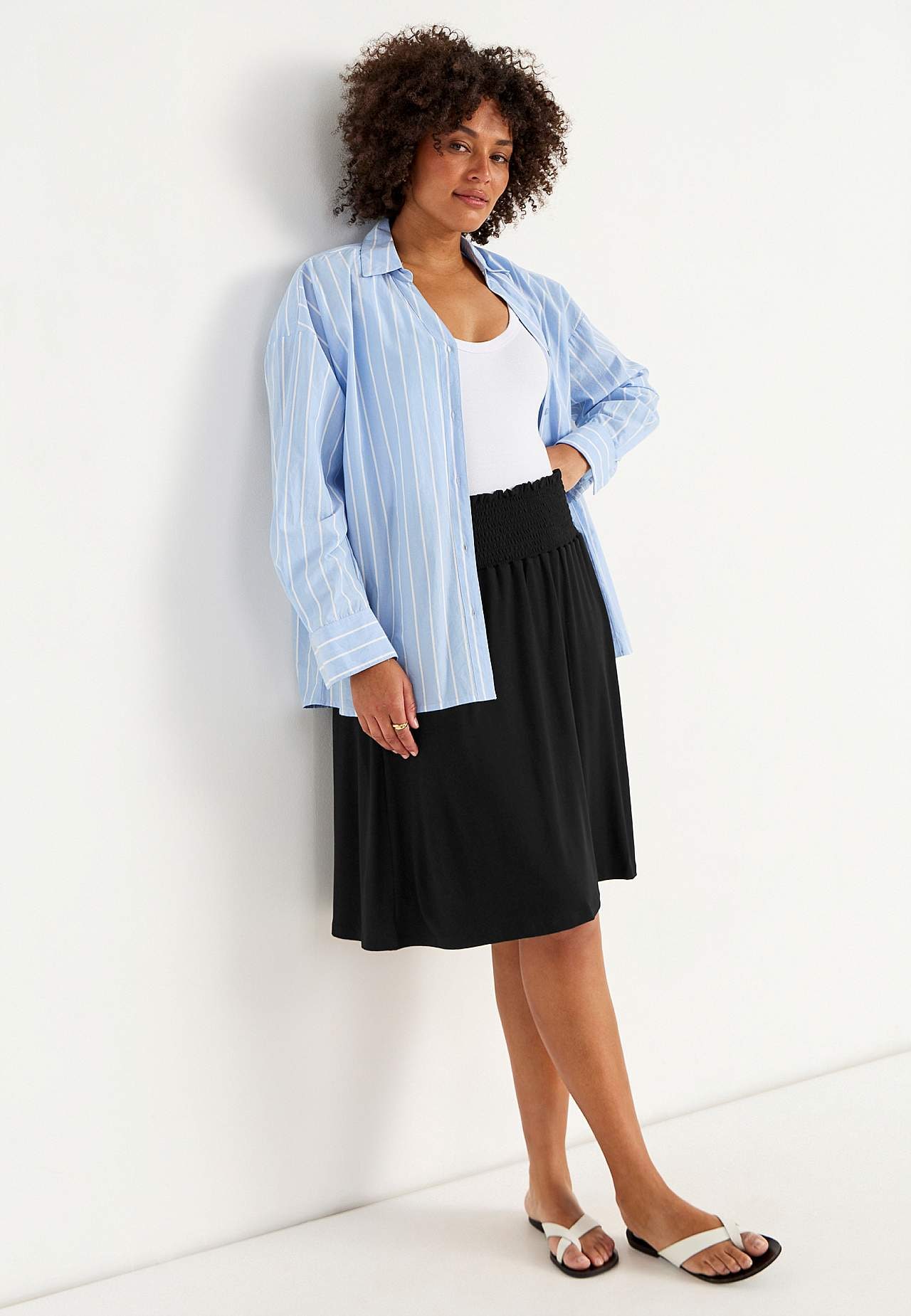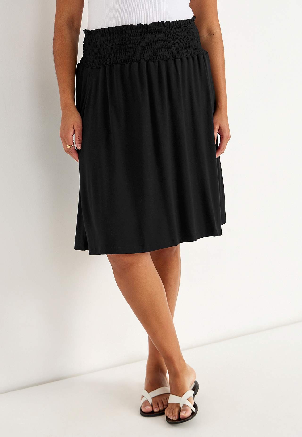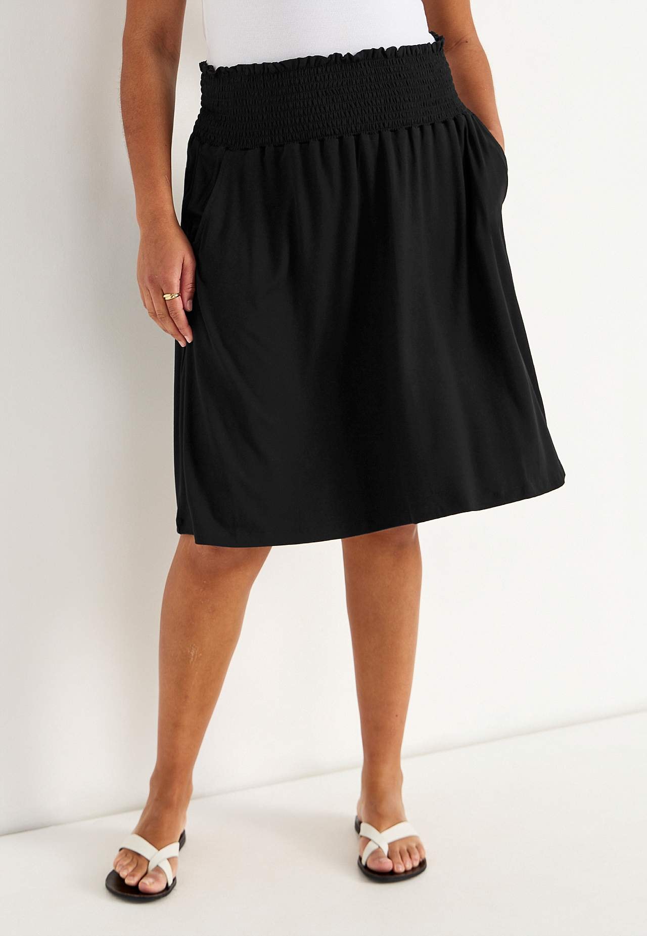 Flared skirt in soft, smooth jersey. Wide fit. Wide, comfortable smocking at the waist. Pockets at the sides. Straight hem. The length varies with size: about 60-62 cm.