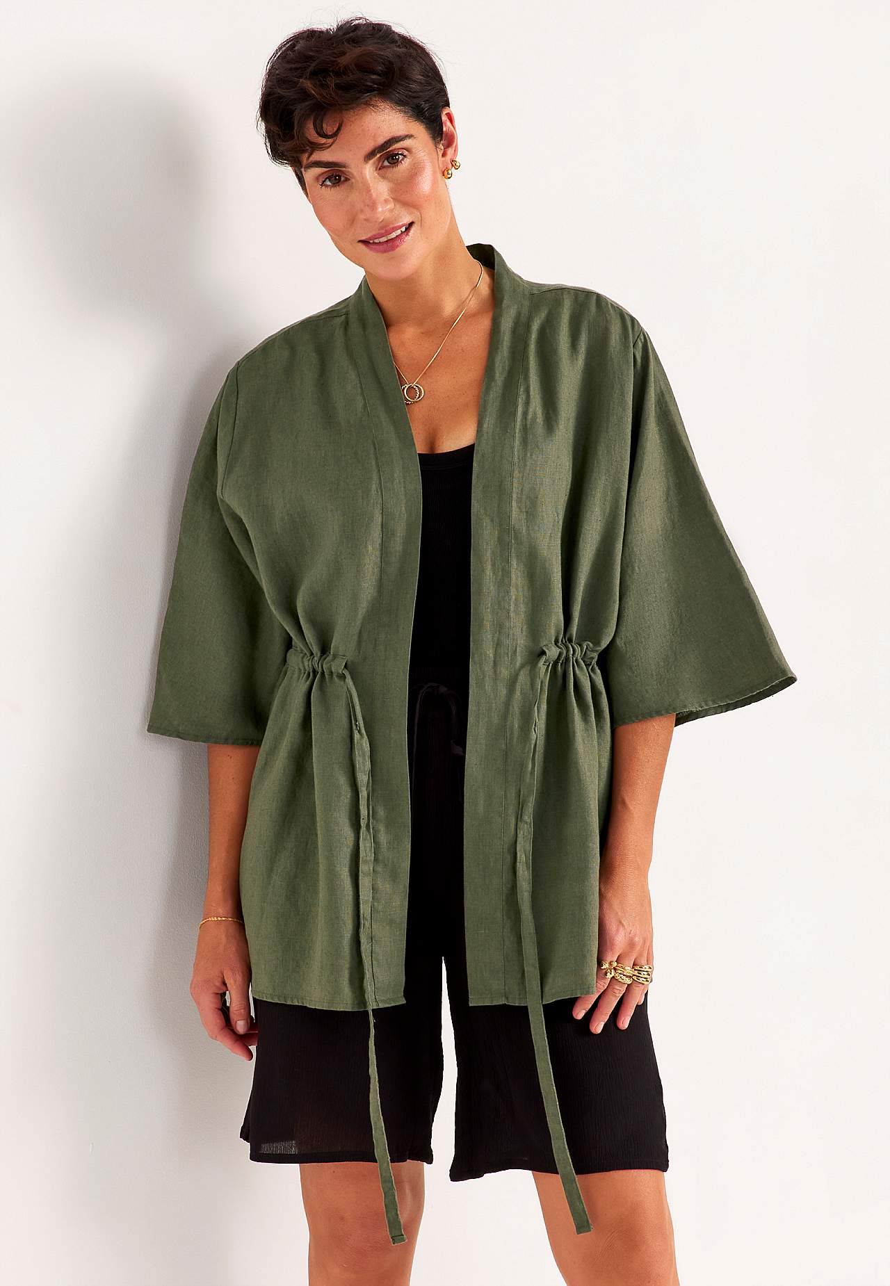 Timeless kimono jacket in airy, cooling linen. Oversized, relaxed fit. Open model with drawstring at the waist with adjustable tie band. Nice to wear open or tied at the waist. Kaftan sleeve with lovely width. Straight hem. The back length varies with size: approx. 71-78 cm.