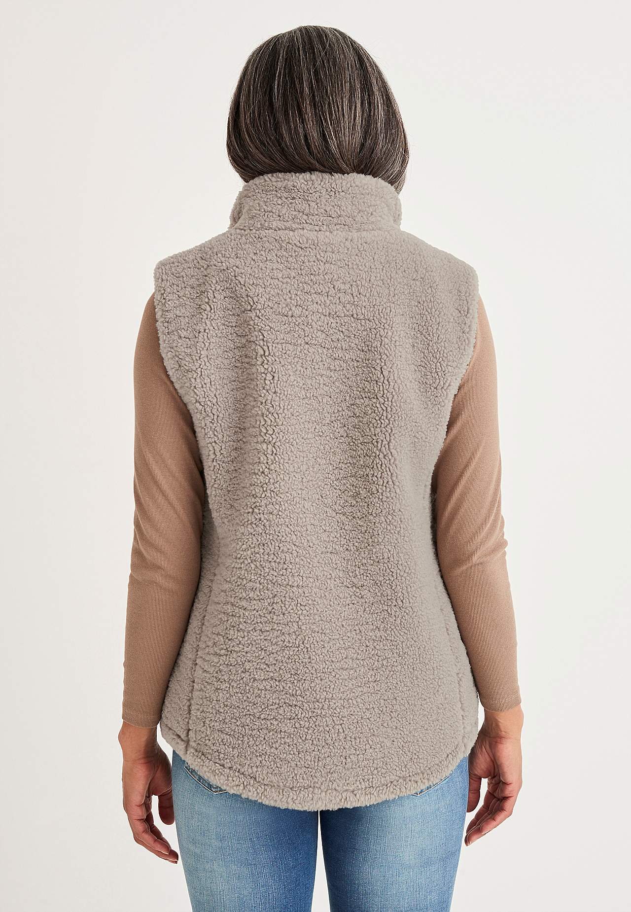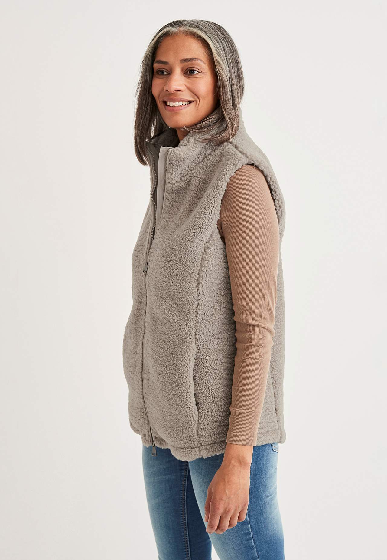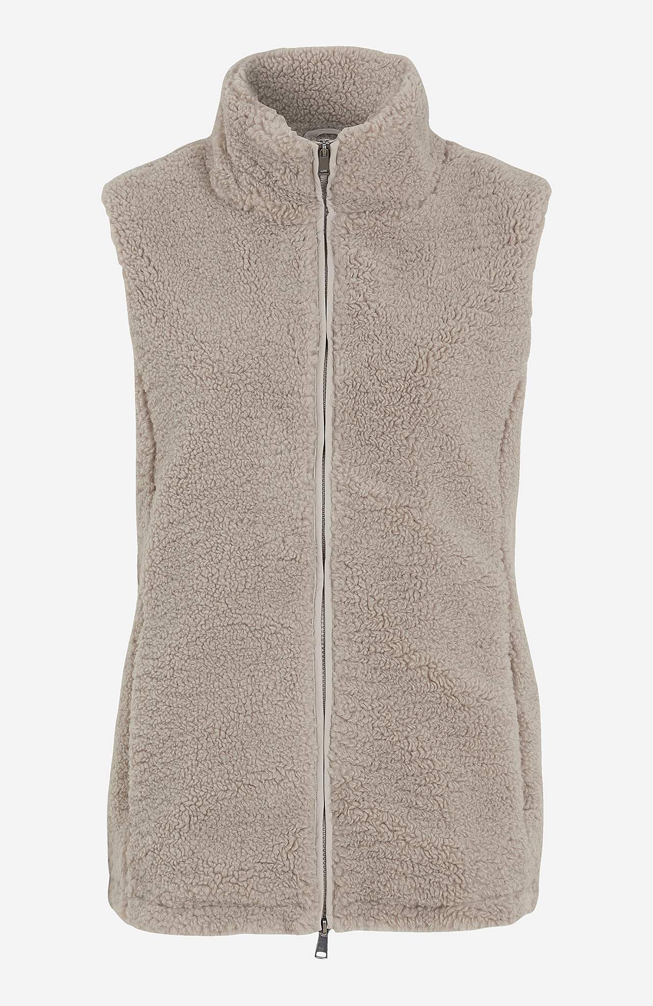 Waistcoat in soft pile with high-top collar. Two-way zip with pockets at front. The length varies with size: about 72-80 cm from the shoulder.