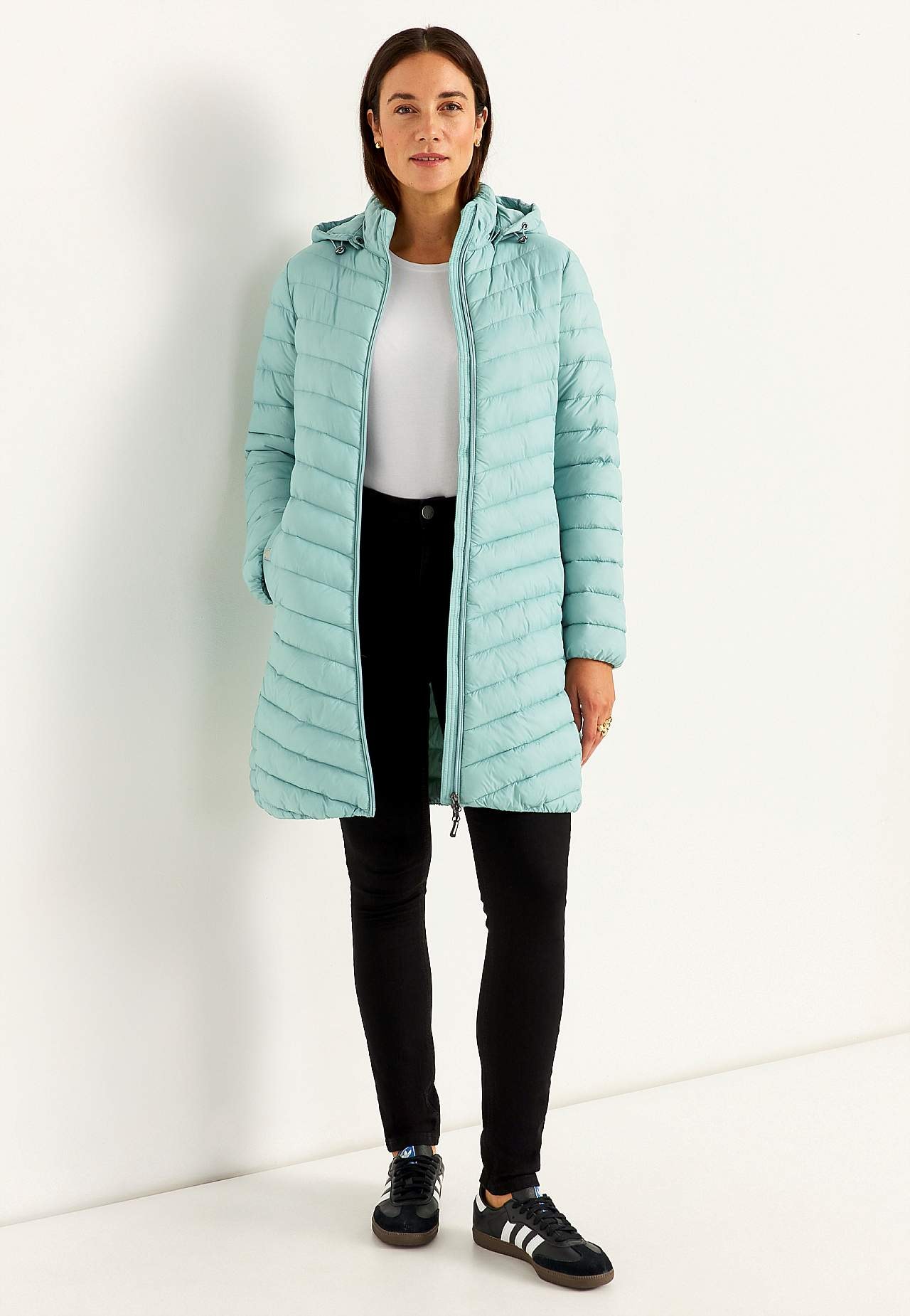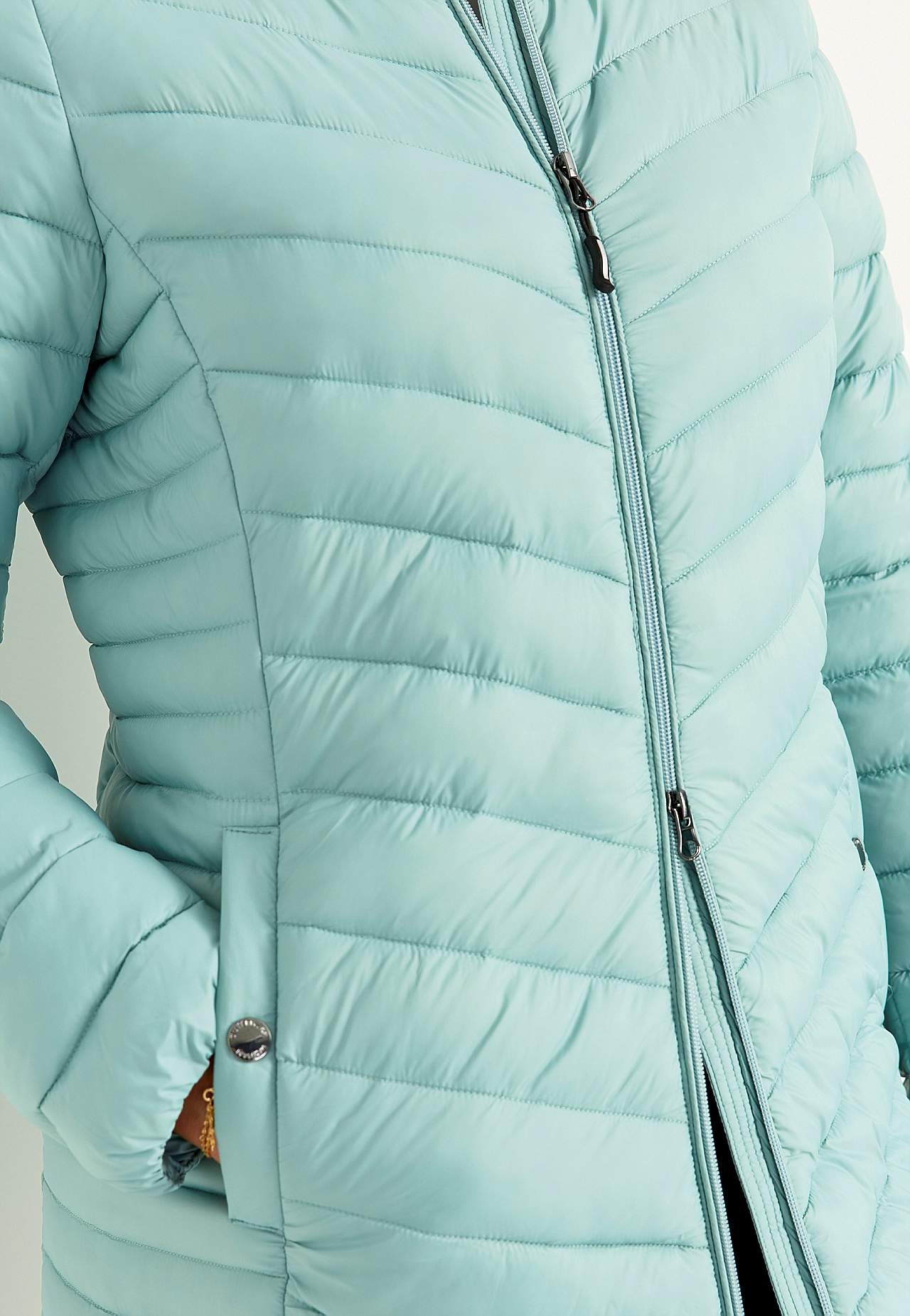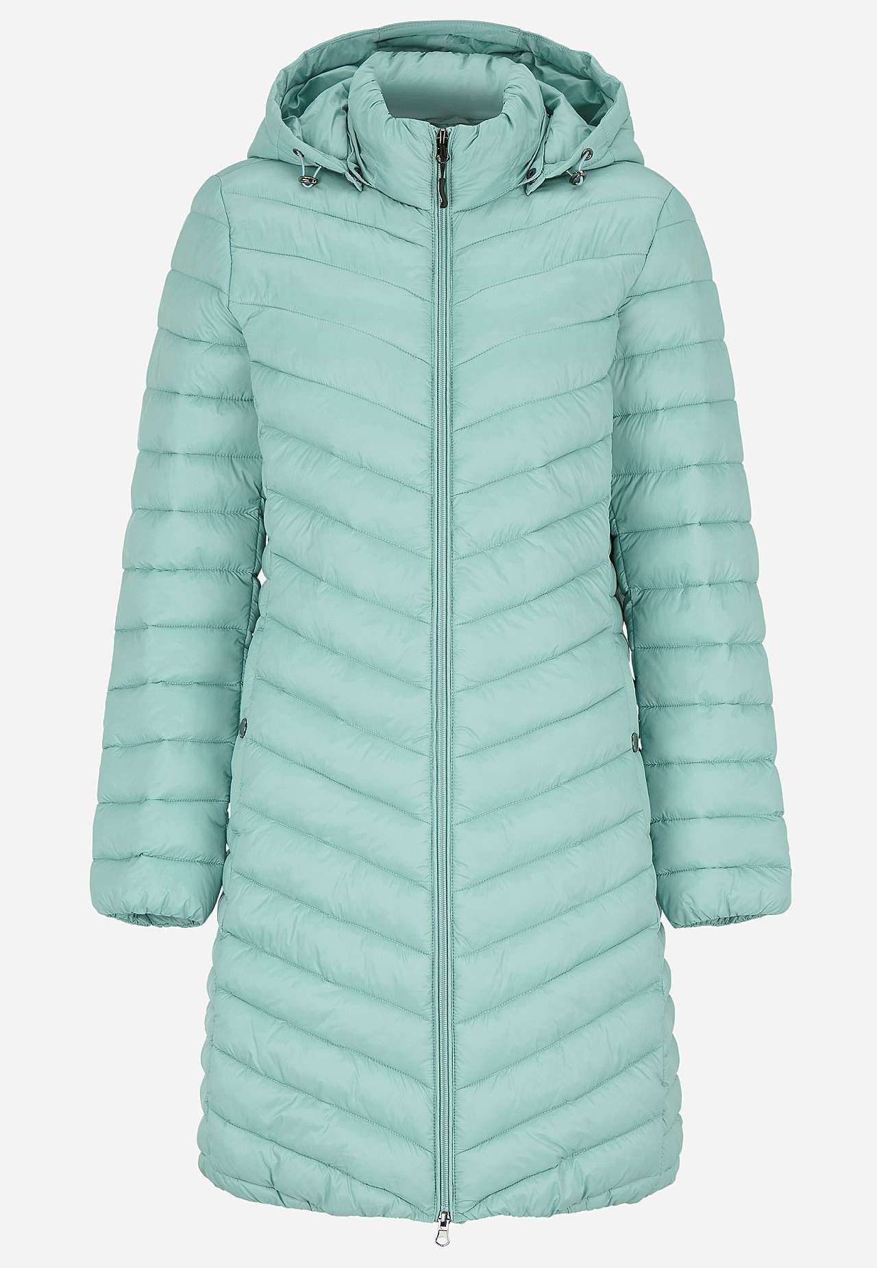 Long lightweight jacket with two-way zip and detachable hood. Light weight jacket with down feel and practical two-way zip. Slightly longer model for wearing a warming layer under a shell jacket. Comfortable stand collar. Detachable hood with drawstring and stopper. Pockets with snap button. Elastic at the bottom hem and s... Read more