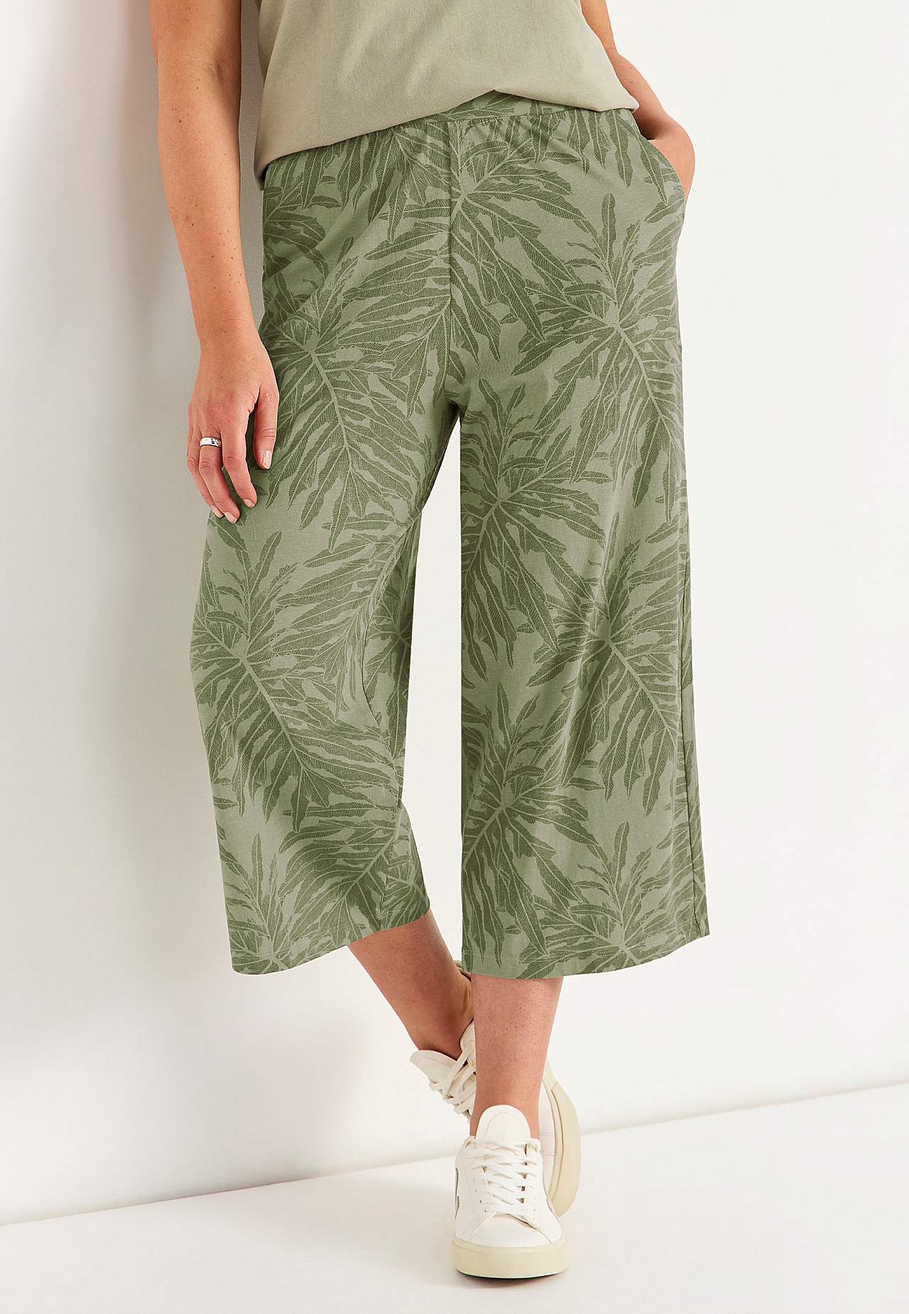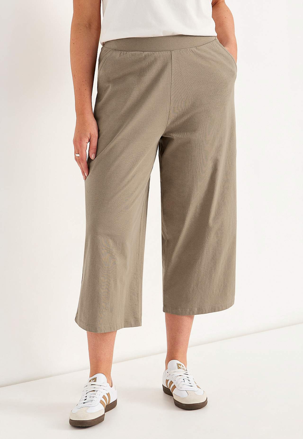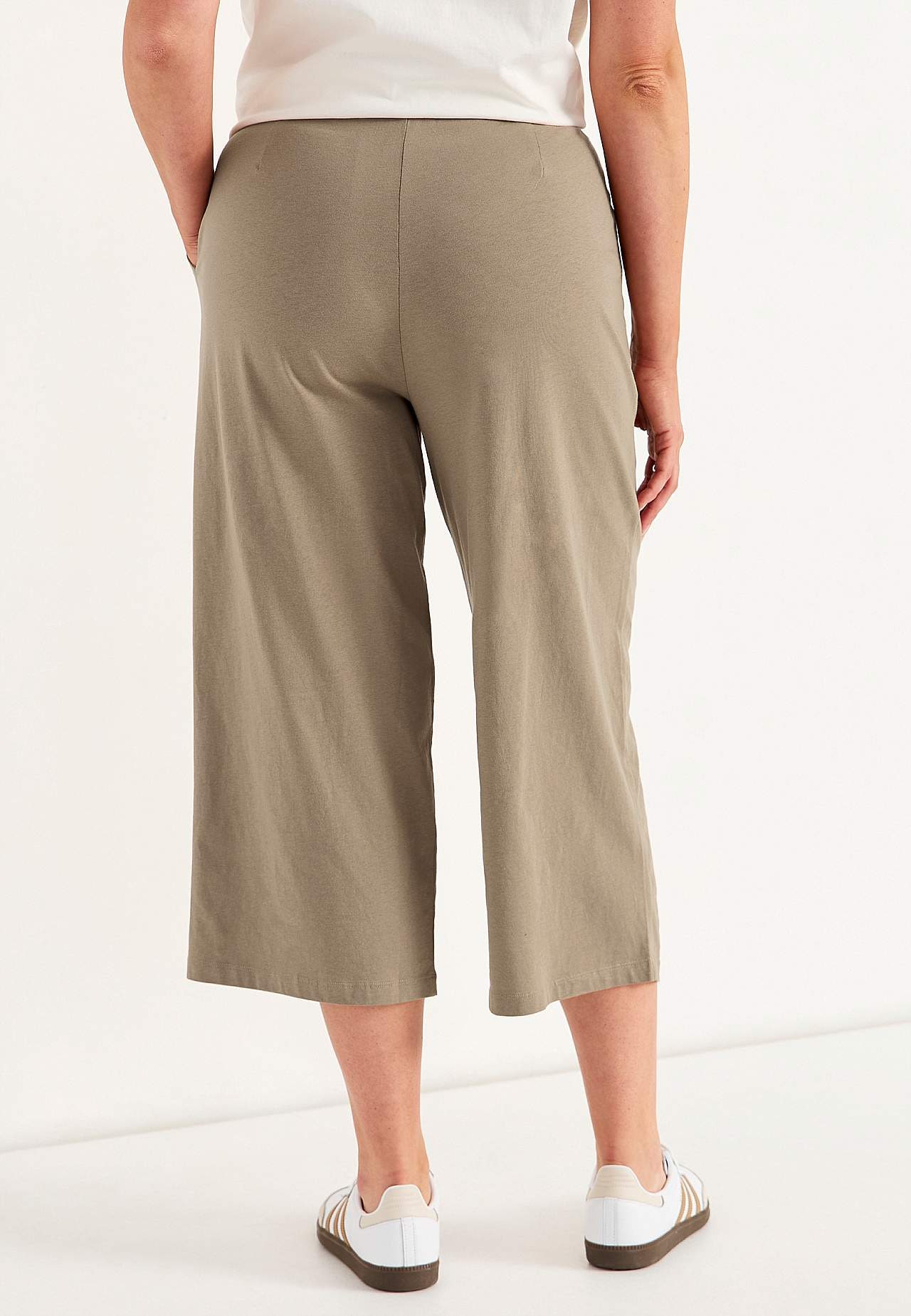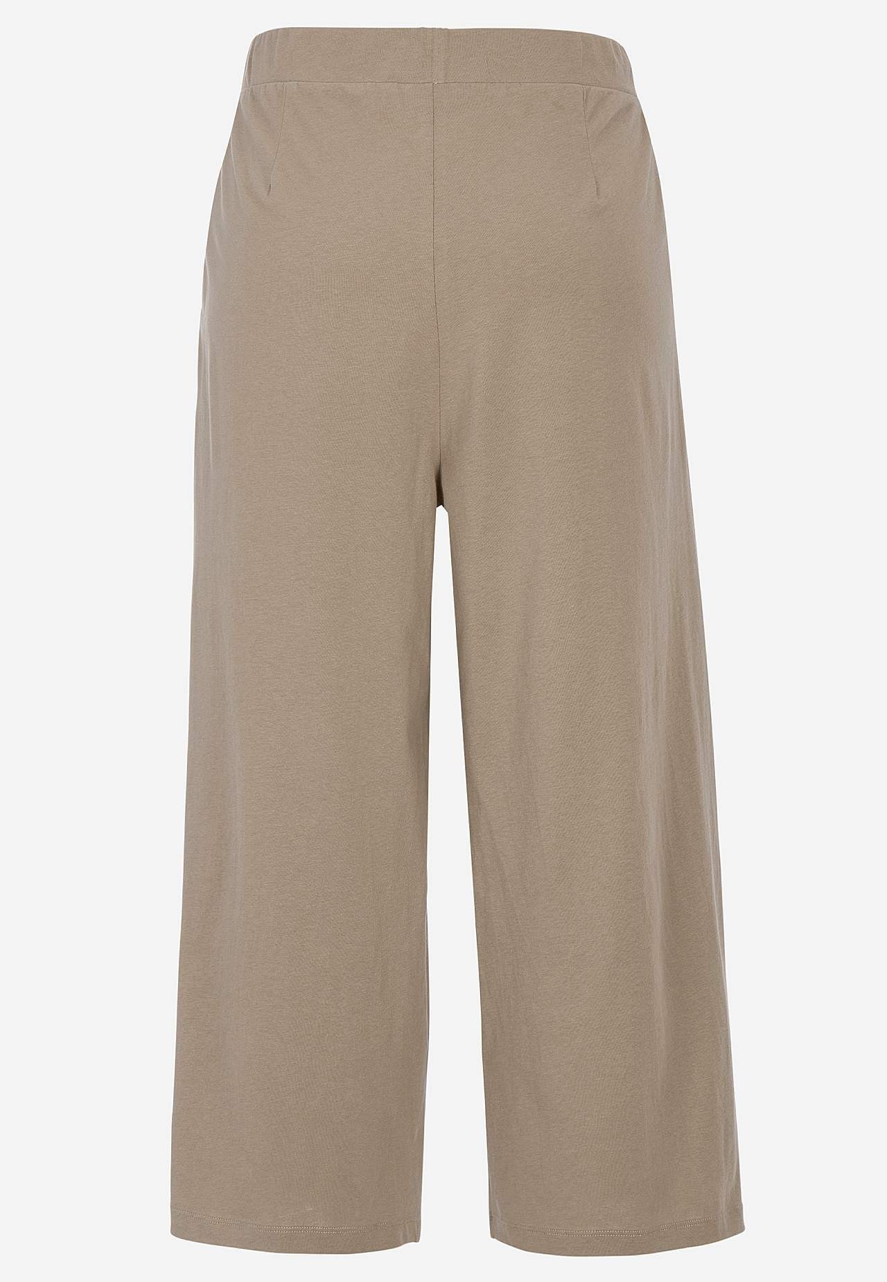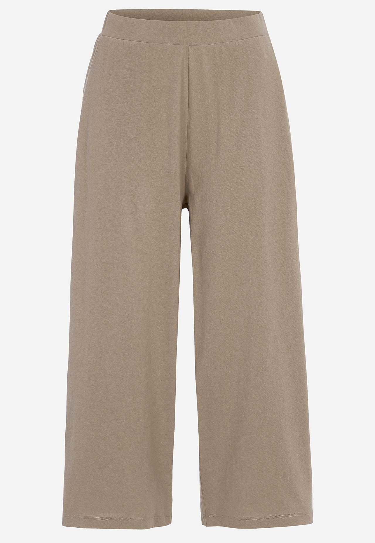 Culottes in soft, organic cotton. Jersey pants with wide, straight legs. Casual fit. High waist with wide, comfortable elastic waistband. Slanted side pockets. Combine with 702634. Inner leg length varies with size: about 57-59 cm. Front rise varies with size: about 29-39 cm.