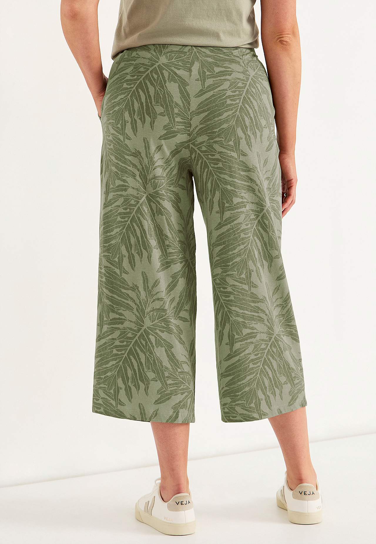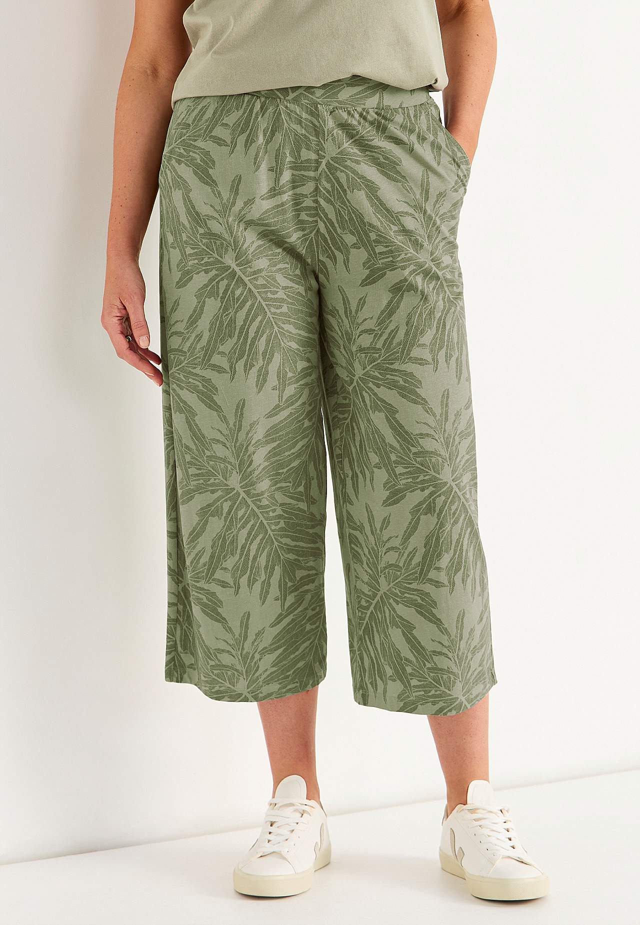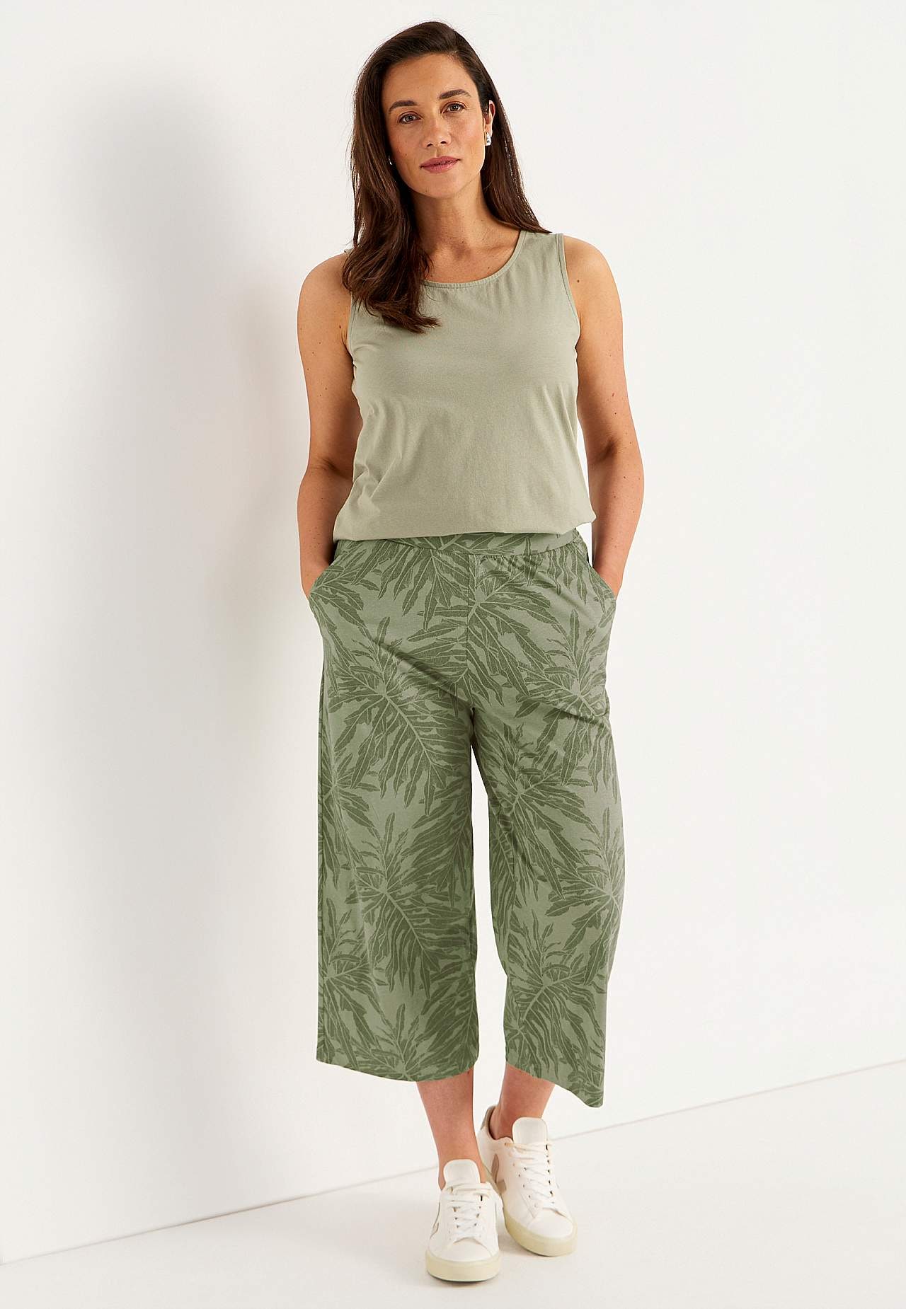 Culottes in soft, organic cotton. Jersey pants with wide, straight legs. Casual fit. High waist with wide, comfortable elastic waistband. Slanted side pockets. Combine with 702634. Inner leg length varies with size: about 57-59 cm. Front rise varies with size: about 29-39 cm.