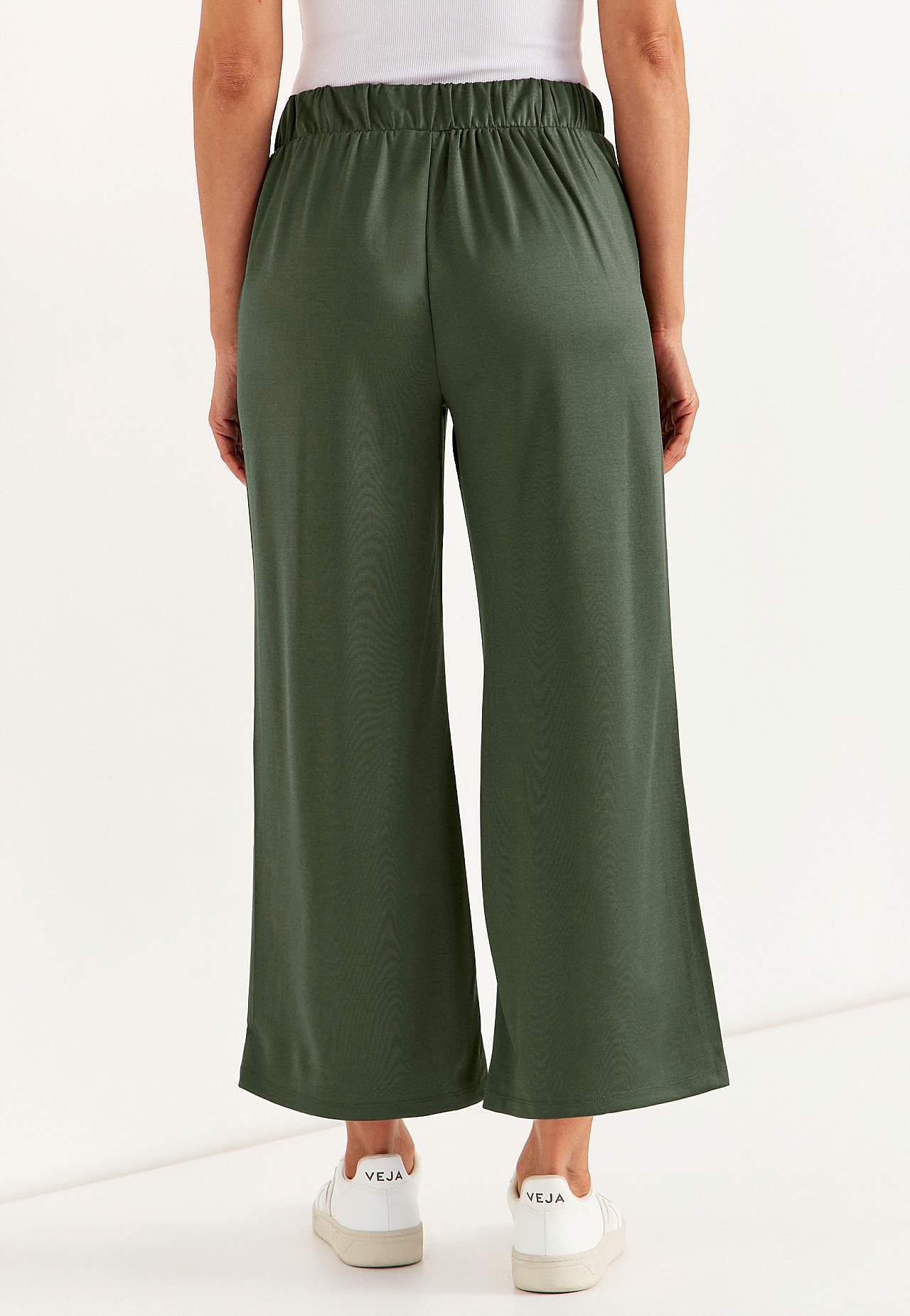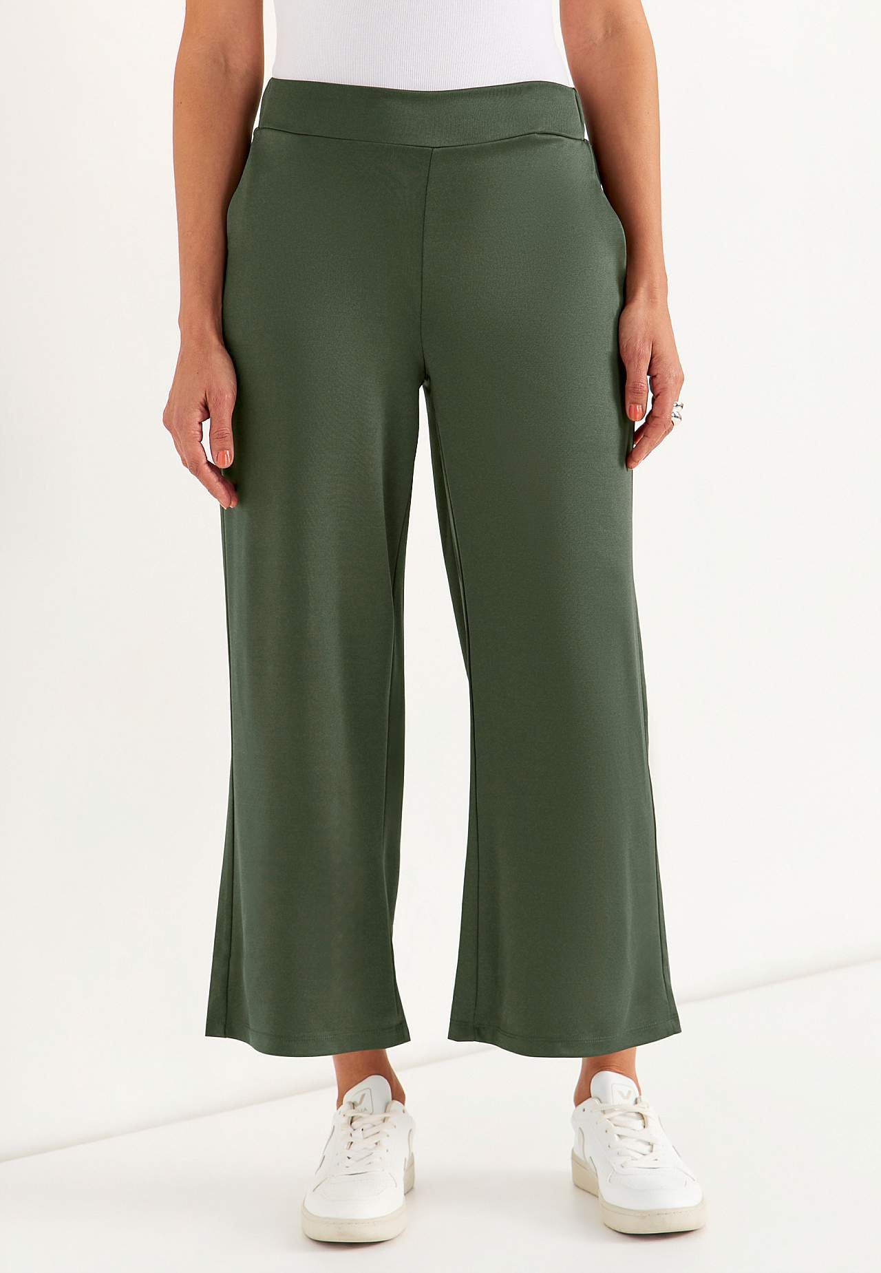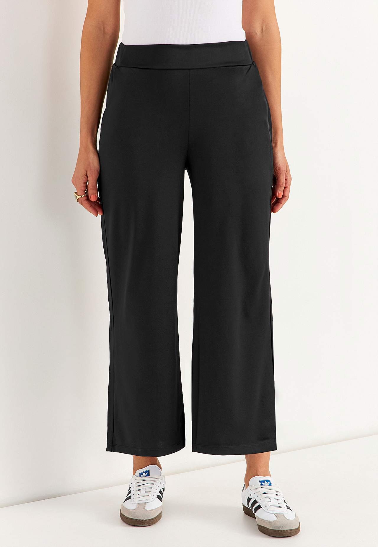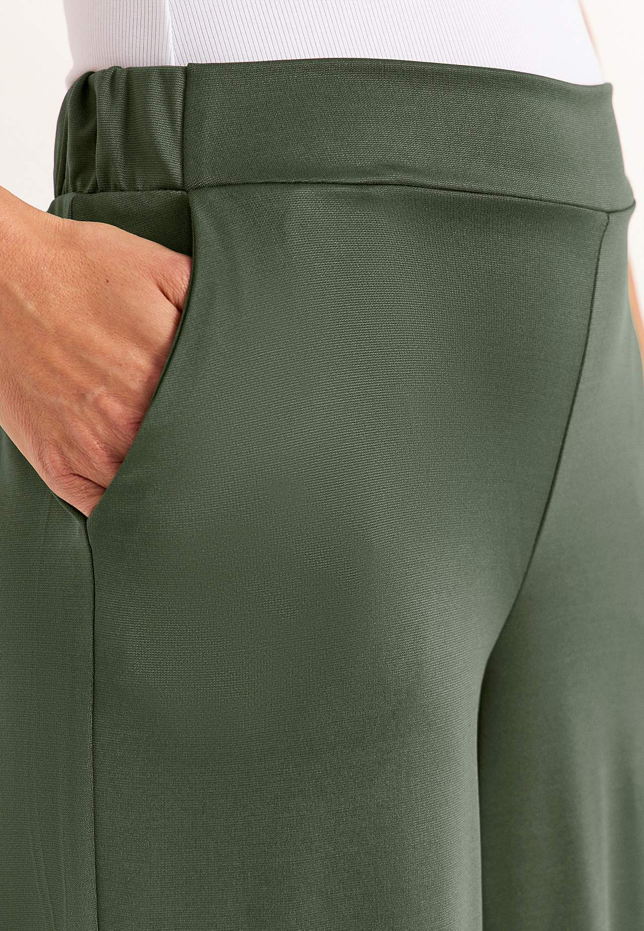 Ankle trousers with wide legs. Smooth jersey with a stretch and nice luster. Wide waistband with hidden elastic on the back. Side seam pockets. Inner leg length is approx. 62 cm in all sizes. Front rise varies with size: about 26-37 cm.