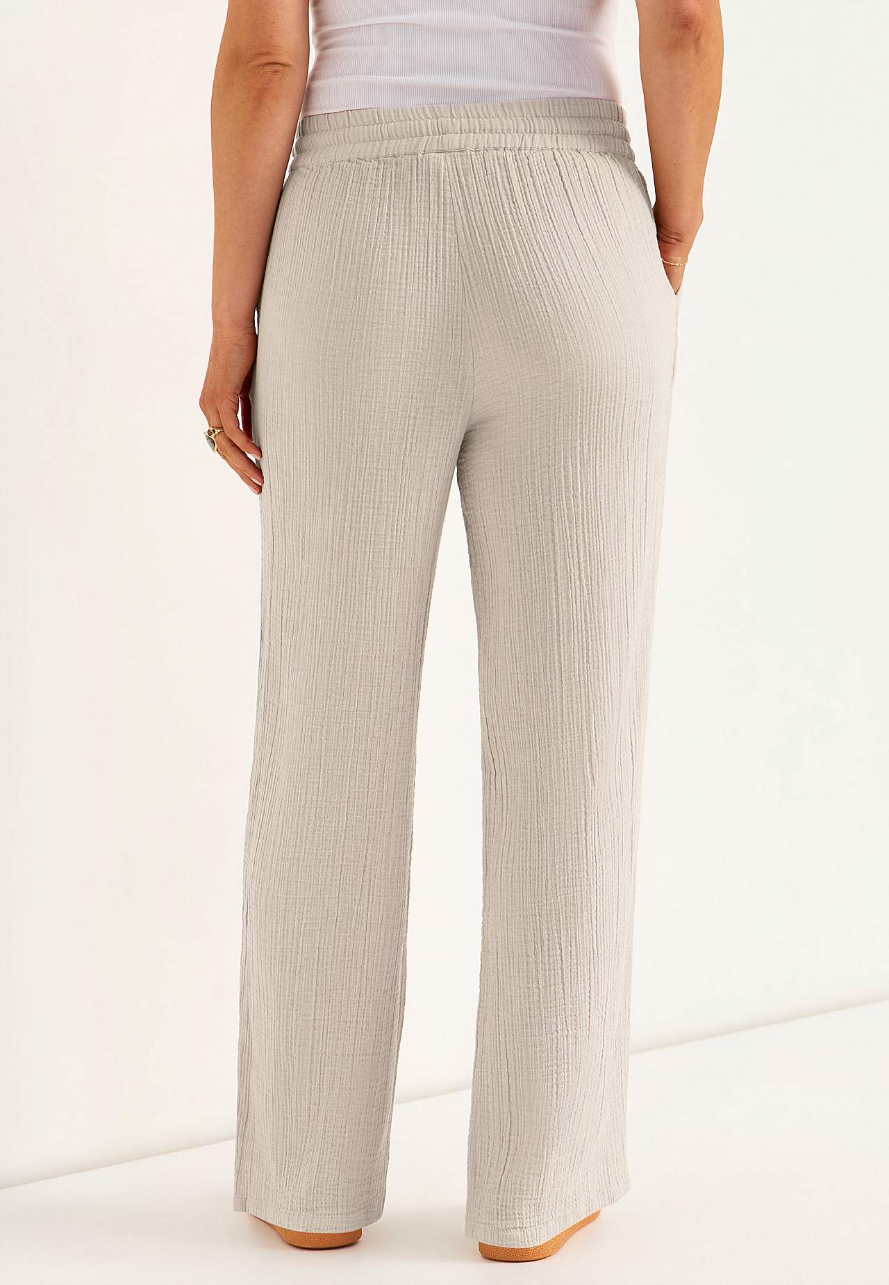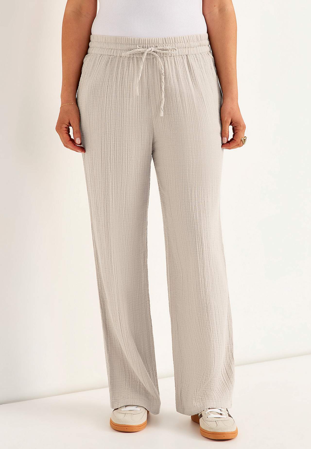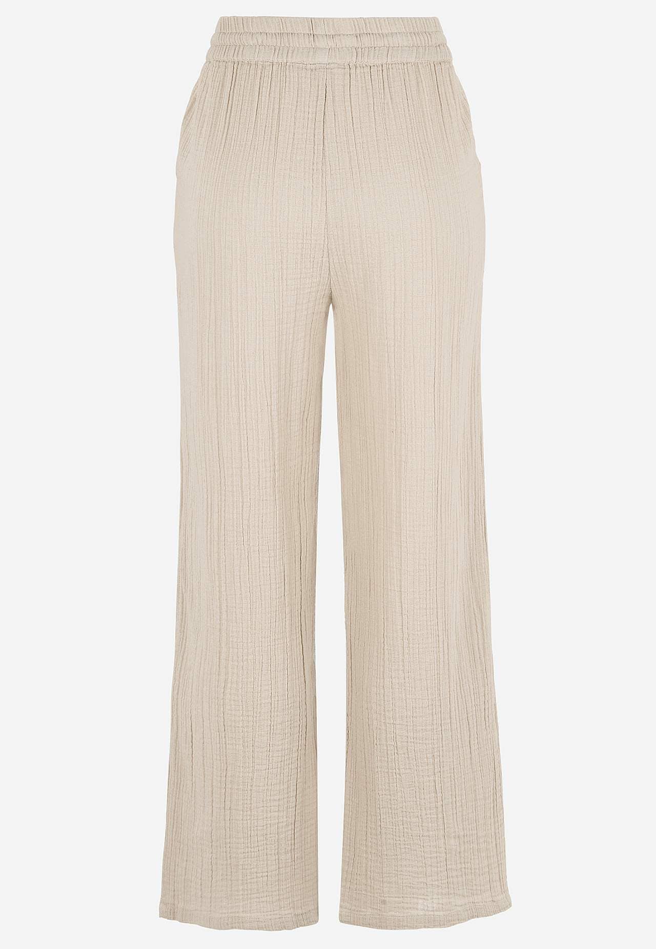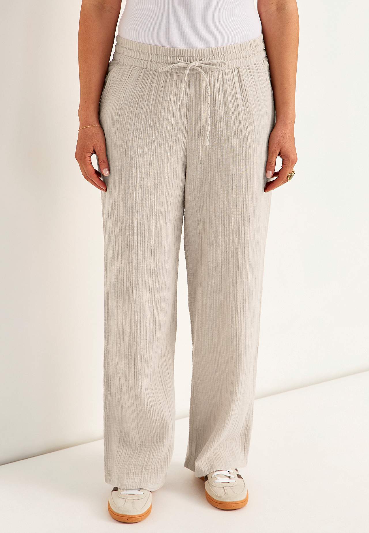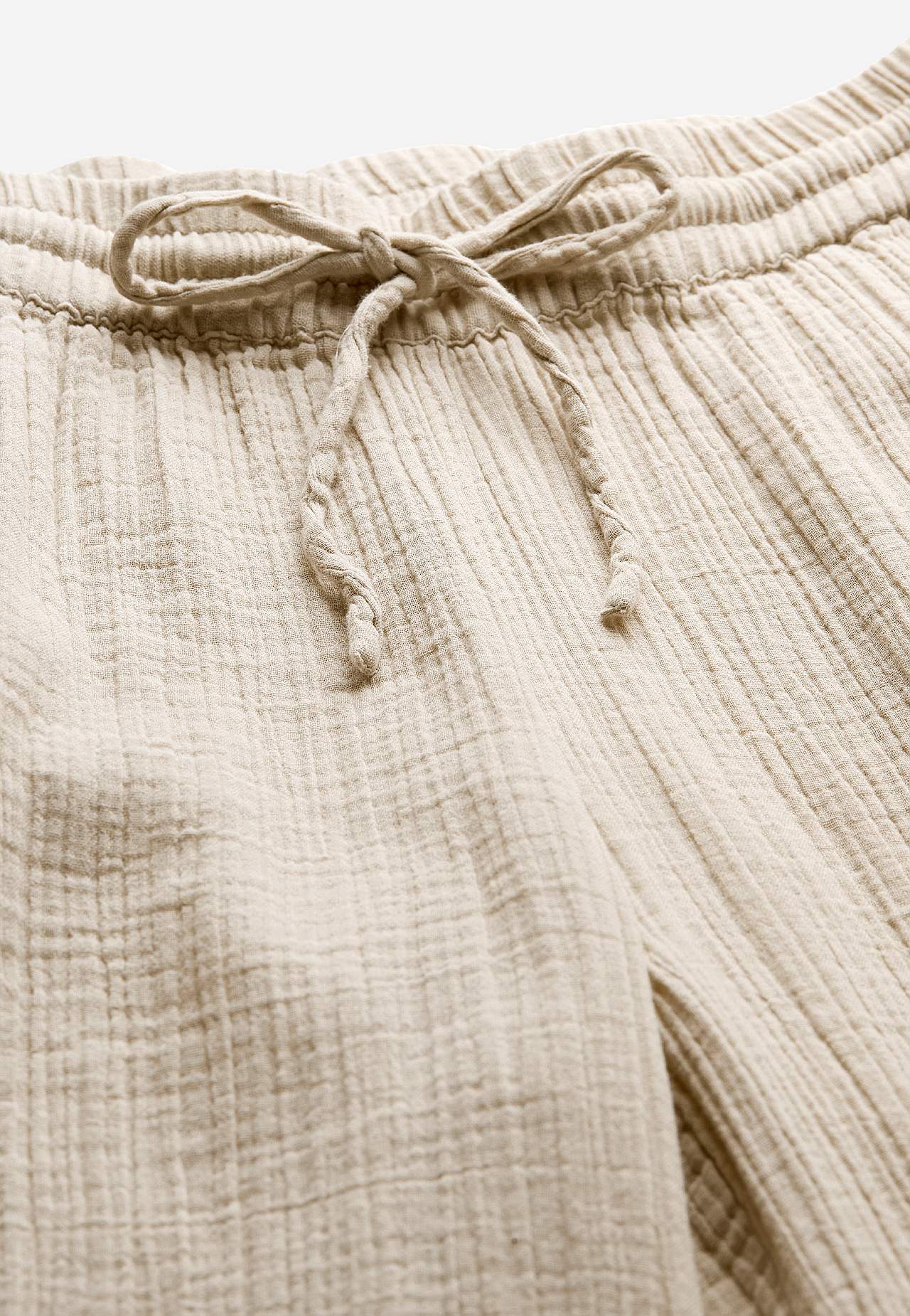 Trousers in nice cotton gauze with natural structure. Woven, soft material with cooling, airy feeling. Broad, soft elastic waistband with drawstring. Slant pockets at the front. Long, wide legs. Inner leg length is approx. 73 cm in all sizes.