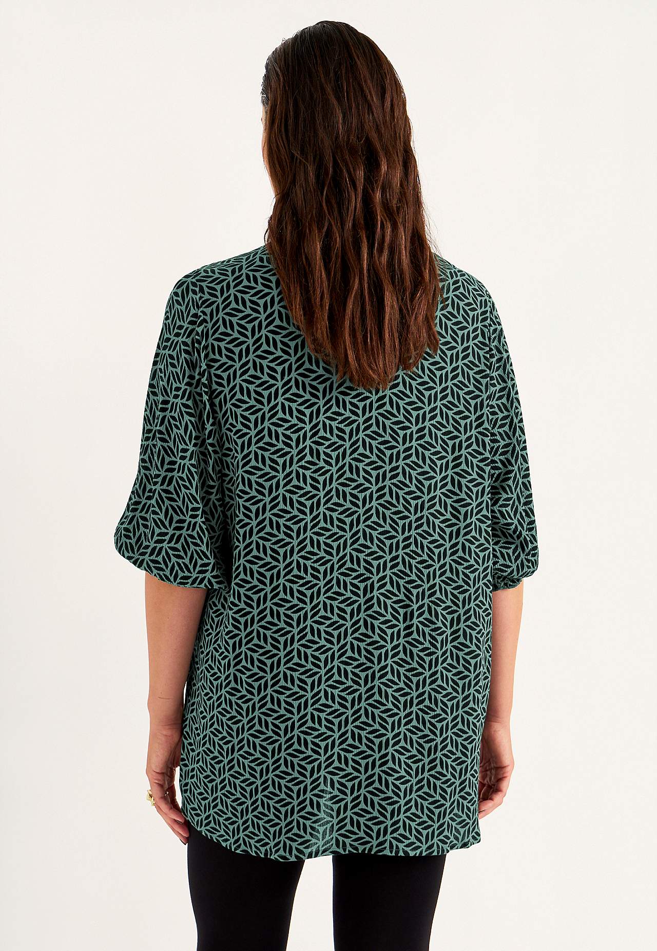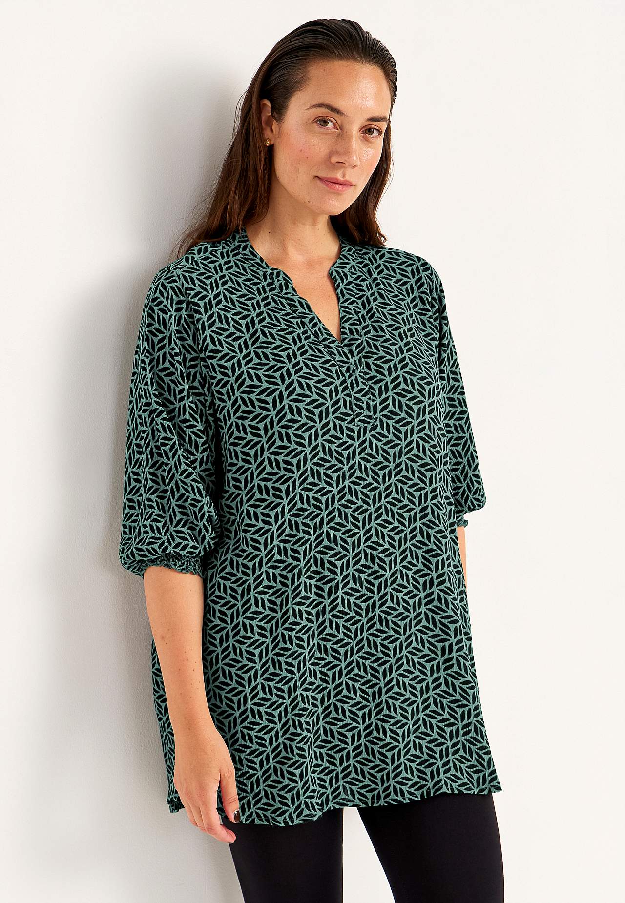 Woven, crepe tunic. Roomy fit. 3/4 length sleeves with smocking on the sleeve ends. The length varies with size: about 78-88 cm from the shoulder.