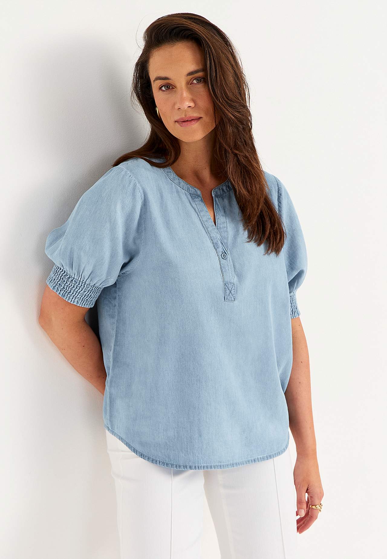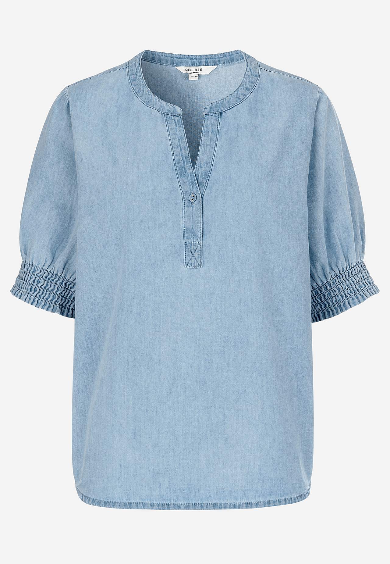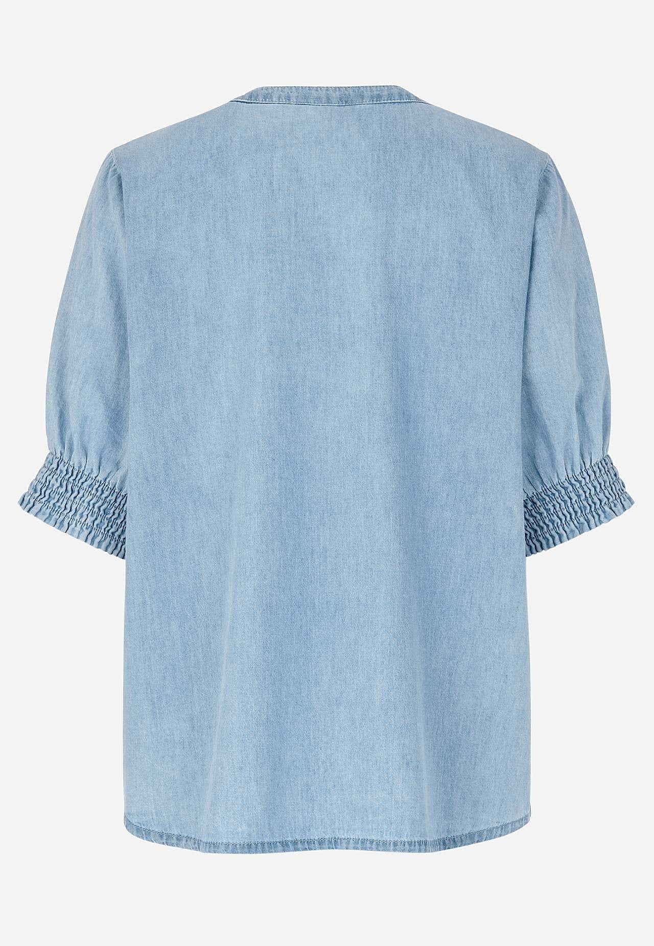 Woven blouse in lovely soft, slightly lighter denim quality. Natural drape with airy feel. Loose fit. Short puff sleeves with soft smocking on the sleeve ends. Combine with 702598. The length varies with size: about 64-76 cm from the shoulder.