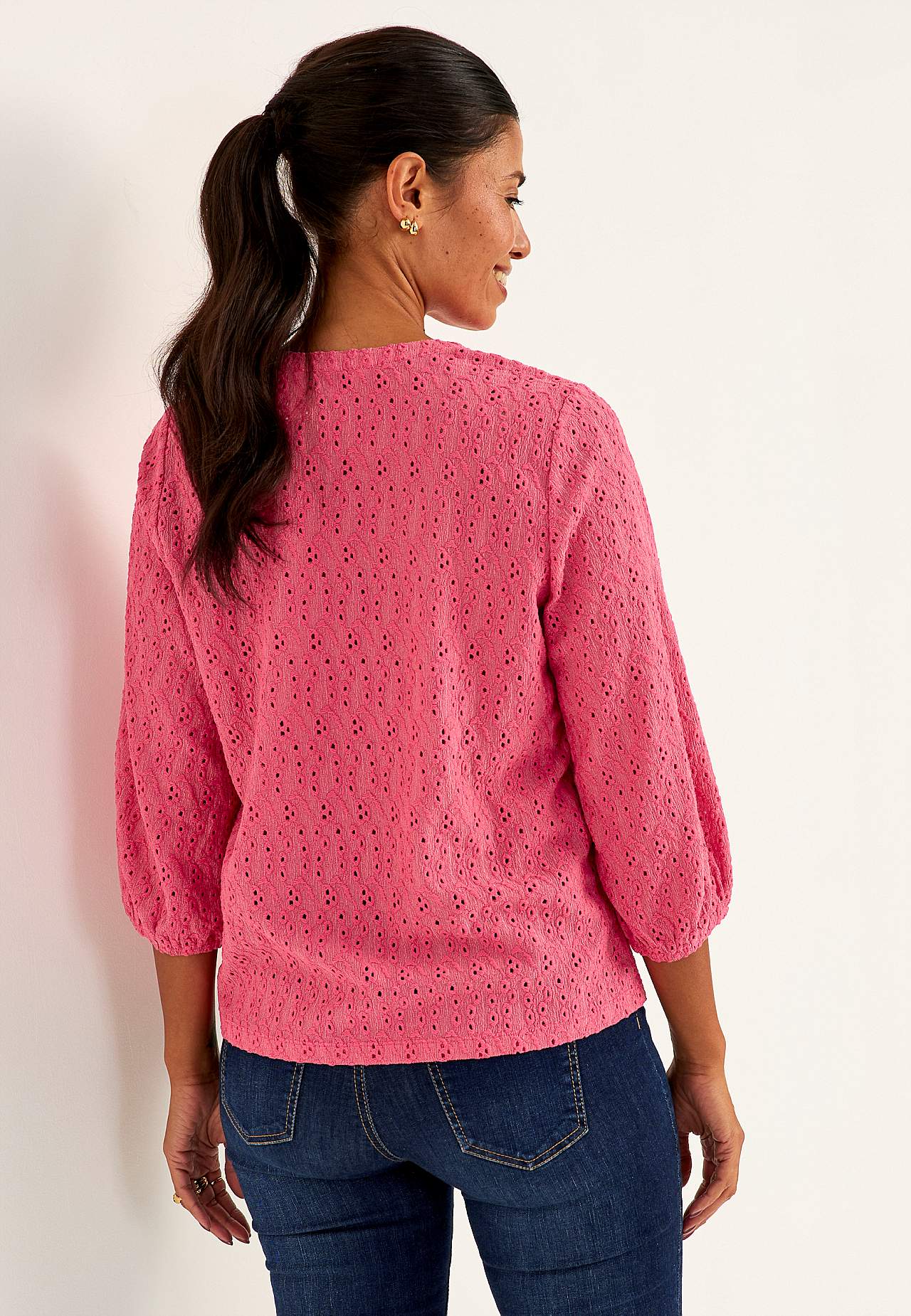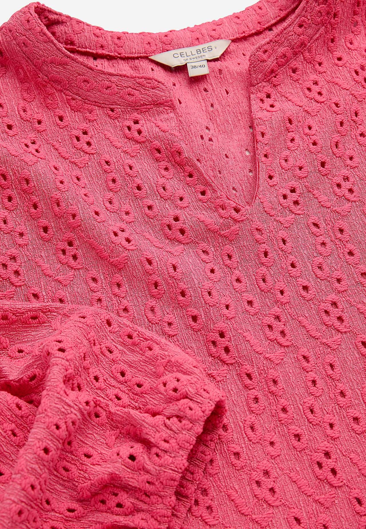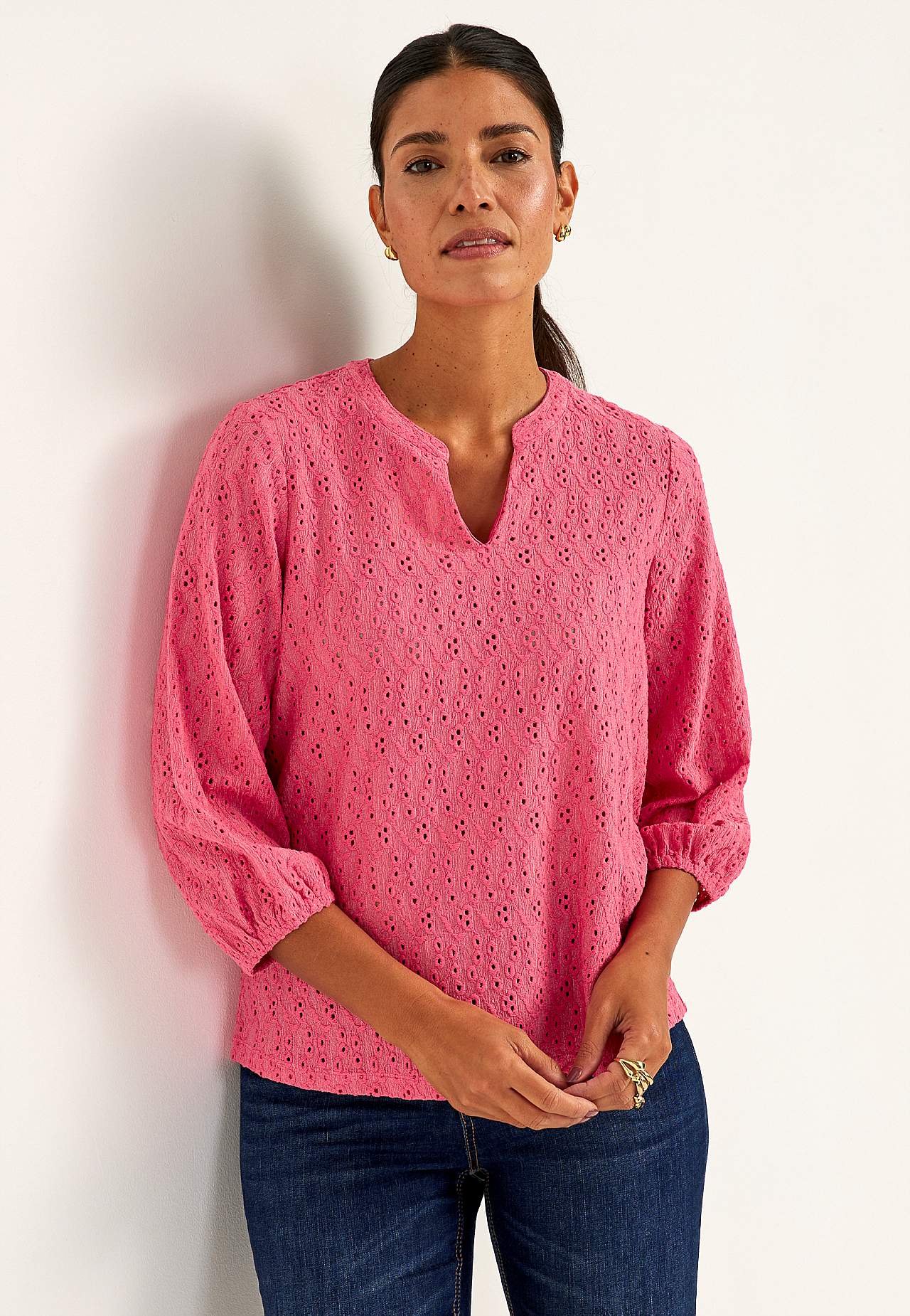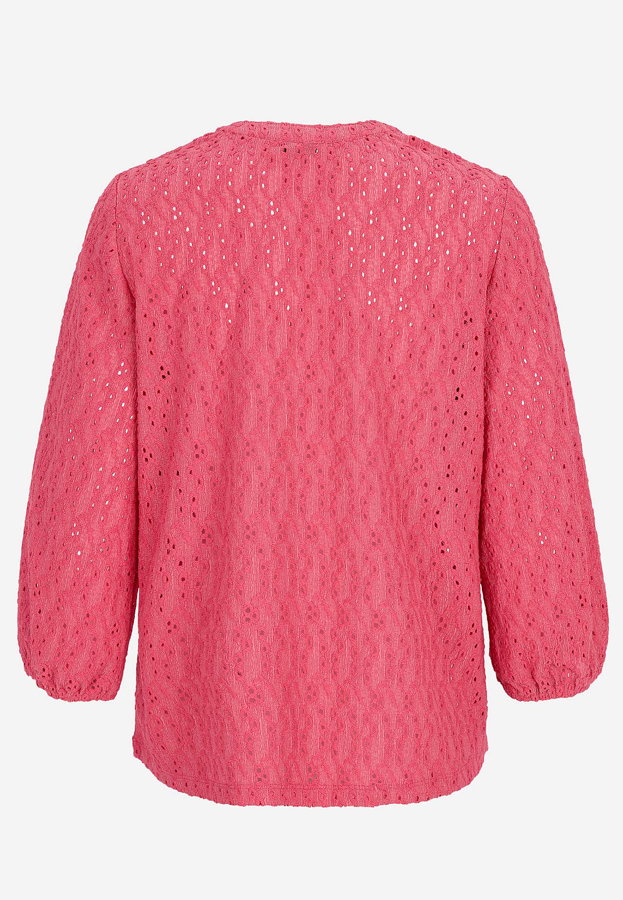 Broderie anglaise, structure patterned, stretchy top. Regular, slightly a-line-shaped fit. Round neck with v cut at the front. 3/4 length, wide sleeves with elastic at the cuffs. Gently rounded hem. The back length varies with size: approx. 61-75 cm.