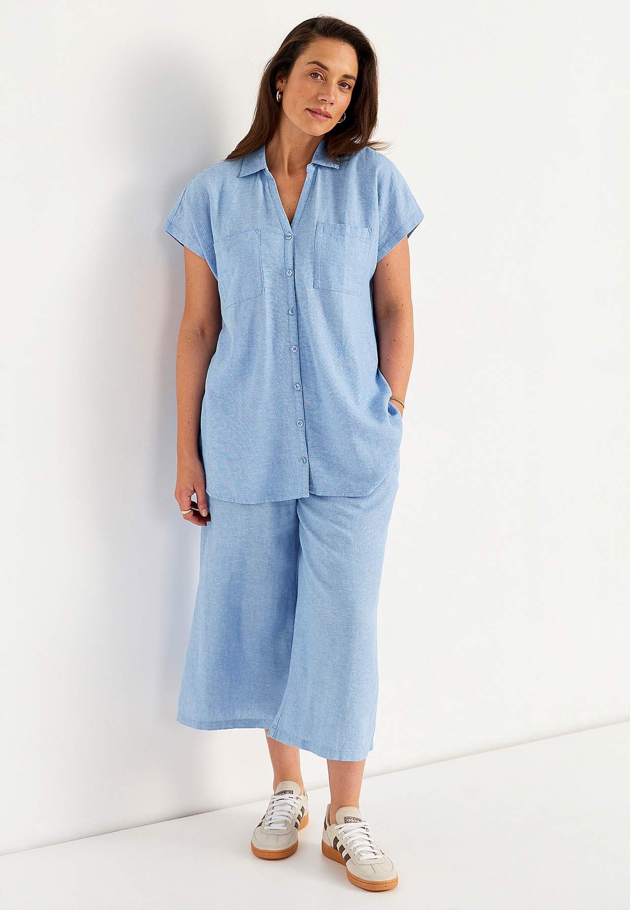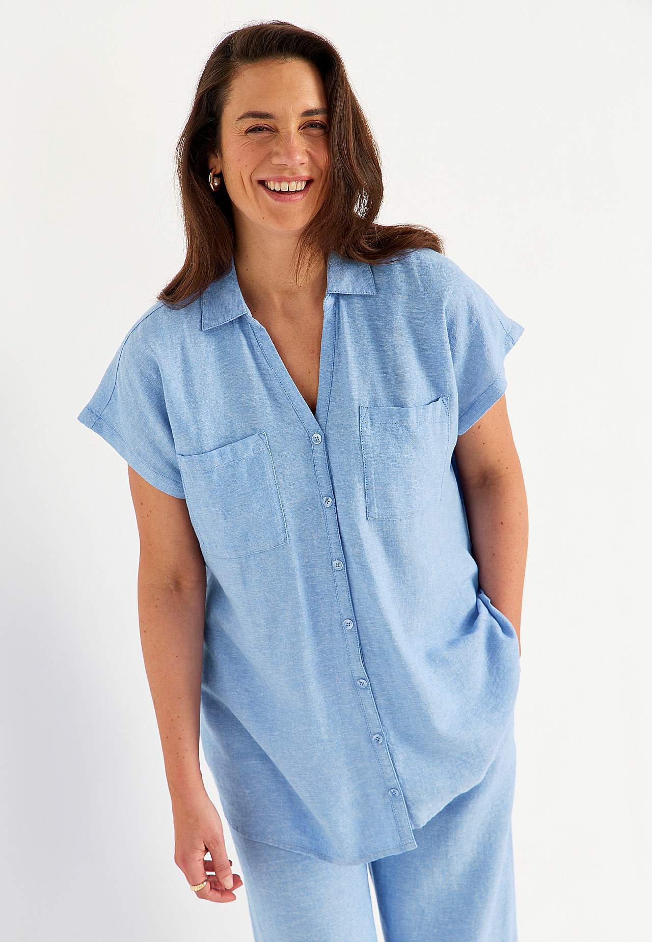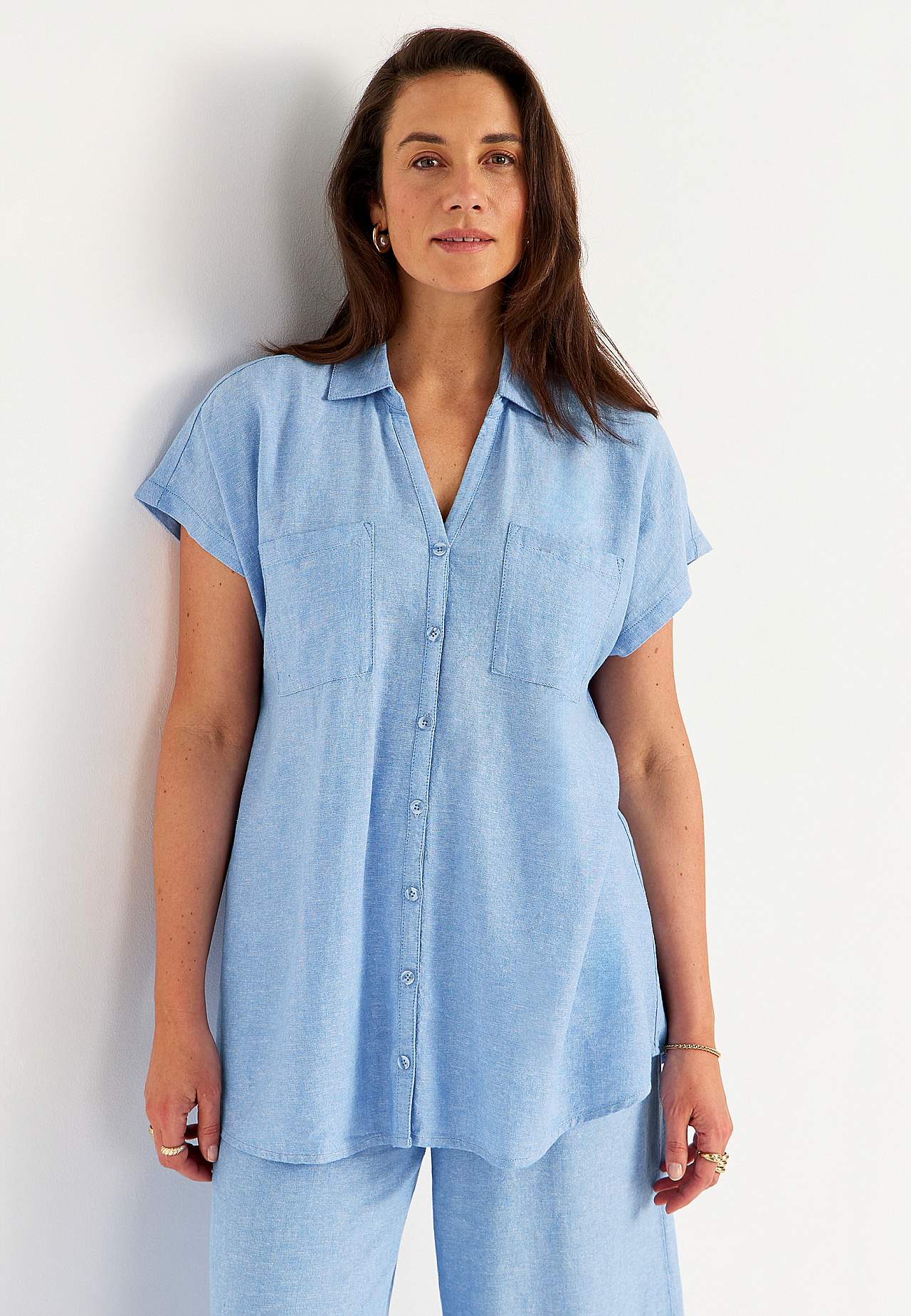 Woven long shirt in airy linen- and viscose mix. Soft, slightly heavier material with natural structure. Casual fit. Chest pockets. Yoke on the back with decorative pleat. Rounded hem. The length varies with size: about 77-84 cm from the shoulder.