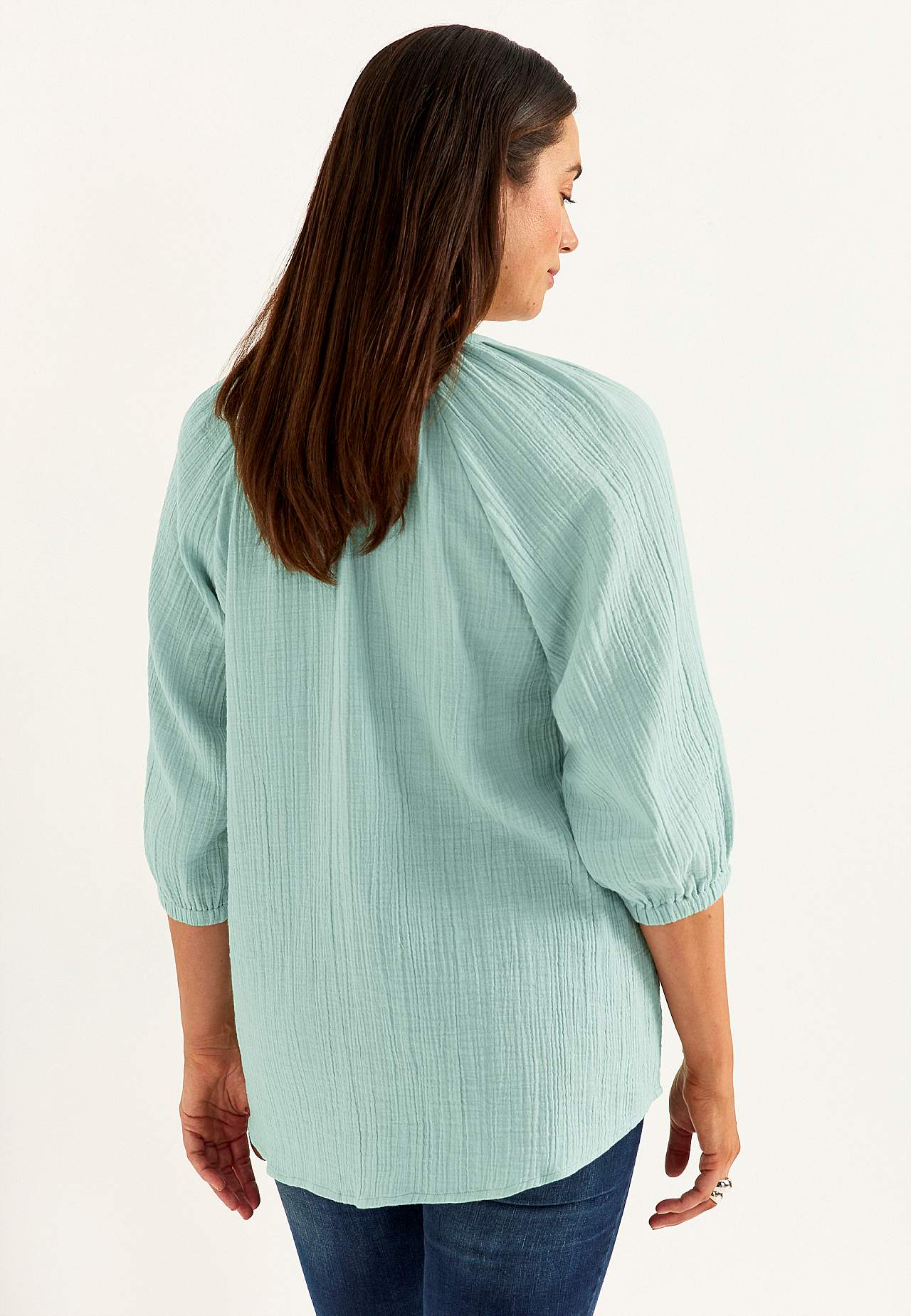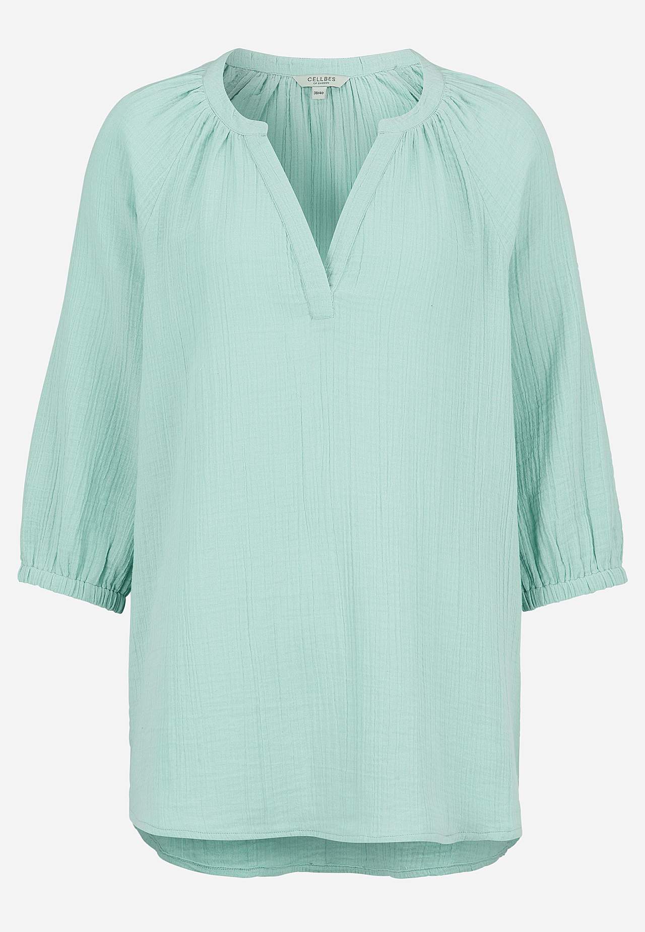 Tunic in lovely cotton gauze with natural structure. Woven, soft material with cooling, airy feel. Slightly a-line-shaped, loose fit. Overlapped neck with v-neck cut. Rounded, slightly longer at the back hem. The length varies with size: about 73-80 cm from the shoulder.