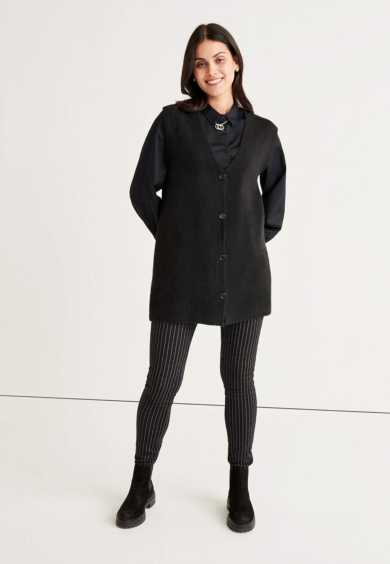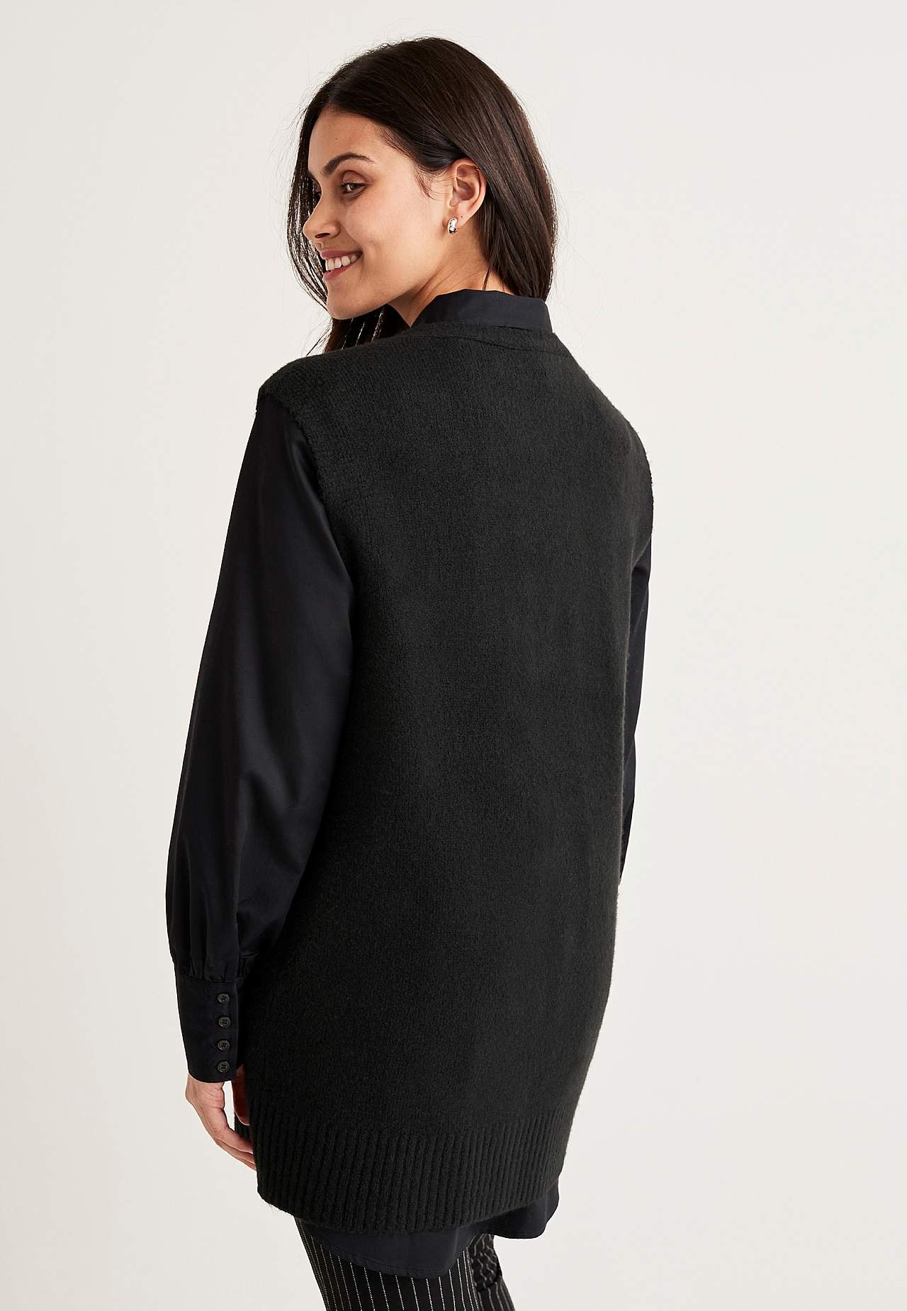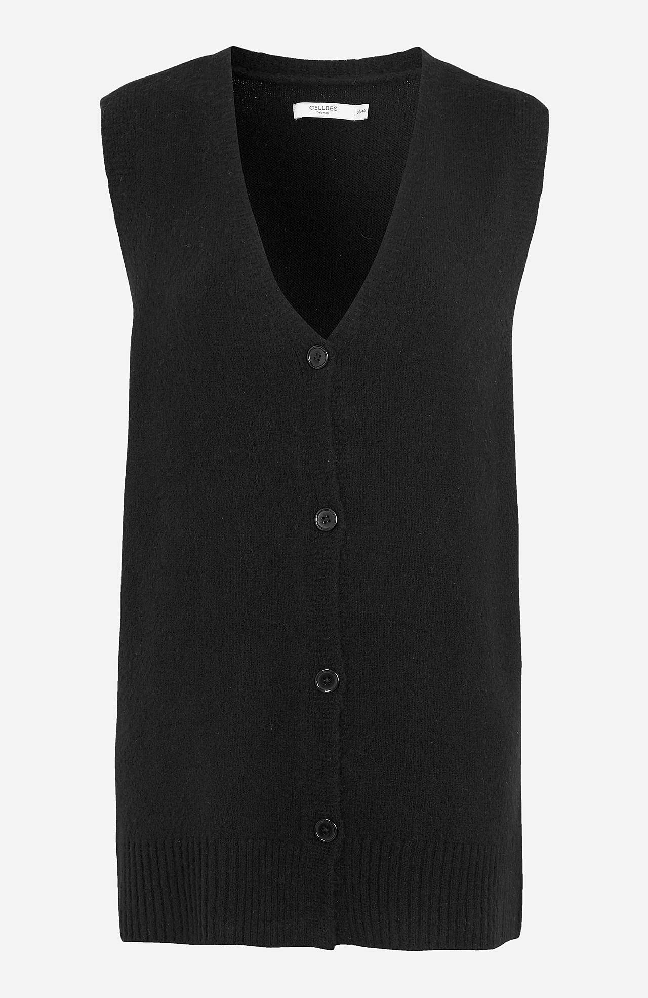 Long, knitted waistcoat with closure buttons. Straight model with ribbed v-neck cut and ribbed hem. The length varies with size: about 75-82 cm from the back shoulder.
