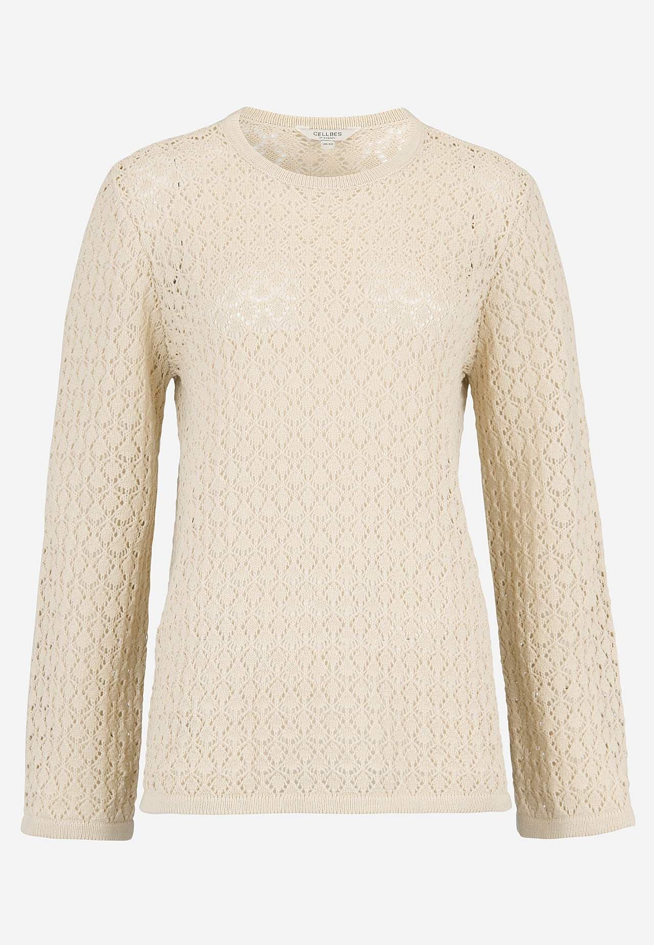 Soft, airy jumper with lace-like fine knit. A pleasant blend of cotton and recycled polyester. Nice to wear over a top or a tank top. Straight fit. Rounded neckline with ribbed trim. Long sleeves with gently flared sleeve ends with rib-knitted edge. The length varies with size: about 63-71 cm from the shoulder.