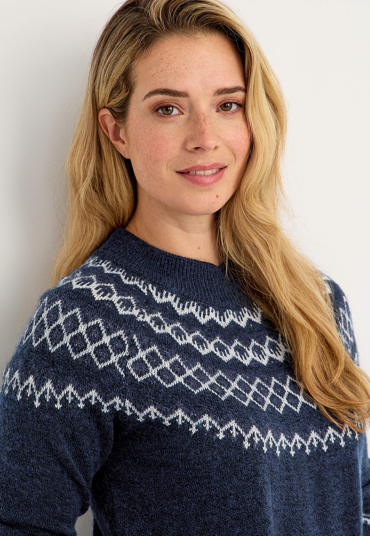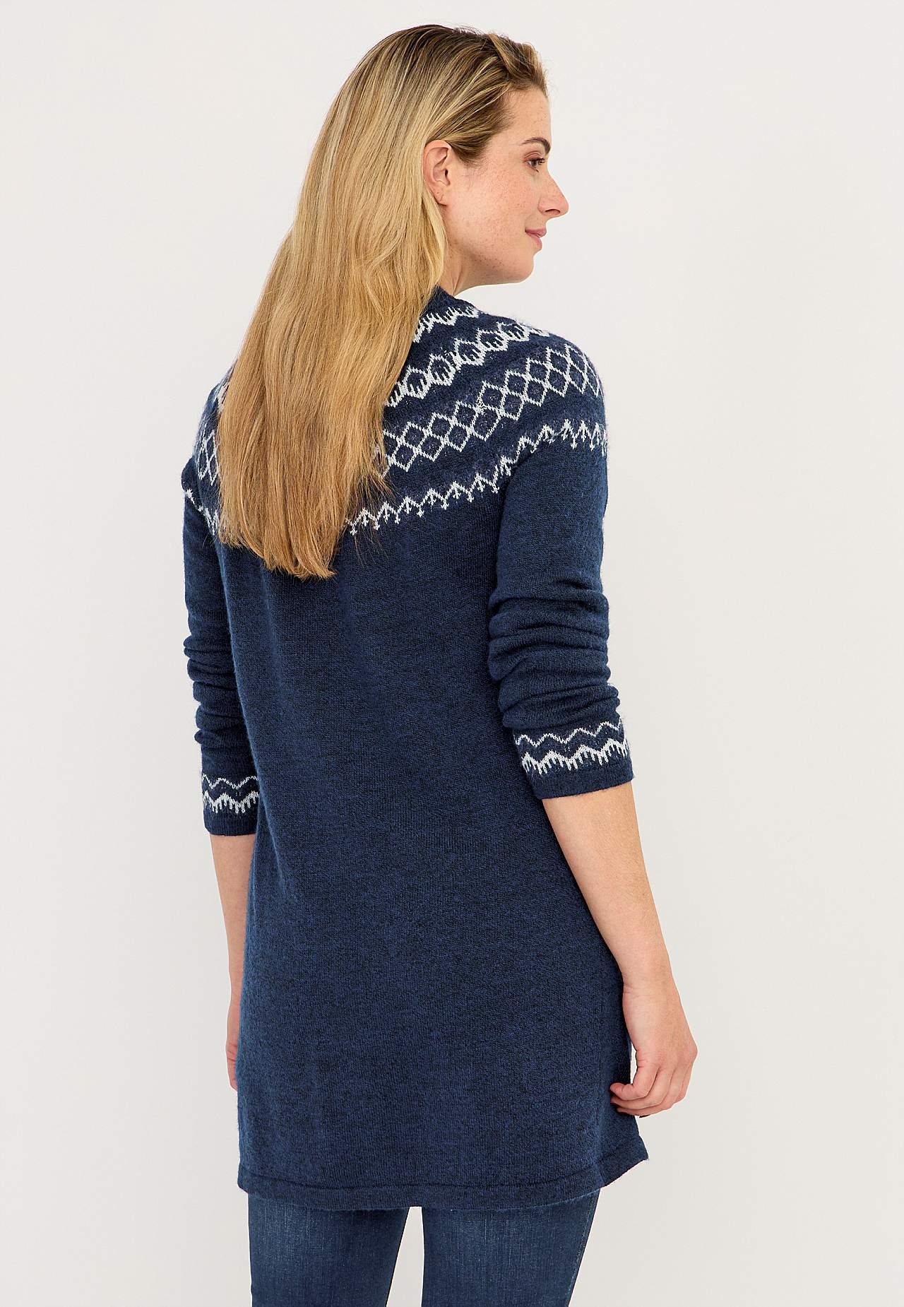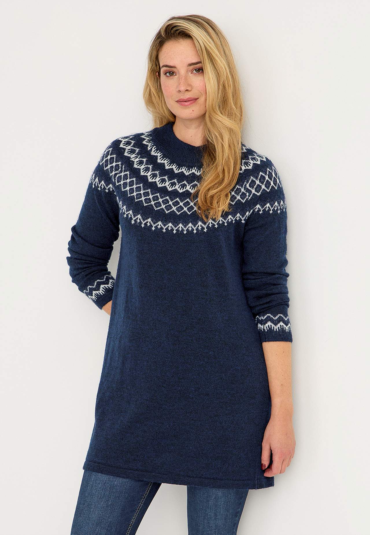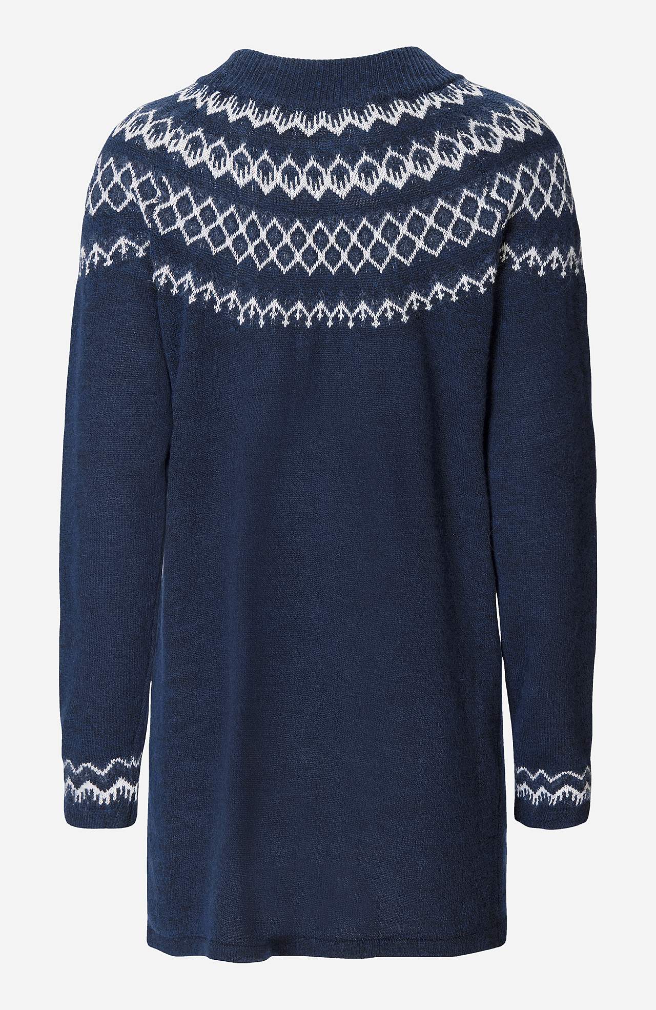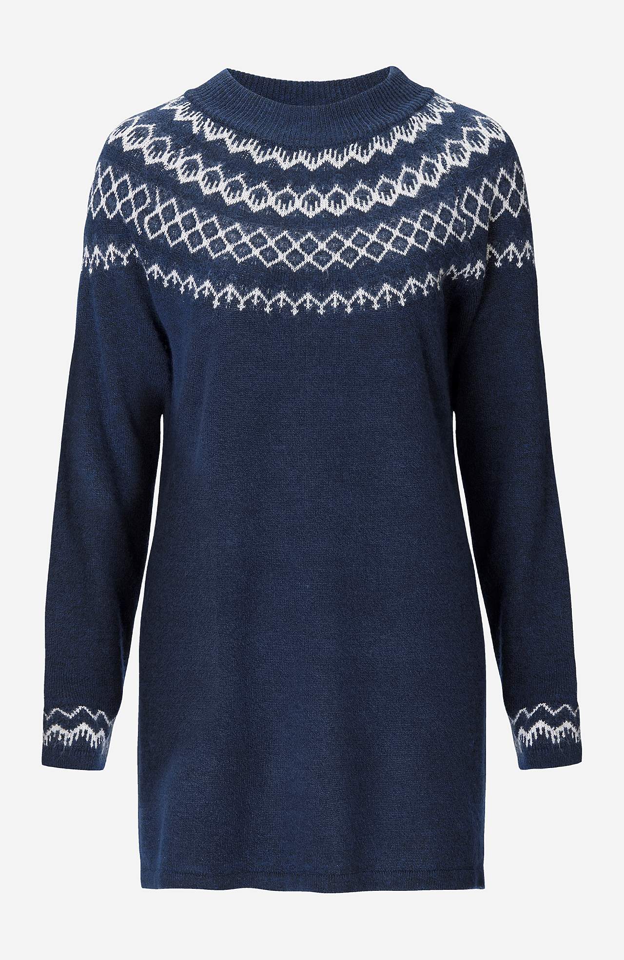 Soft, jacquard patterned knit. Half turtlneck with wide ribbed cuff. Long raglan sleeves. Straight model. The length varies with size: about 79-91 cm.