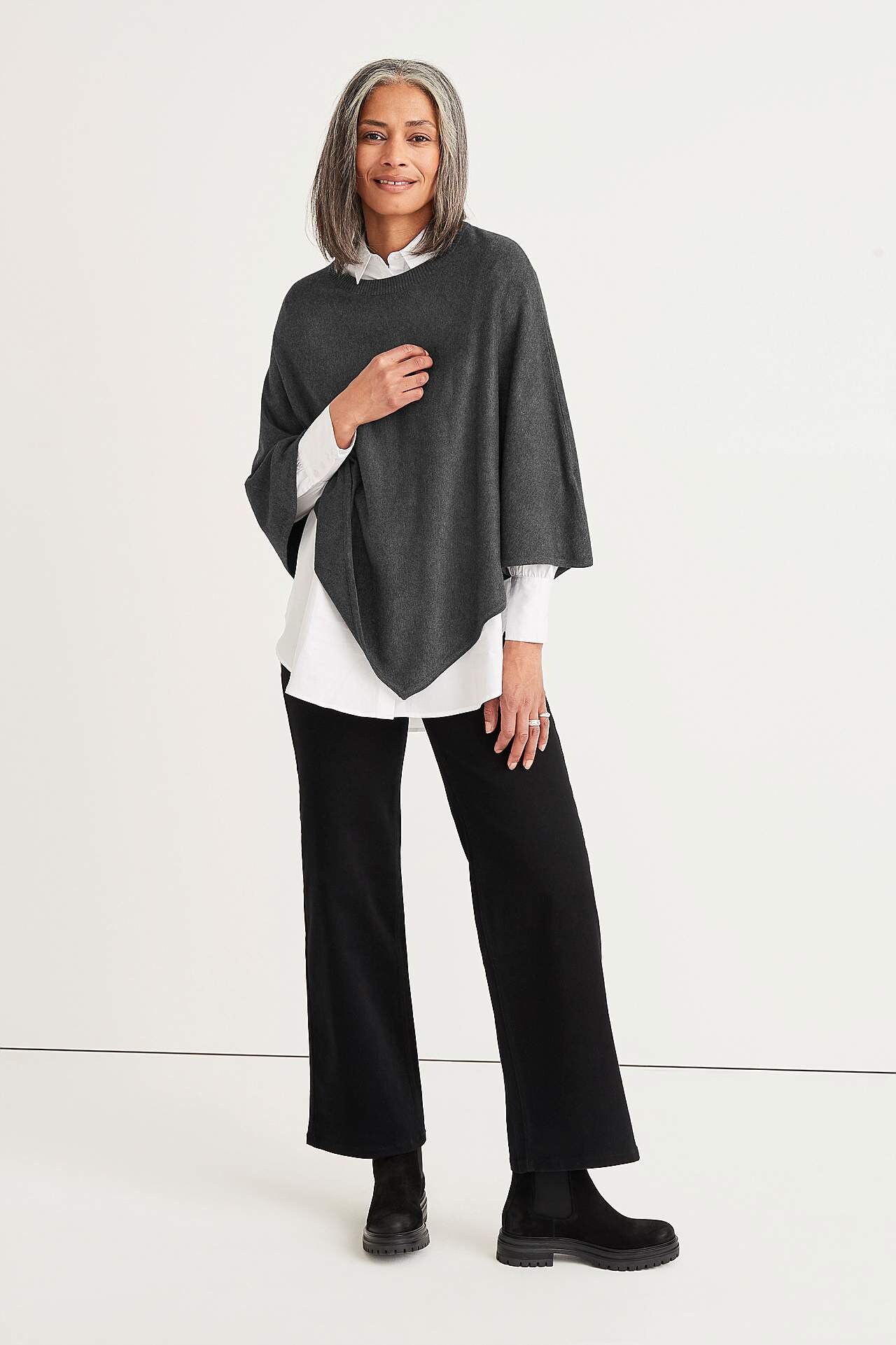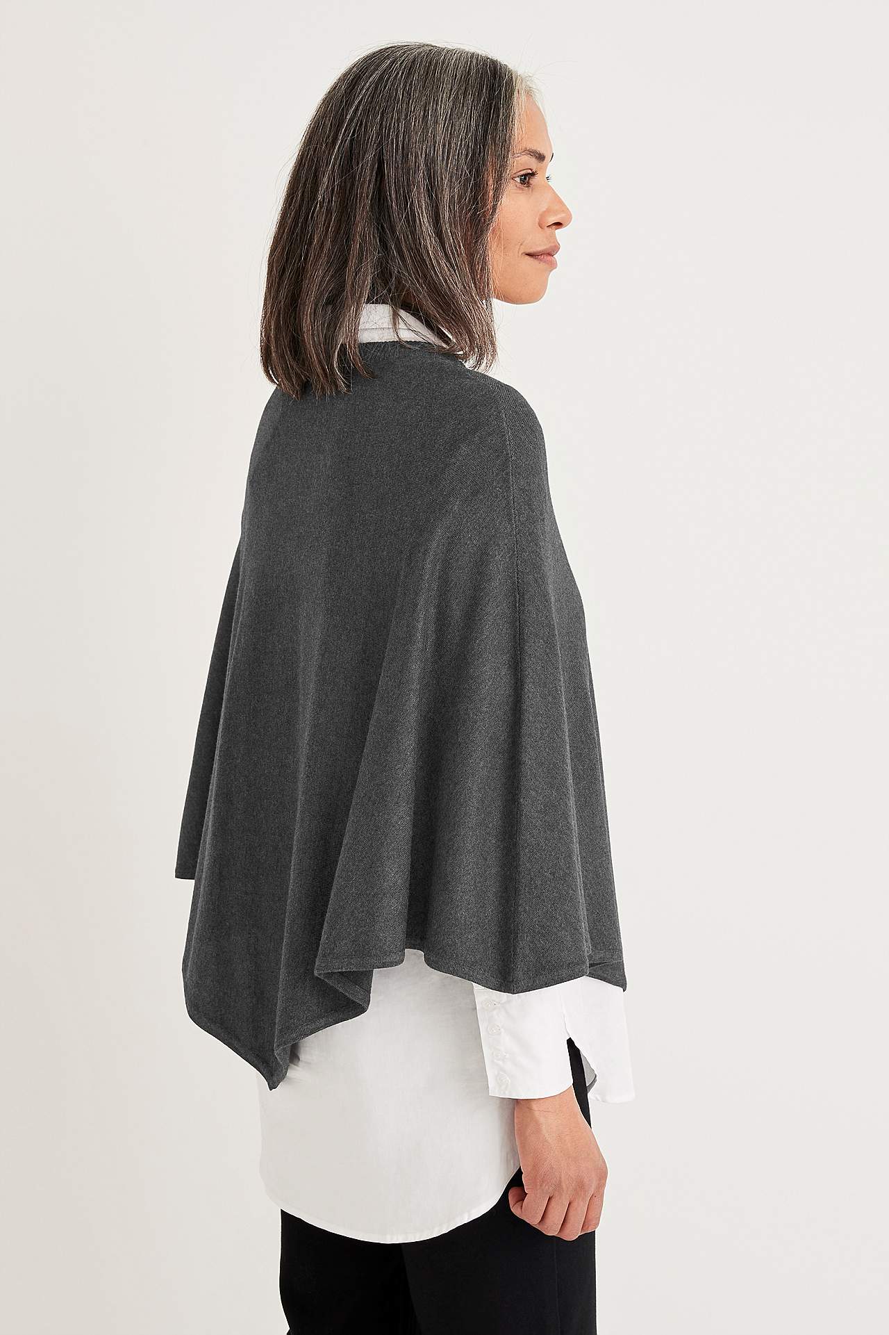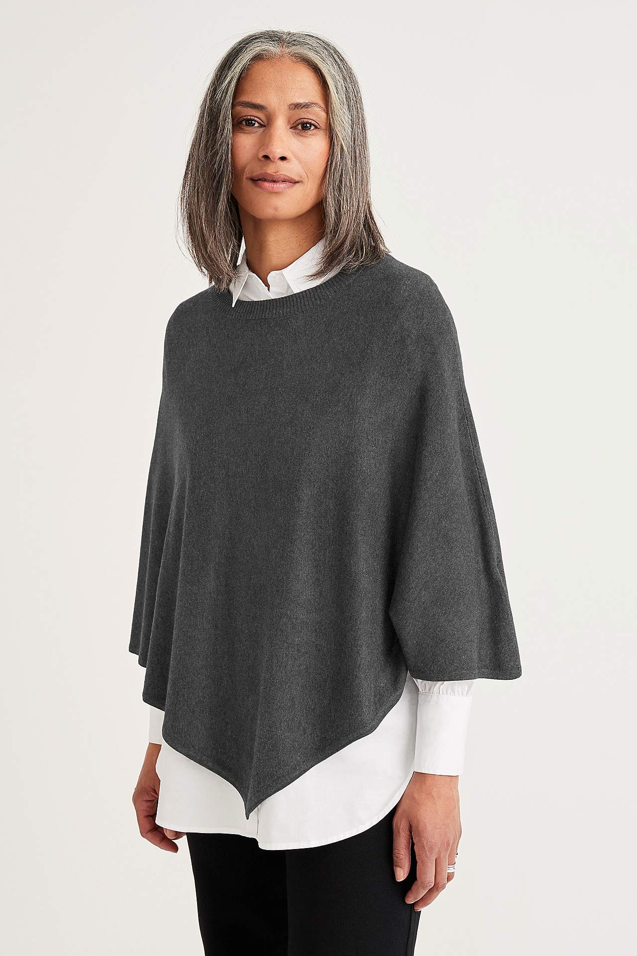 Fine-knitted poncho with rounded, ribbed neck. Length from the center of the back is approximately 72 cm in a size 36/44.