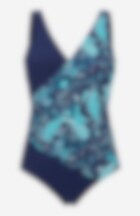 Sewn padded bra inside. Slightly wider shoulder strap. Bottom part with overlap design. Inner brief with lined gusset and leg elastics. Length from the center of the back is approximately 55 cm in a size 40. This product consists of recycled fibres.