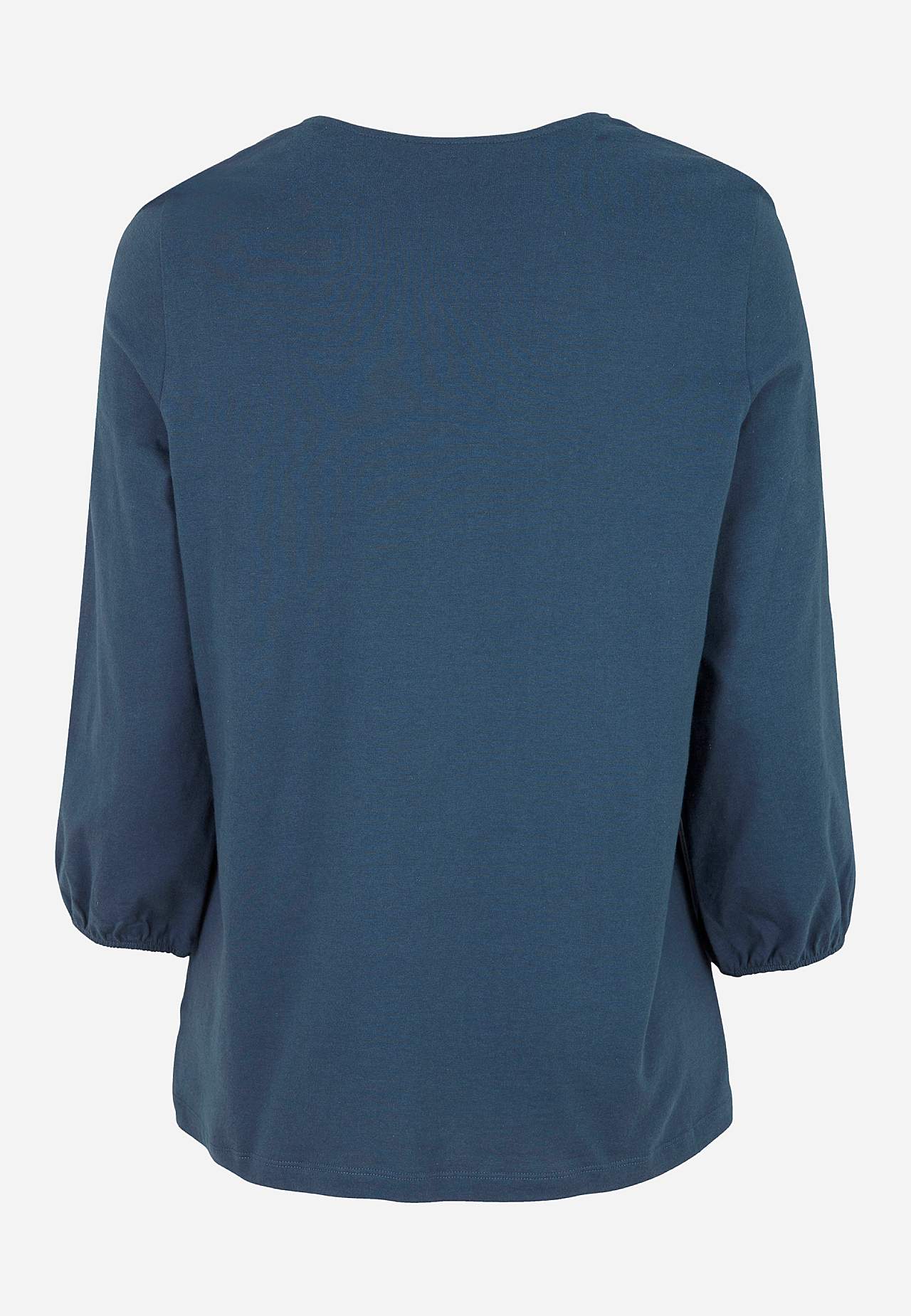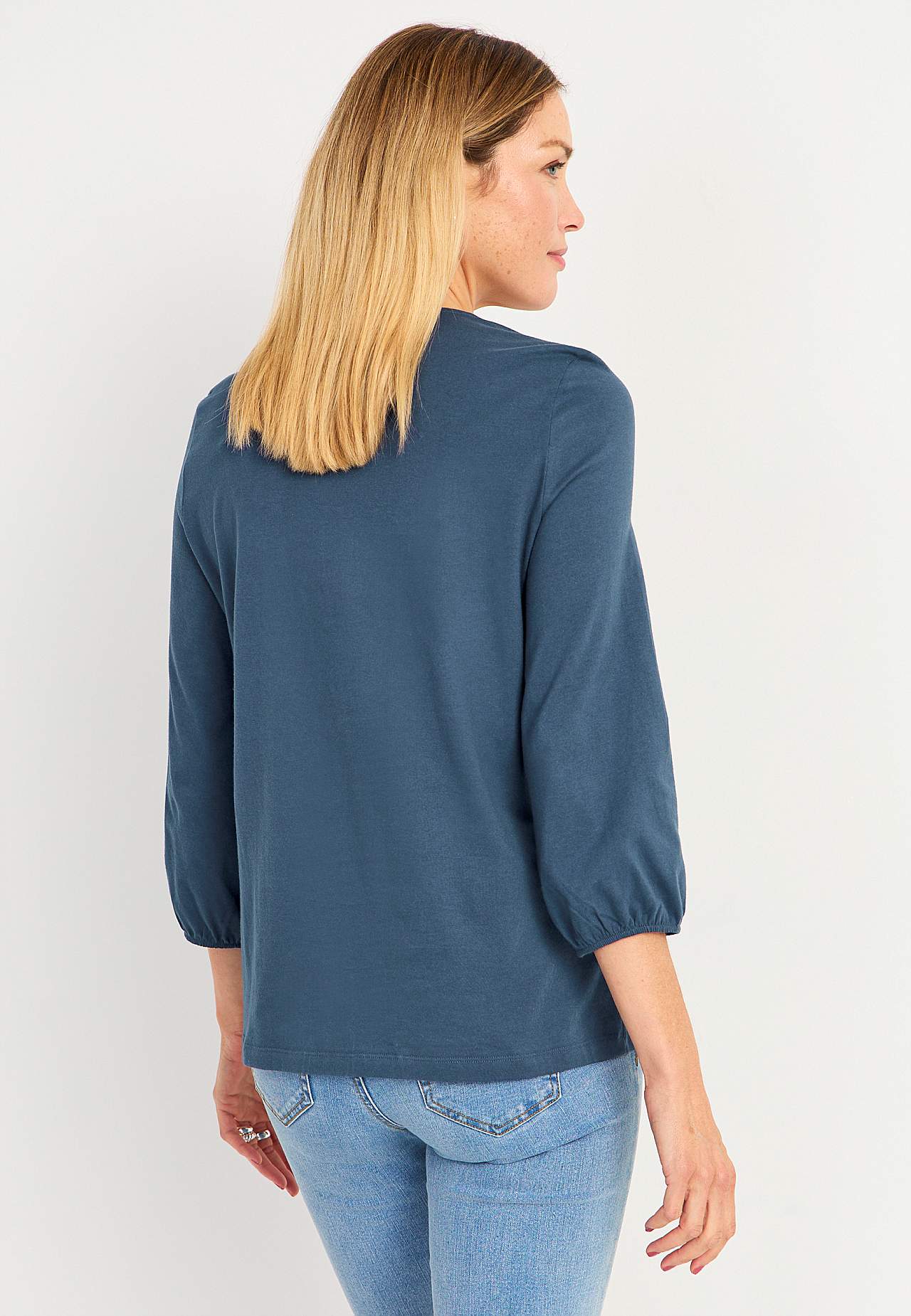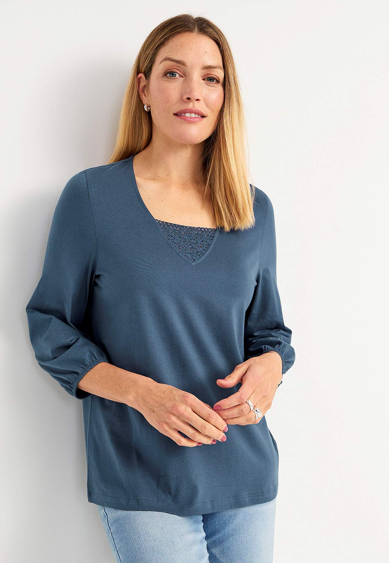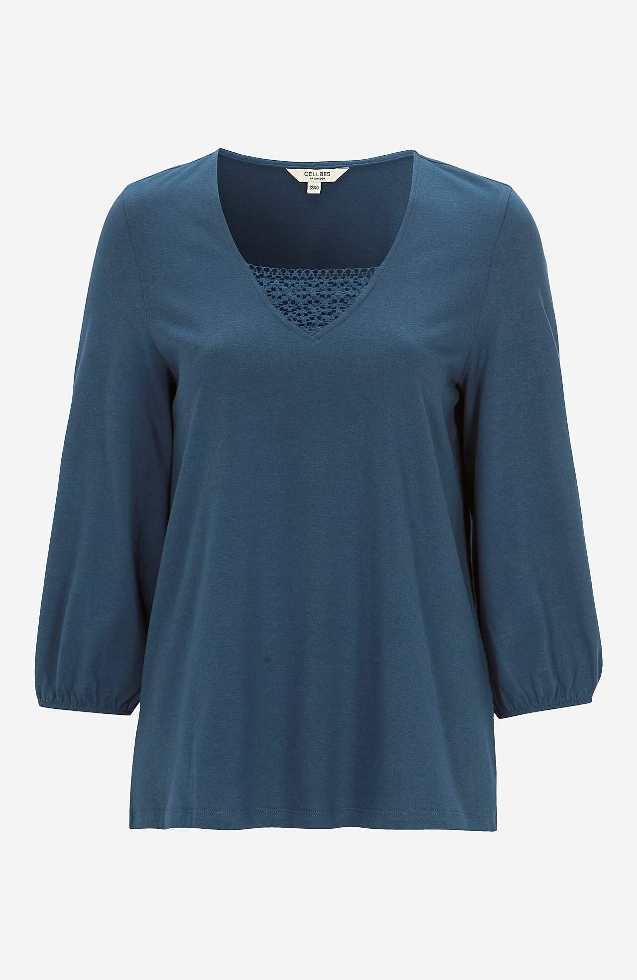 Slightly a-line-shaped jersey top. Soft cotton jersey. Deep v-neck with decorative lace border. 3/4 sleeves. The length varies with size: about 68-78 cm from the shoulder.