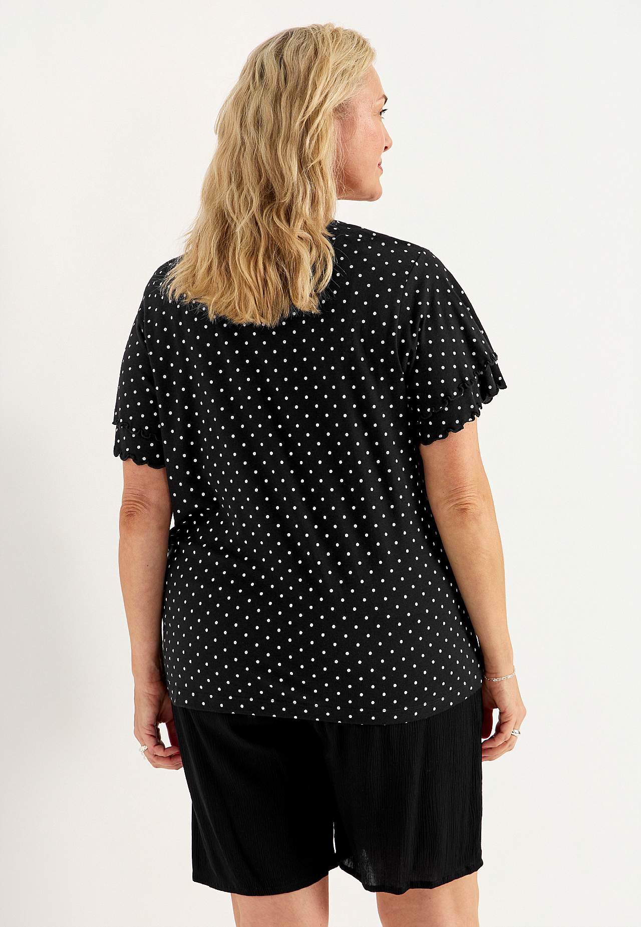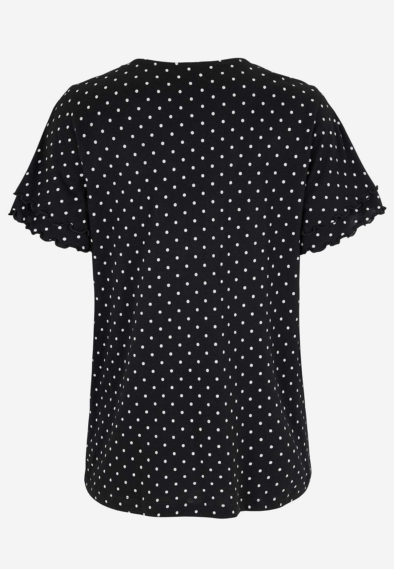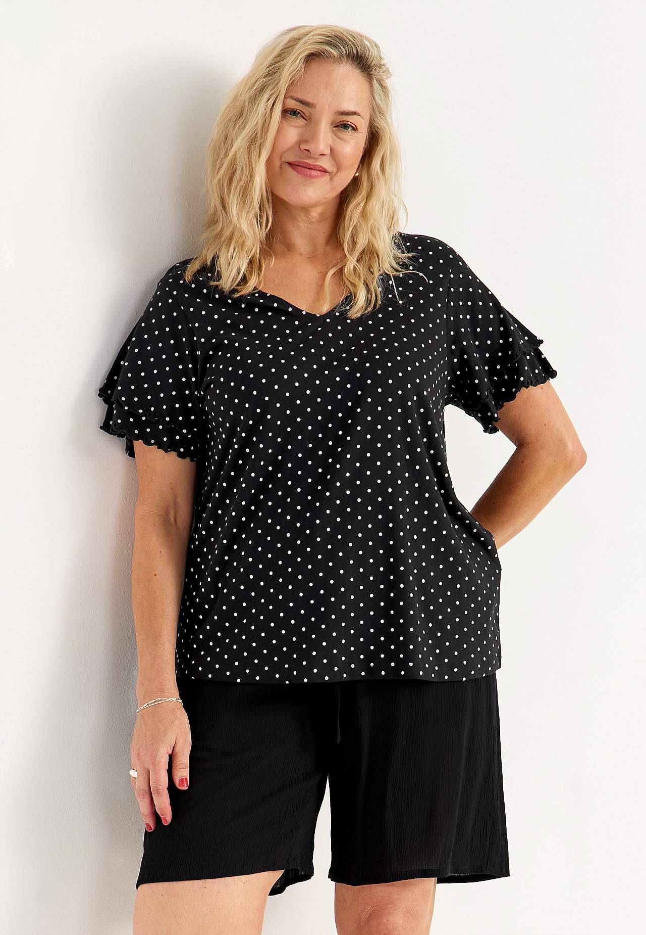 Top with feminine butterfly sleeves. Soft jersey in cotton viscose blend. Slightly a-line-shaped fit. V-neck neckline. Short butterfly sleeves with double layer and overlocked, decorative stitchings. Gently rounded hem. The back length varies with size: approx. 65-73 cm.