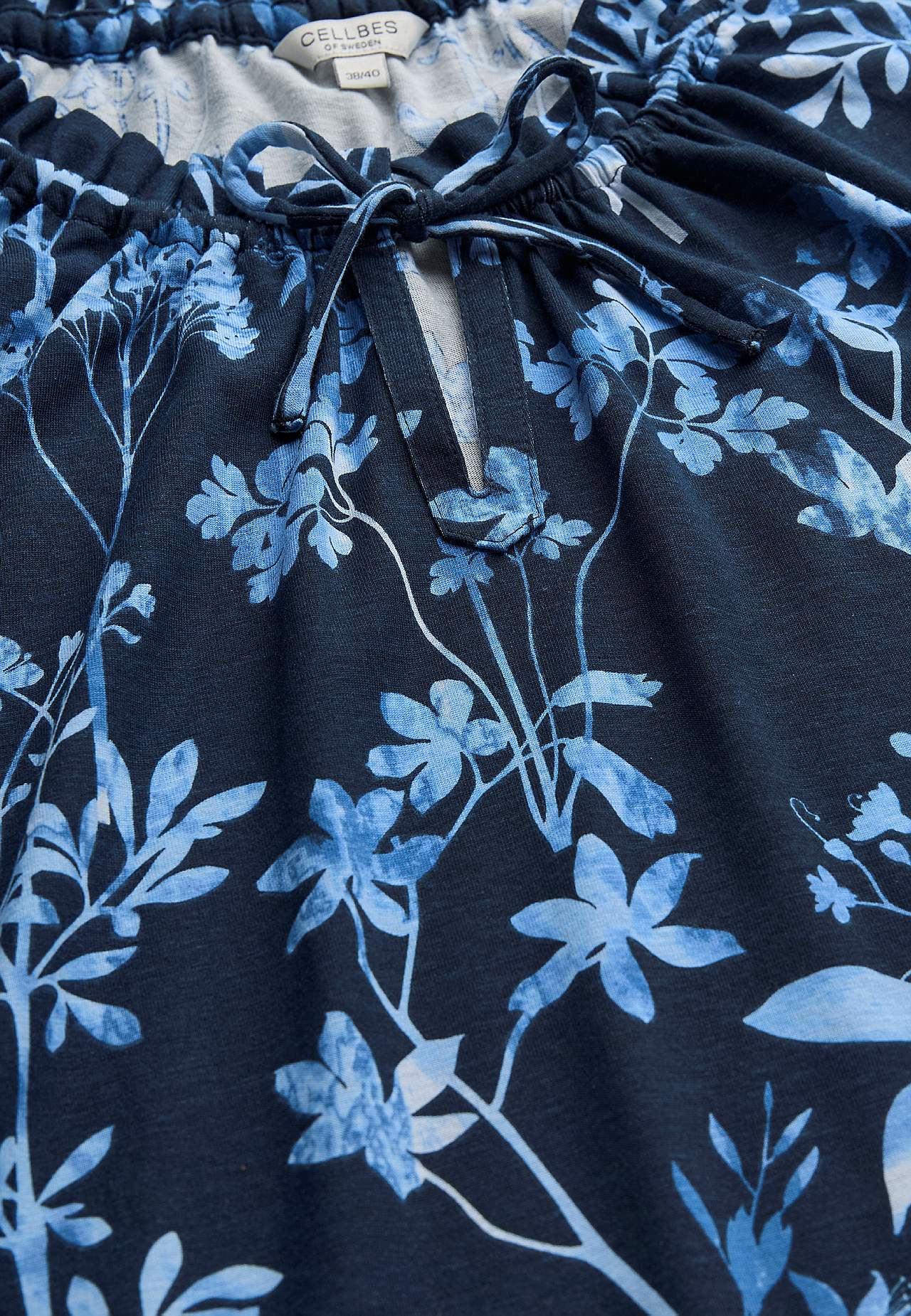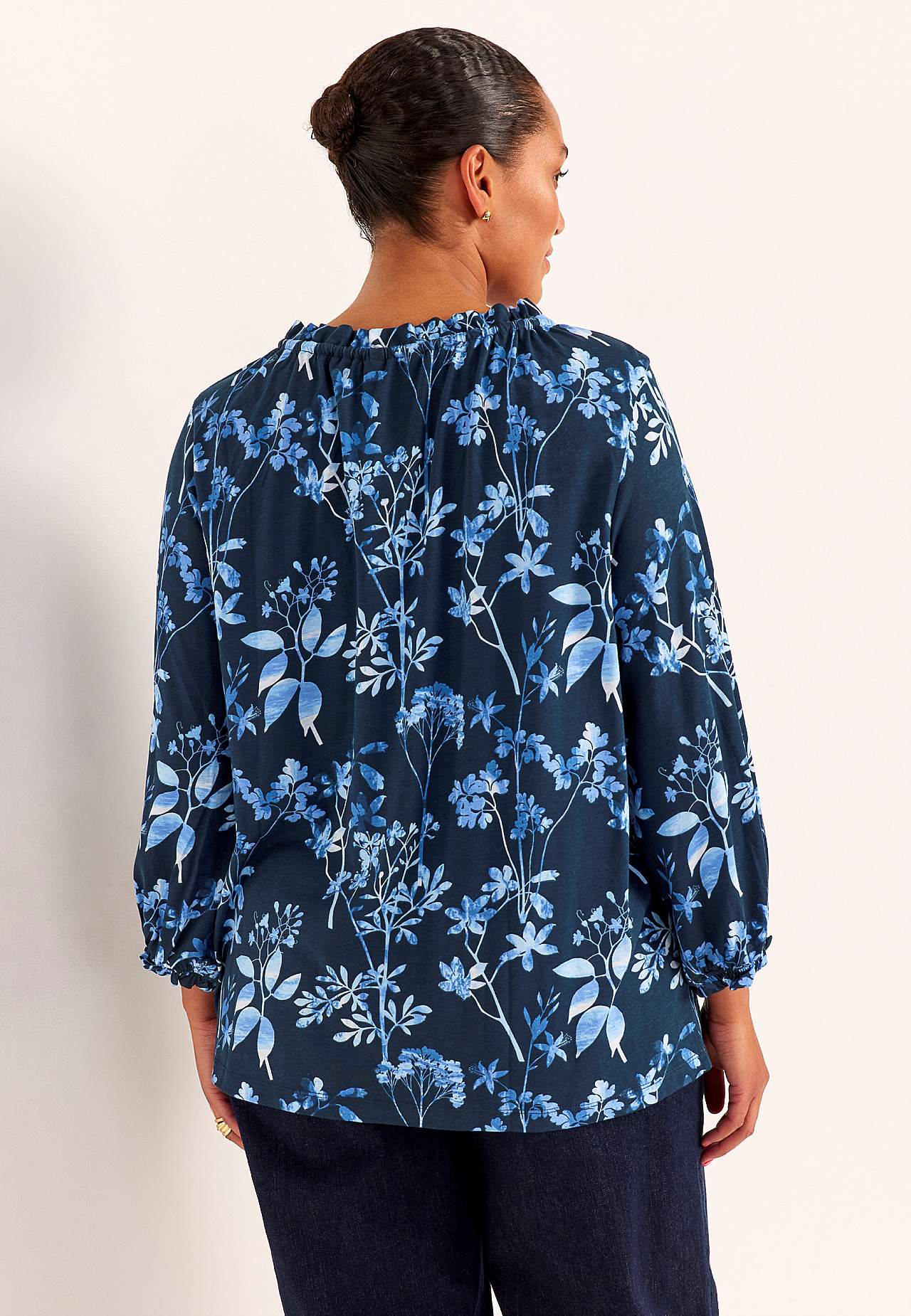 Feminine, loose fit. Rounded neck with self-tie drawstring and frill edge. 3/4 length, wide sleeves with elastic and small frill at the cuffs. The back length varies with size: approx. 62-74 cm cm.