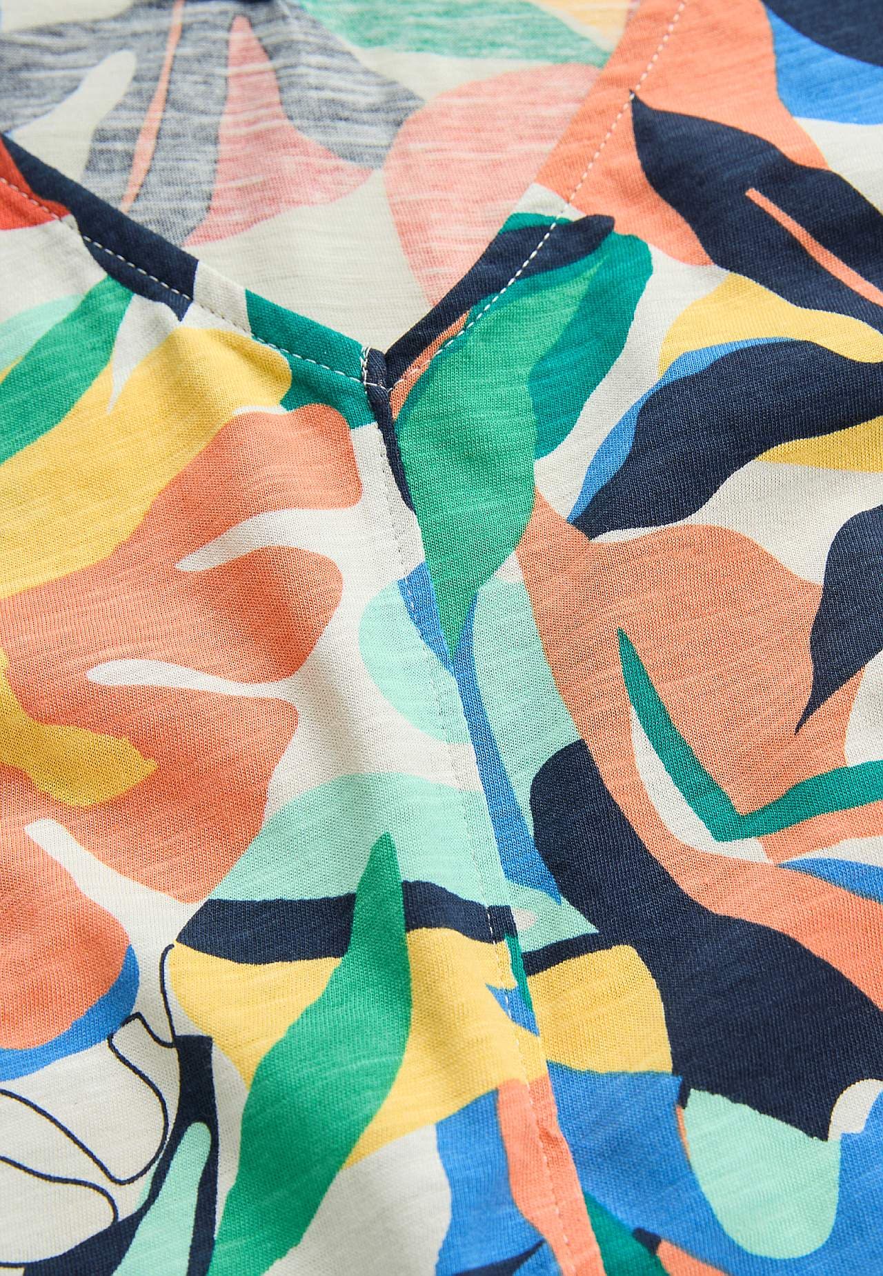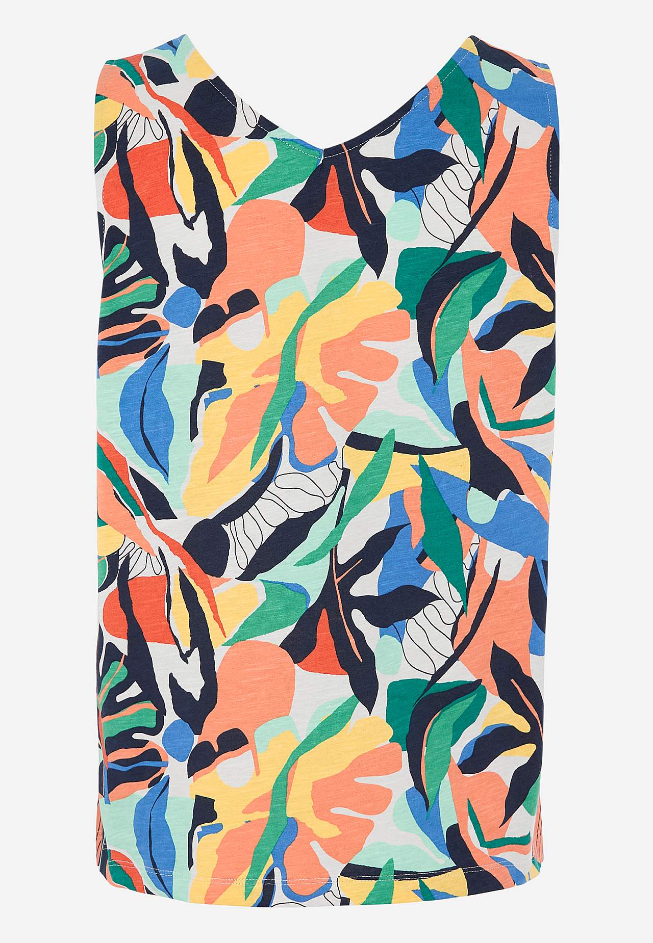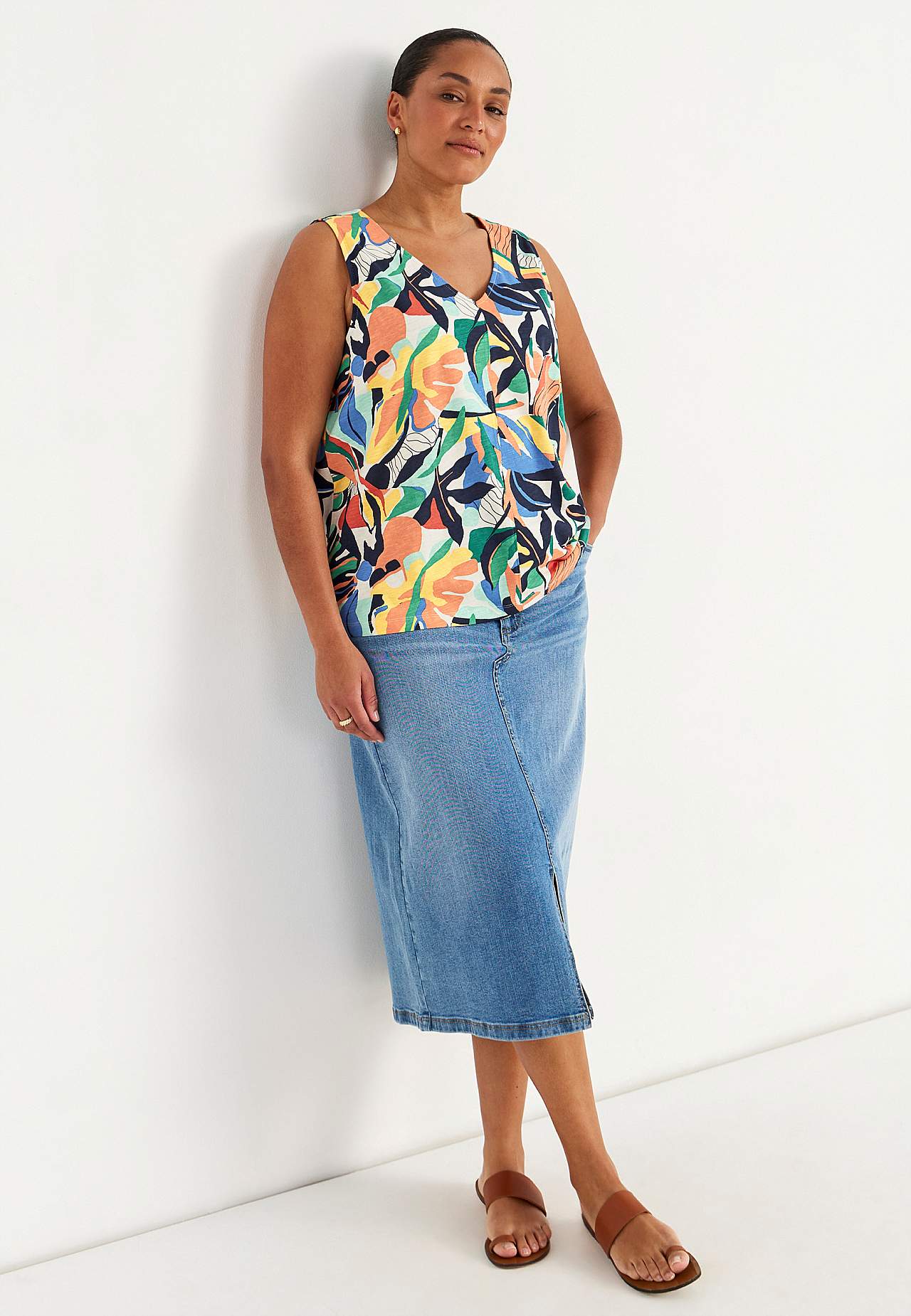 Airy slub quality with slight structure. Slightly a-line-shaped fit. V neckline at both front and back. Decorative stitch center front. The back length varies with size: approx. 60-72 cm.